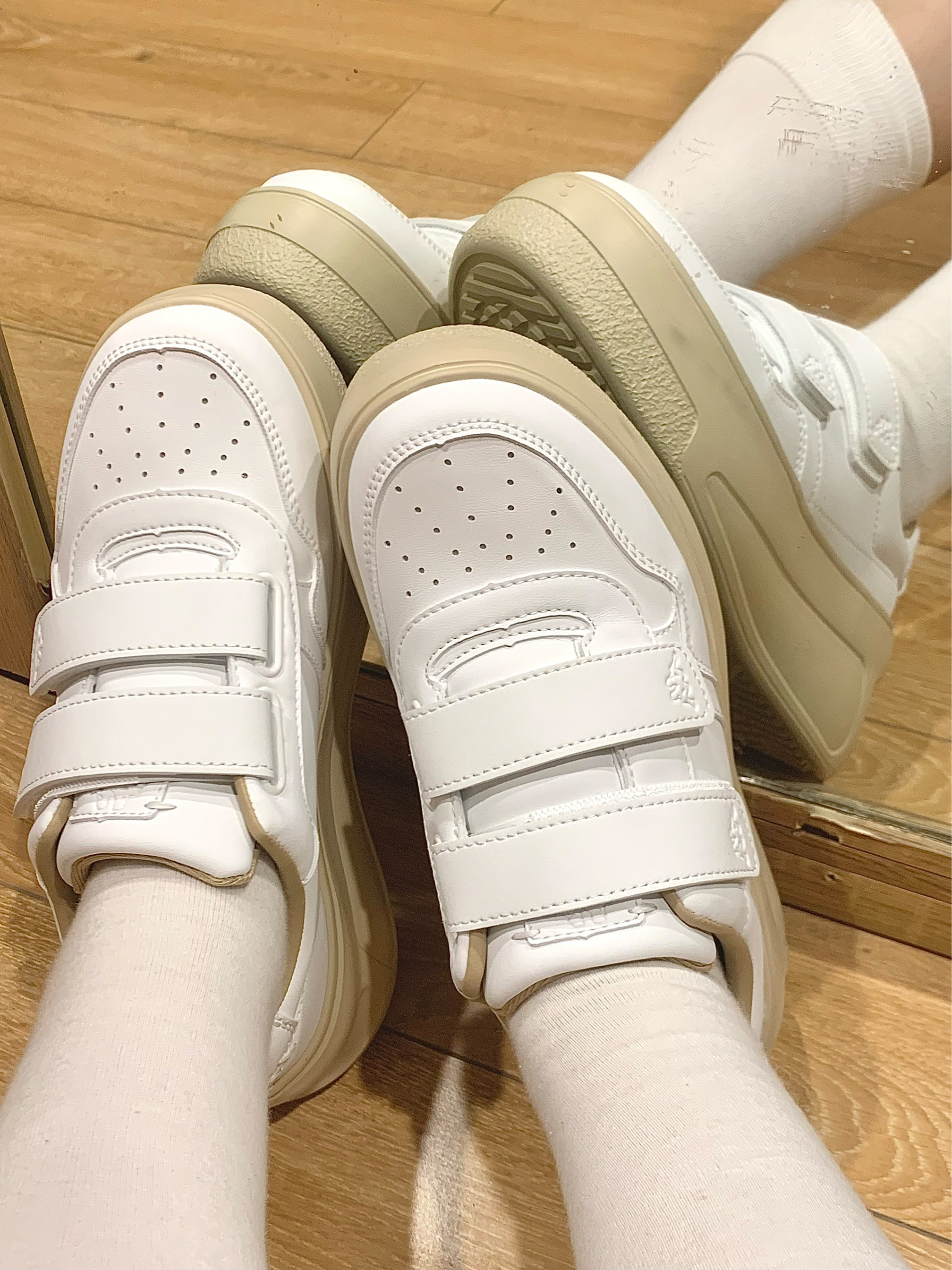 这双板鞋实在是有点可爱呢 魔术贴的很有样式 搭配休闲裤穿就很有feel~ 而旦增高的设计很显瘦 正好旱春穿着就蛮合适呀