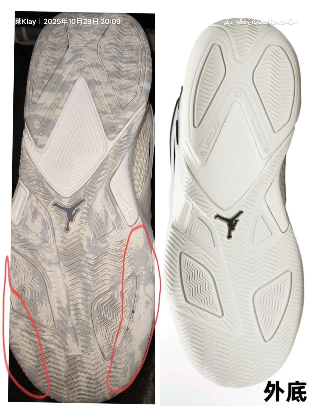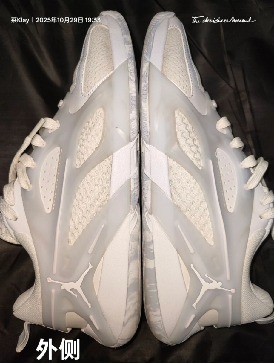 全掌人字纹橡胶外底抓地力出色,磨合后能实现快速启停与变向,干地表现可圈可点 。但存在明显的吸灰问题,外场灰尘较多时需频繁擦拭,否则会影响抓地。外底采用 XDR 耐磨橡胶,耐用性在中端鞋款中表现合格,适合外场实战需求,但在边缘处的纹路很薄,不太耐磨。