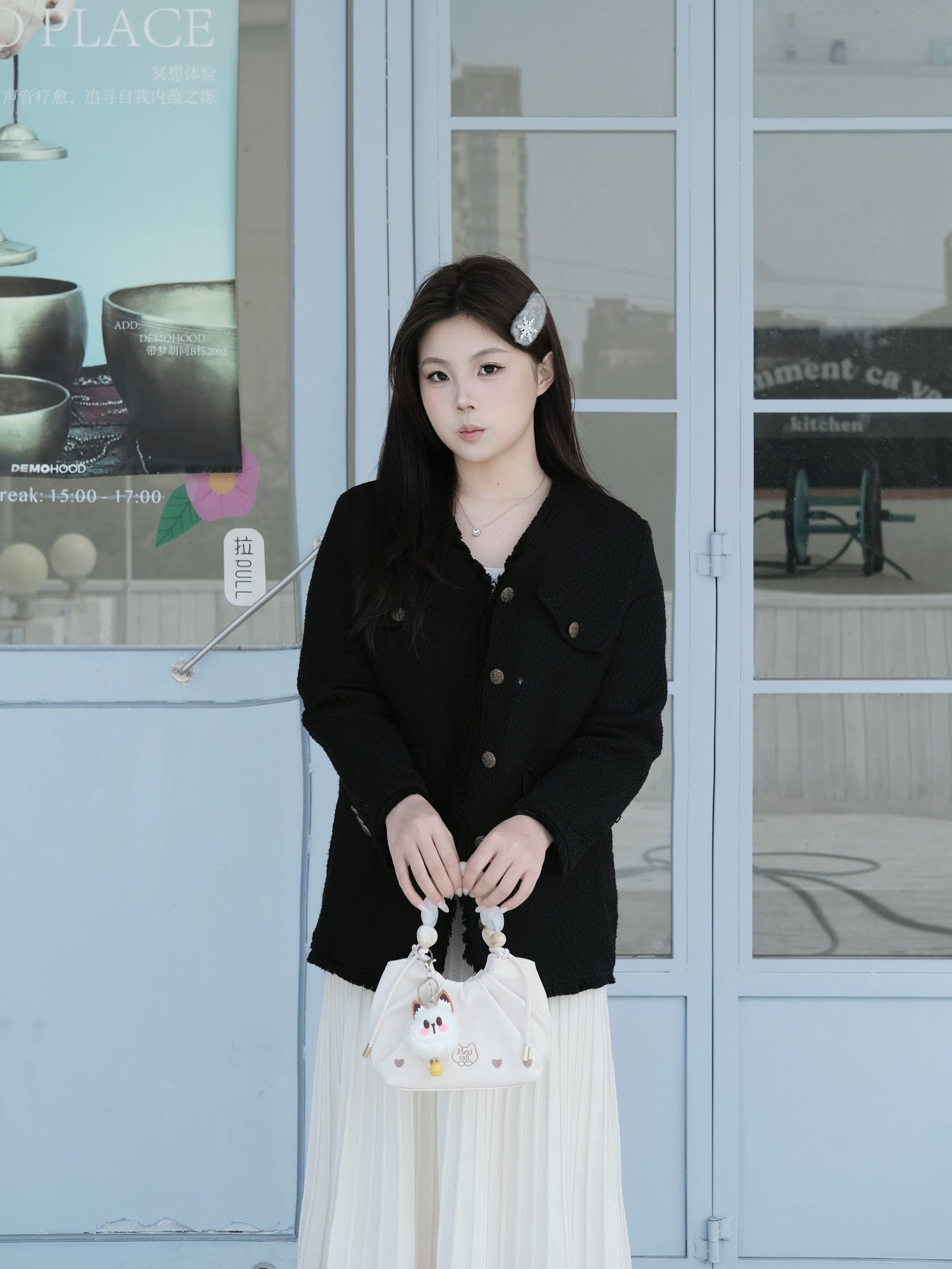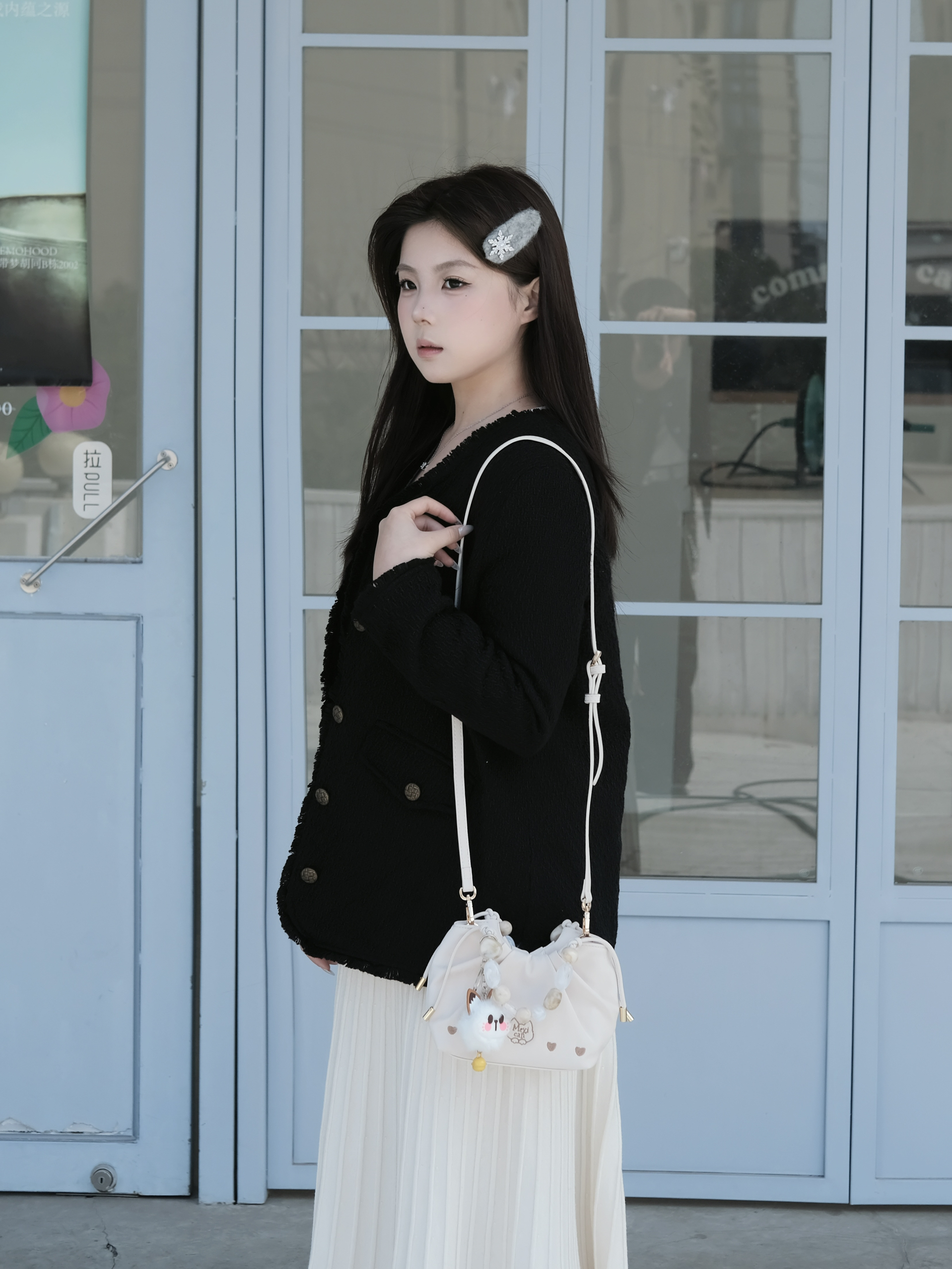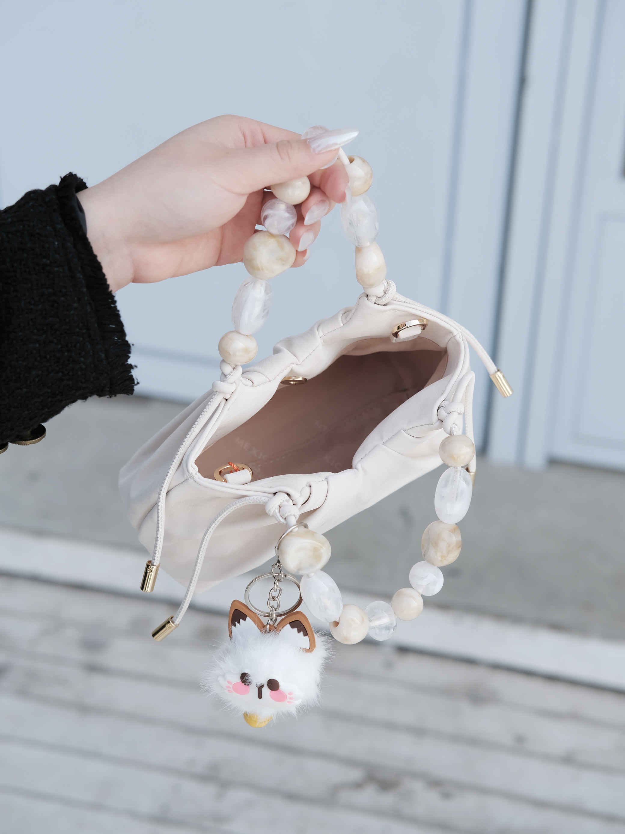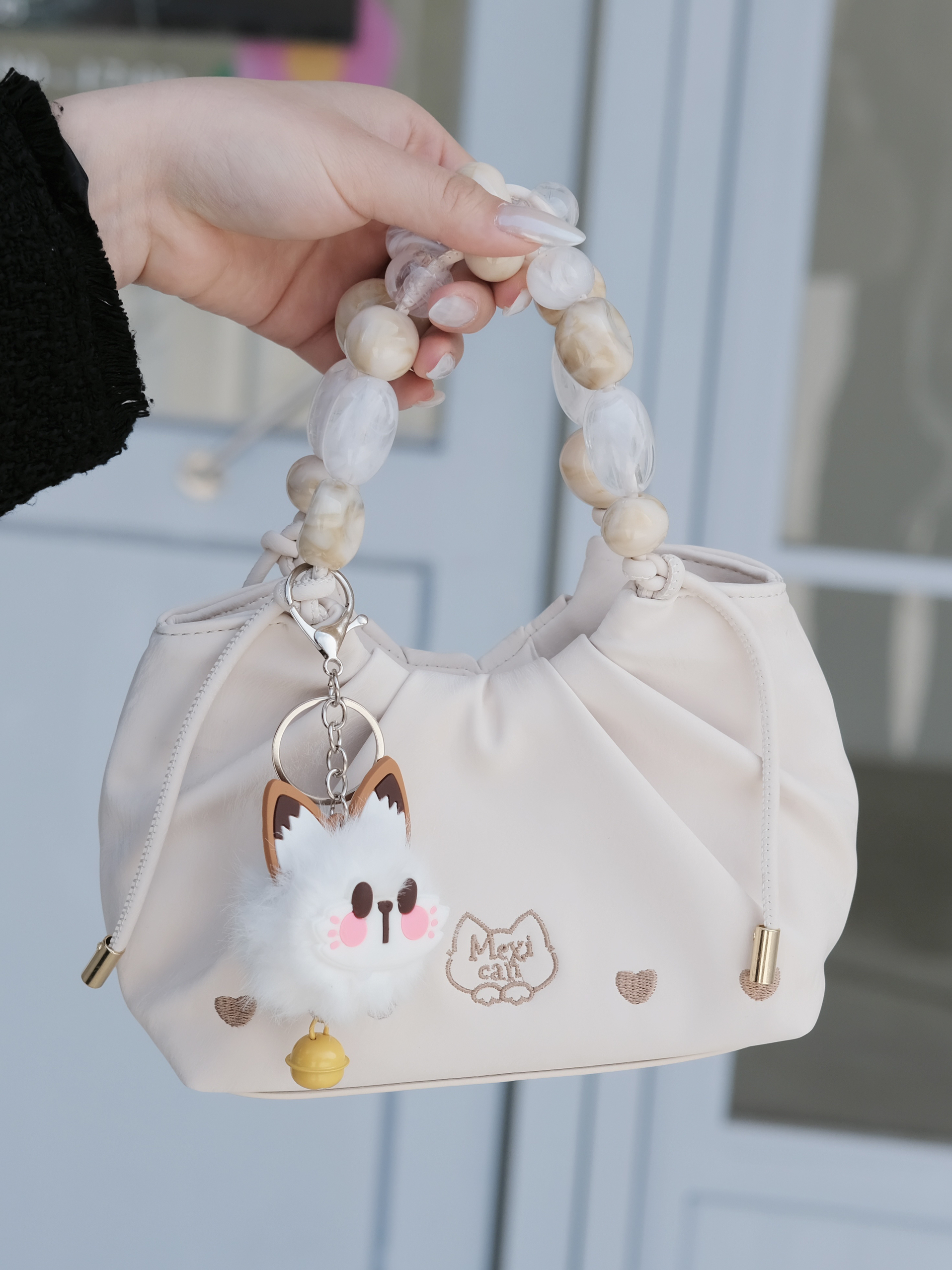 小香风➕云朵包好温柔 包包挺小巧的 手提处是串珠设计 搭配一个猫猫挂件很可爱 内里容量出门也够用 放得下手机粉饼口红 还有多种背法 手提单肩斜挎都可以