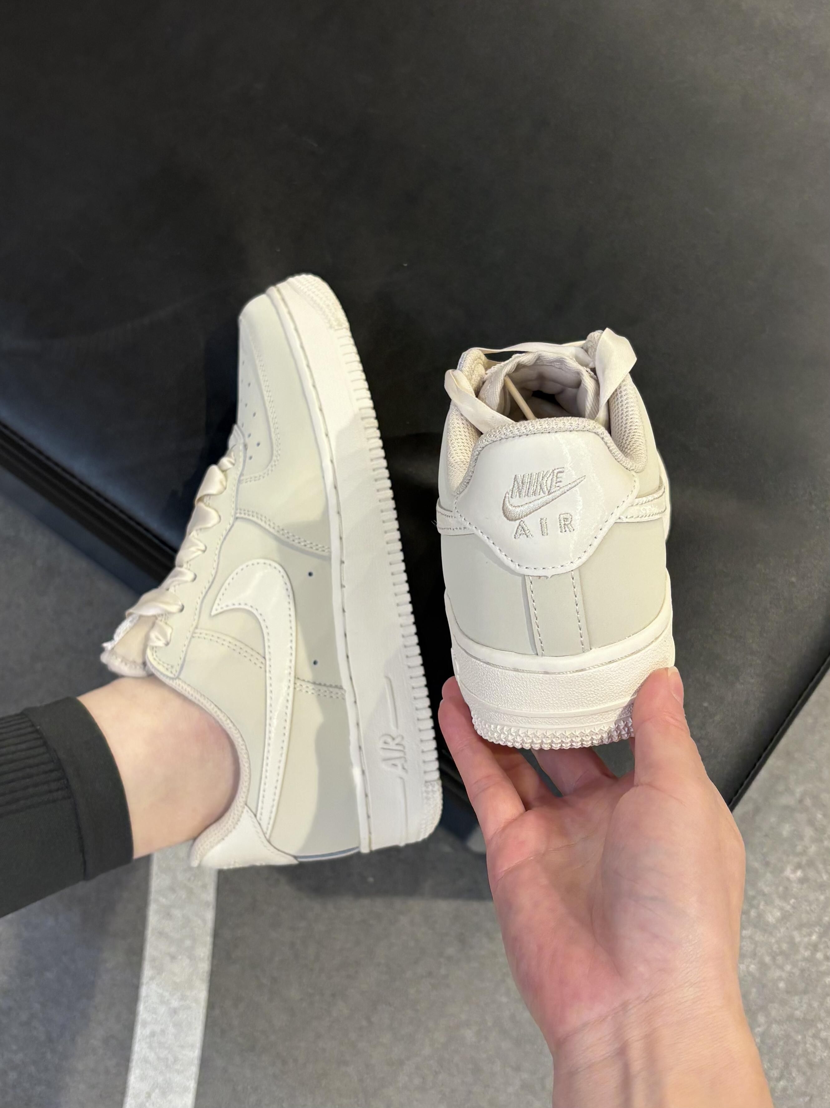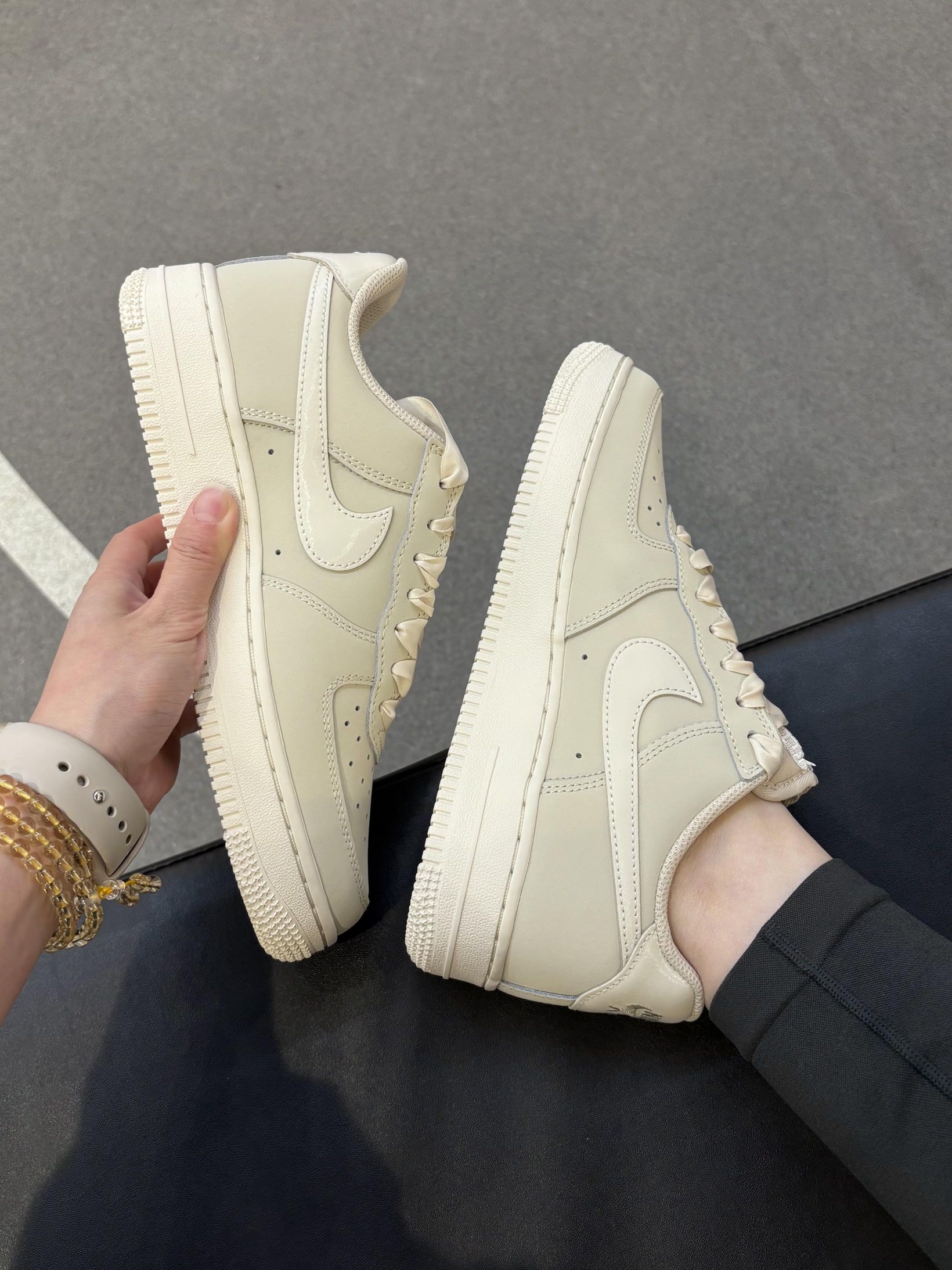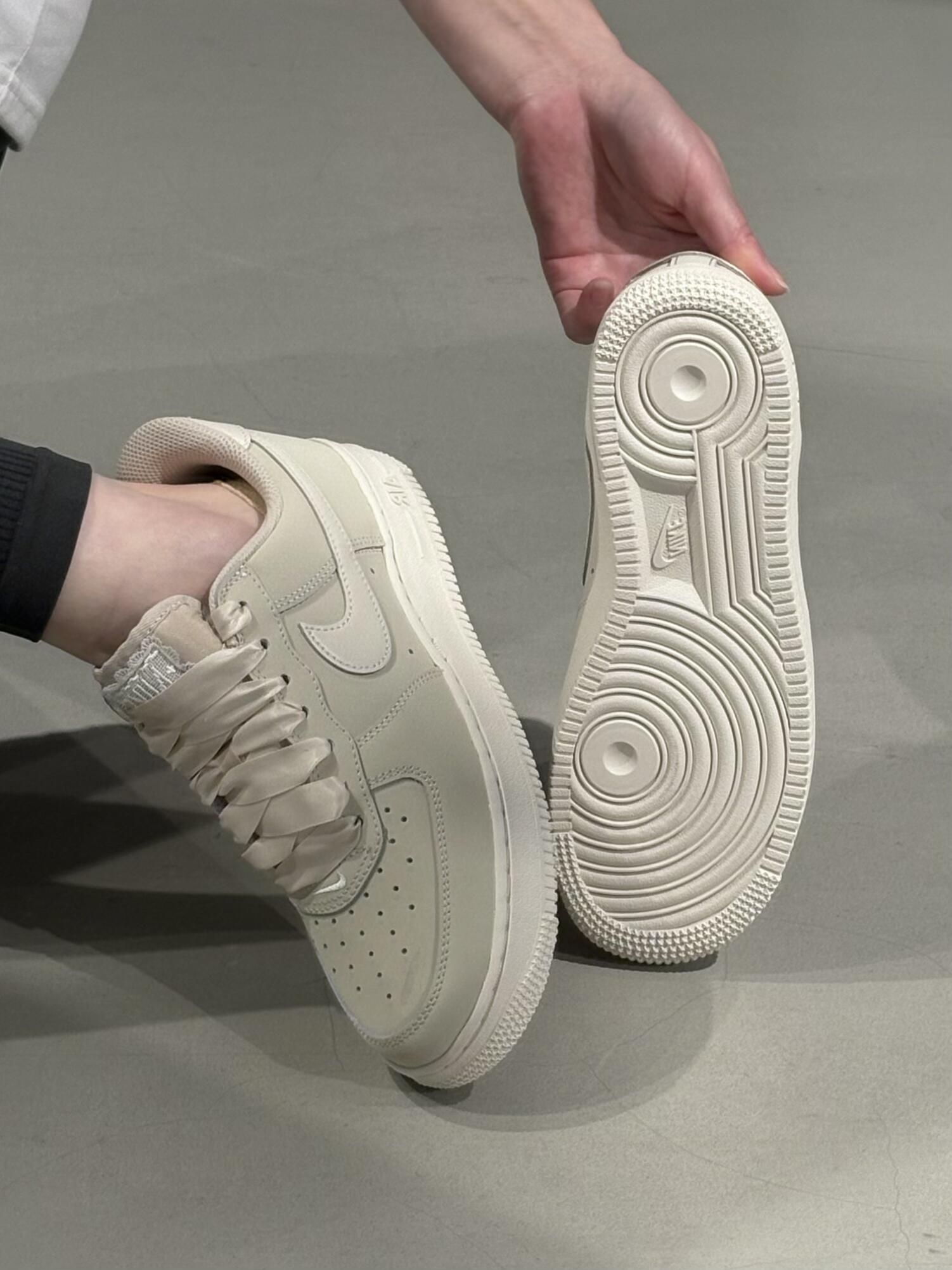这双奶杏色Air Force 1直接把温柔焊在脚上了! 比纯白更显气质的低饱和奶米色,自带柔光滤镜, 上脚显白又干净,通勤/约会/上课都能穿~ 缎面鞋带自带光泽感,随便系个蝴蝶结都甜到冒泡 鞋舌精致蕾丝边,细节控狂喜,低调又有小心机 真的戳中了我的心巴💖