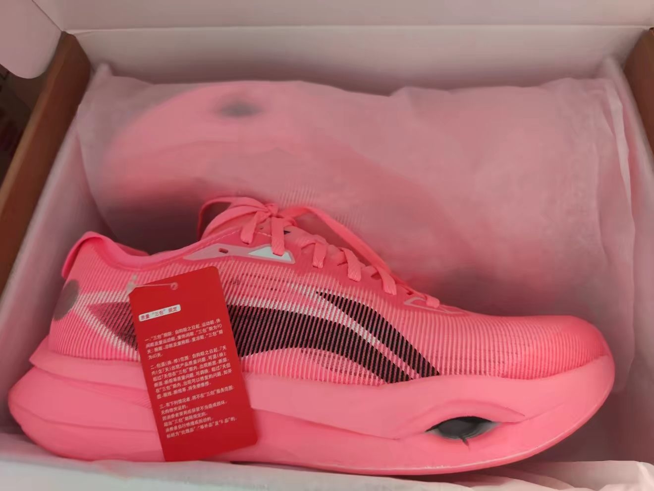鞋盒延续李宁简约设计,印有跑道线条和“ANYTHING IS POSSIBLE”标语,拆开就是裹着防尘纸的跑鞋,粉白渐变鞋面搭配黑色李宁大Logo,侧边条纹纹理超有质感✨。花梳材料大网孔鞋面肉眼可见的透气,搭配轻量化鞋身,单只42码仅220g,拿在手里轻到像没重量,夏天穿完全不闷脚,颜值和实用性直接拉满!