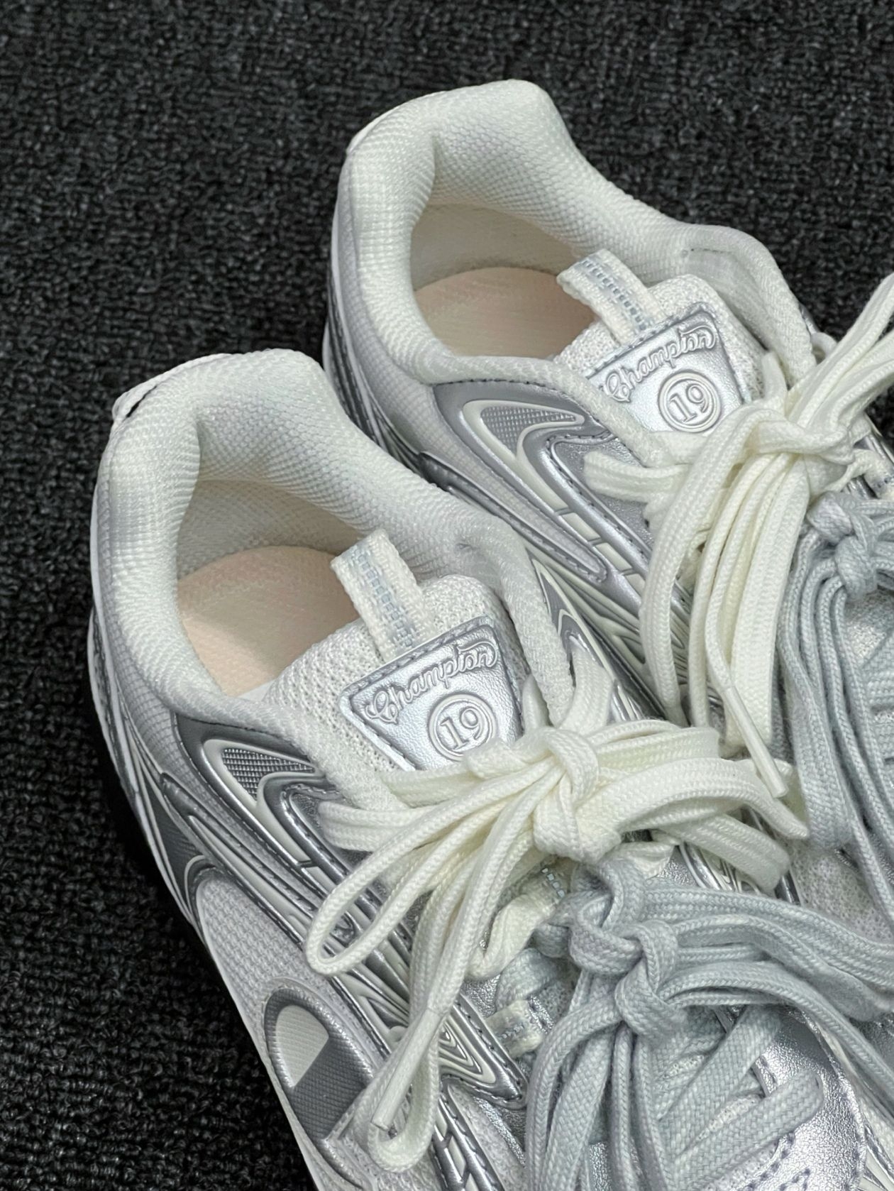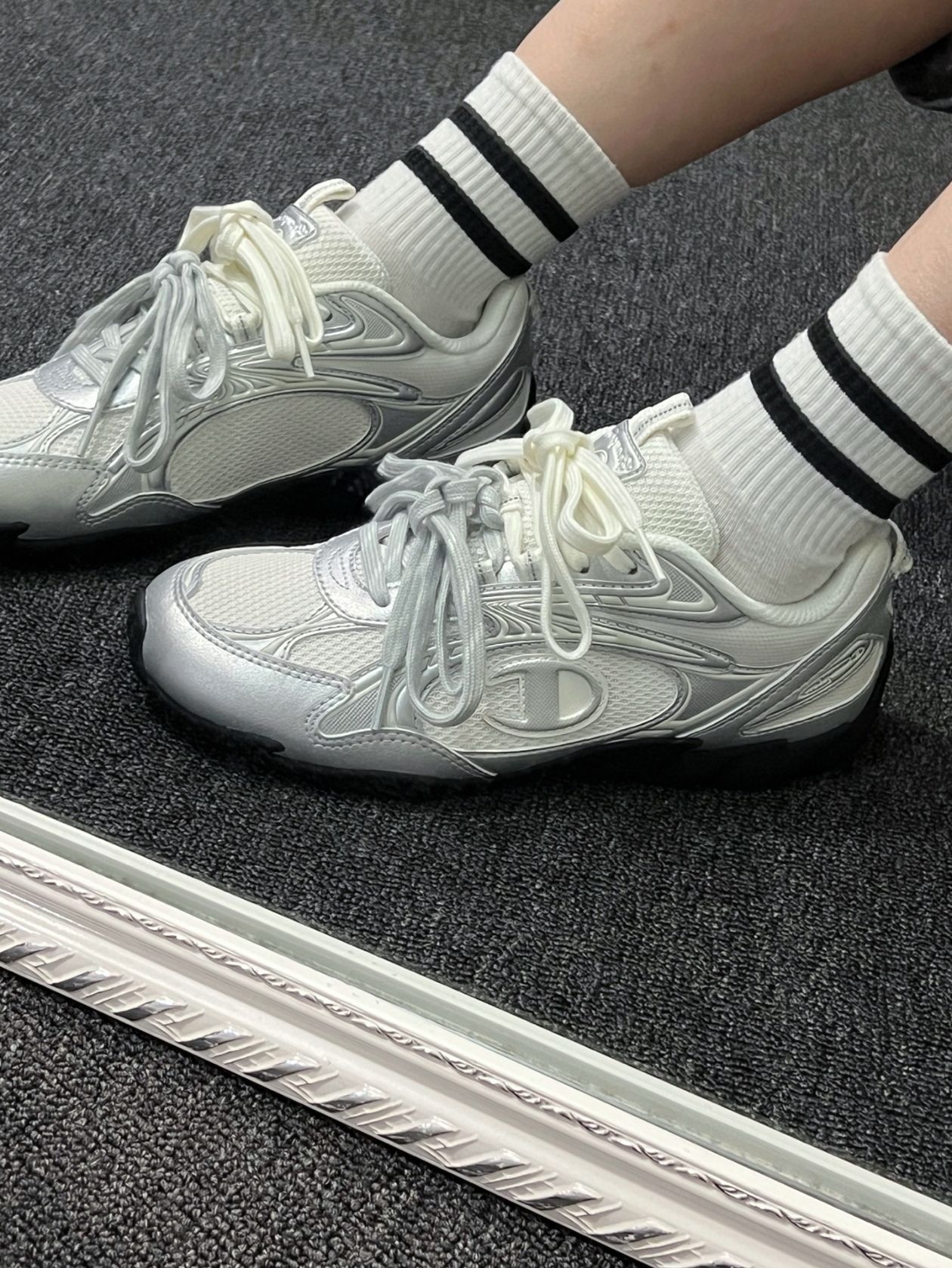 ✨CHAMPION羽翼薄底德训鞋,银白配色+黑色橡胶鞋底,简约又有设计感!鞋面网孔透气,蕾丝鞋带超有细节,轻盈薄底+后跟EVA软垫,穿着舒适不累脚👟。日常通勤、逛街、运动都能轻松驾驭,牛仔裤、裙装随意搭配,复古韩系风满满,时尚又实用,是潮流穿搭必备单品!💫