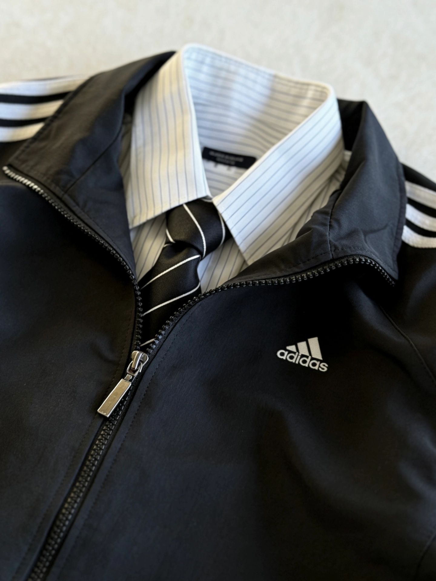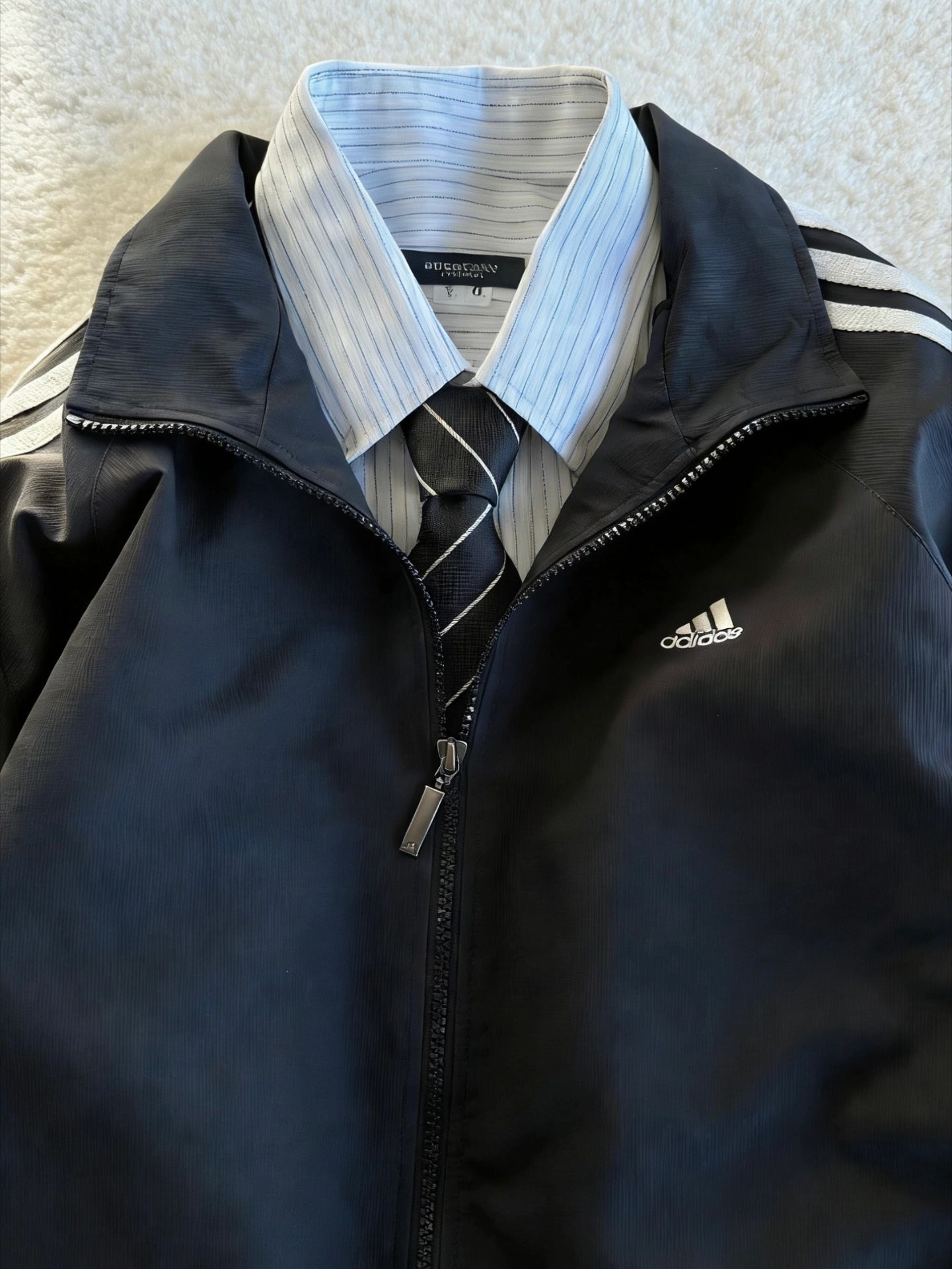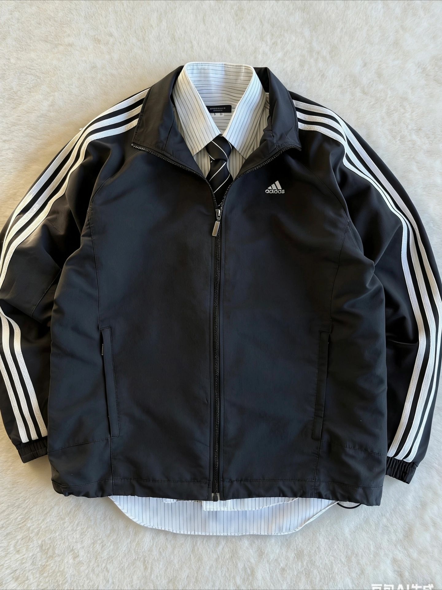 三条杠+衬衫,普通人的穿搭教科书|||这件外套真的太好穿了,面料摸起来很舒服,防风效果也实用。里面叠穿一件条纹衬衫打个领带,那种复古学院风立马就有了,完全不觉得老气。版型做得够宽大,身上有点肉也能遮得很好,看着就很随意放松。平时上班路上或者去楼下便利店穿它,简单又有型,不用费心思搭配就能出门。 #今日份穿搭 #秋冬百搭学院风外套穿搭 #夹克阿迪达斯 #学院风日常穿搭 #阿迪达斯复古外套