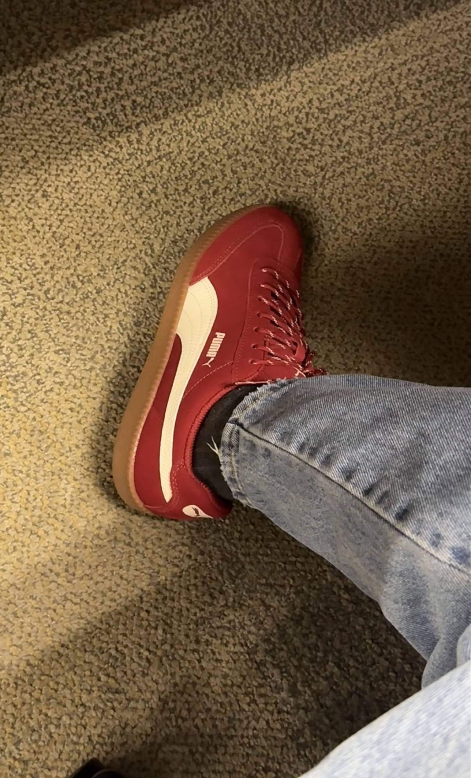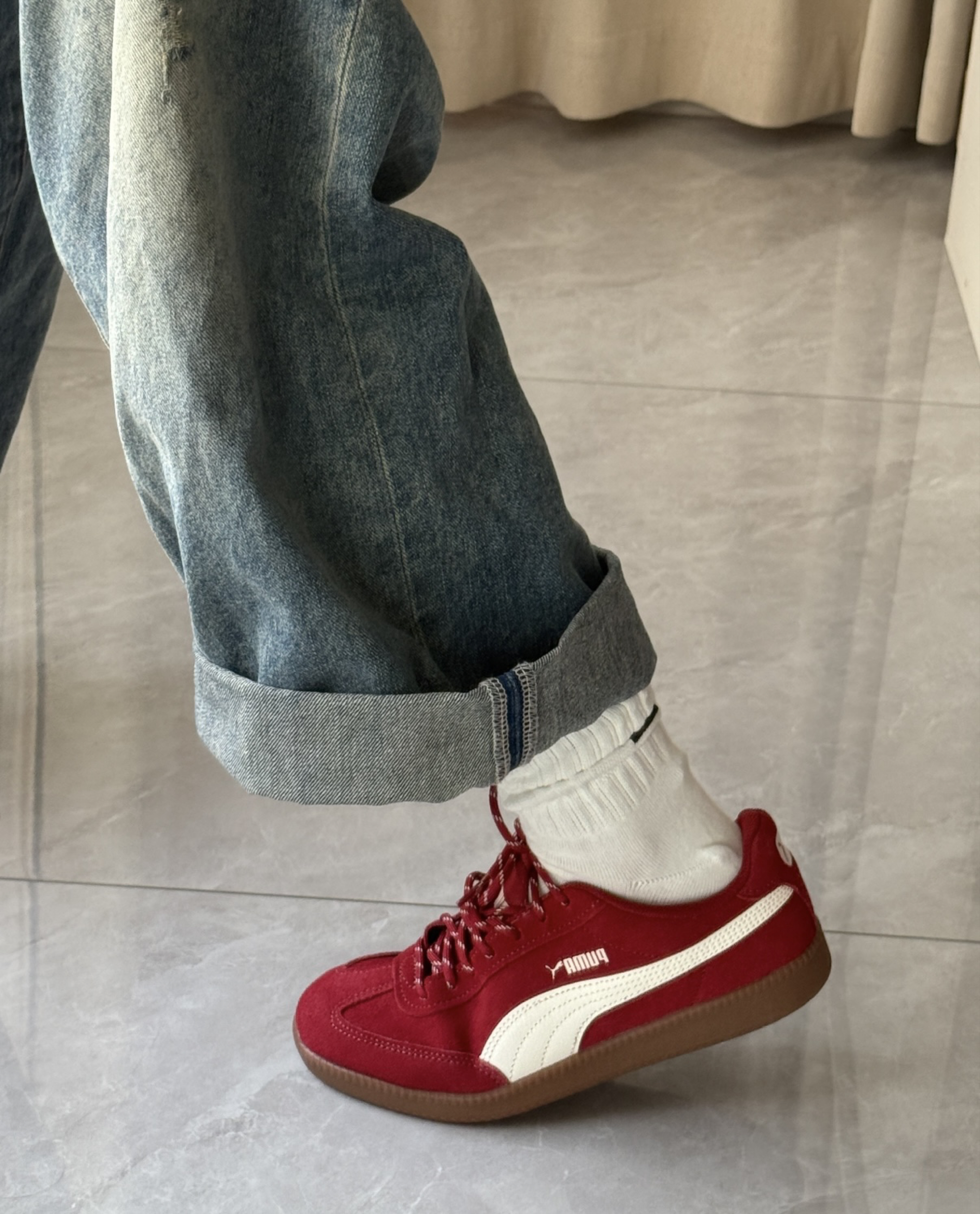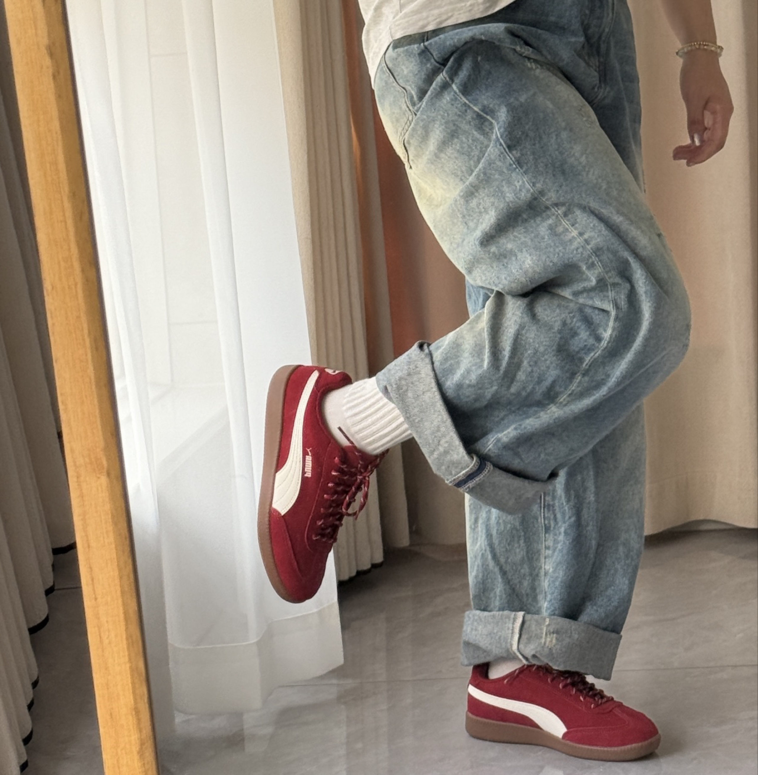最近天天穿这双红鞋子出门,配牛仔裤卷个裤脚真的绝了,复古感直接拉满。 麂皮摸着软乎乎的,鞋底也不硬,逛一天街脚都不疼。 之前怕红色显脚黑,上脚才发现巨显白,黄皮姐妹也能冲,百搭又耐看,日常通勤、约会都能穿。