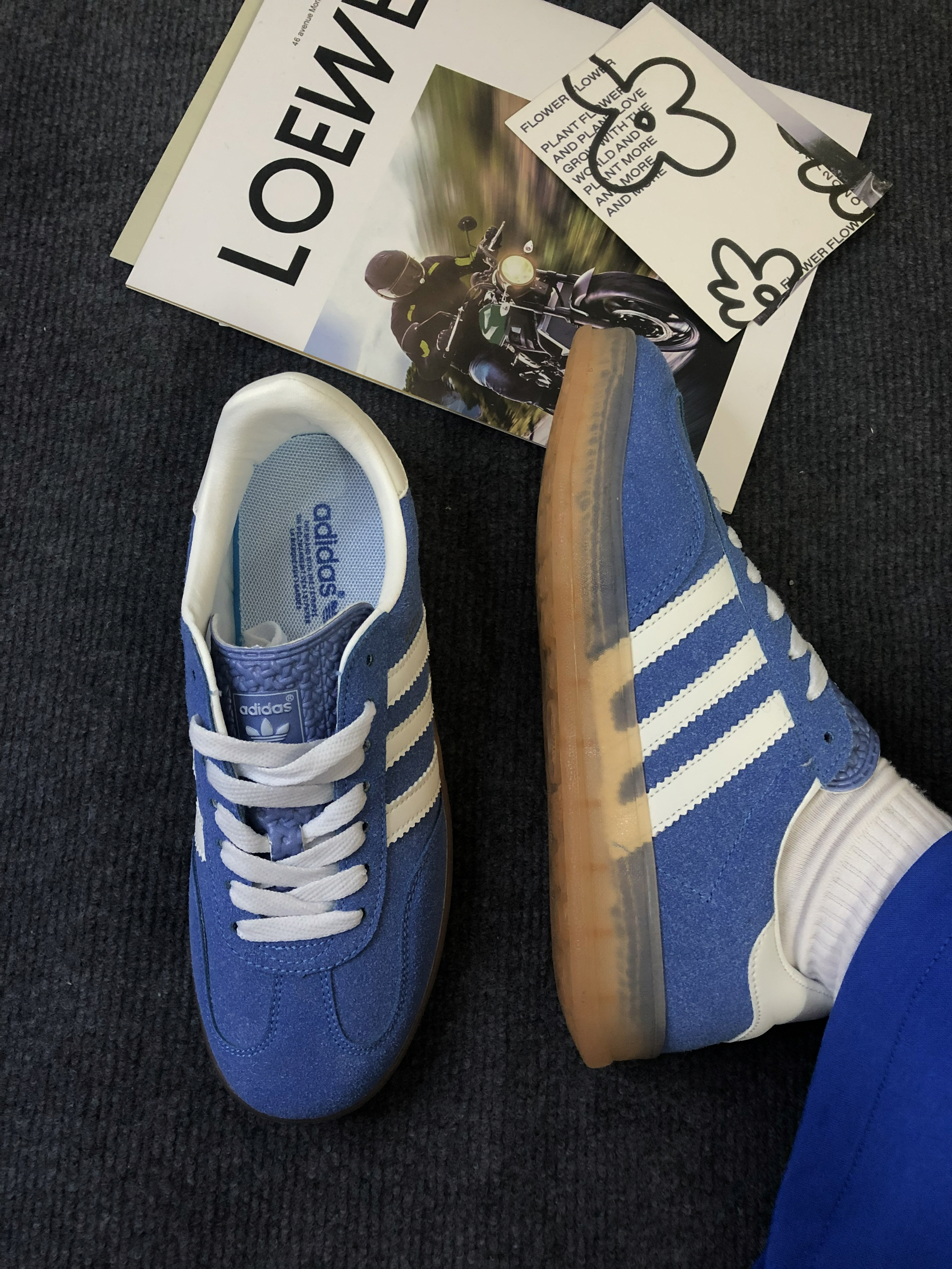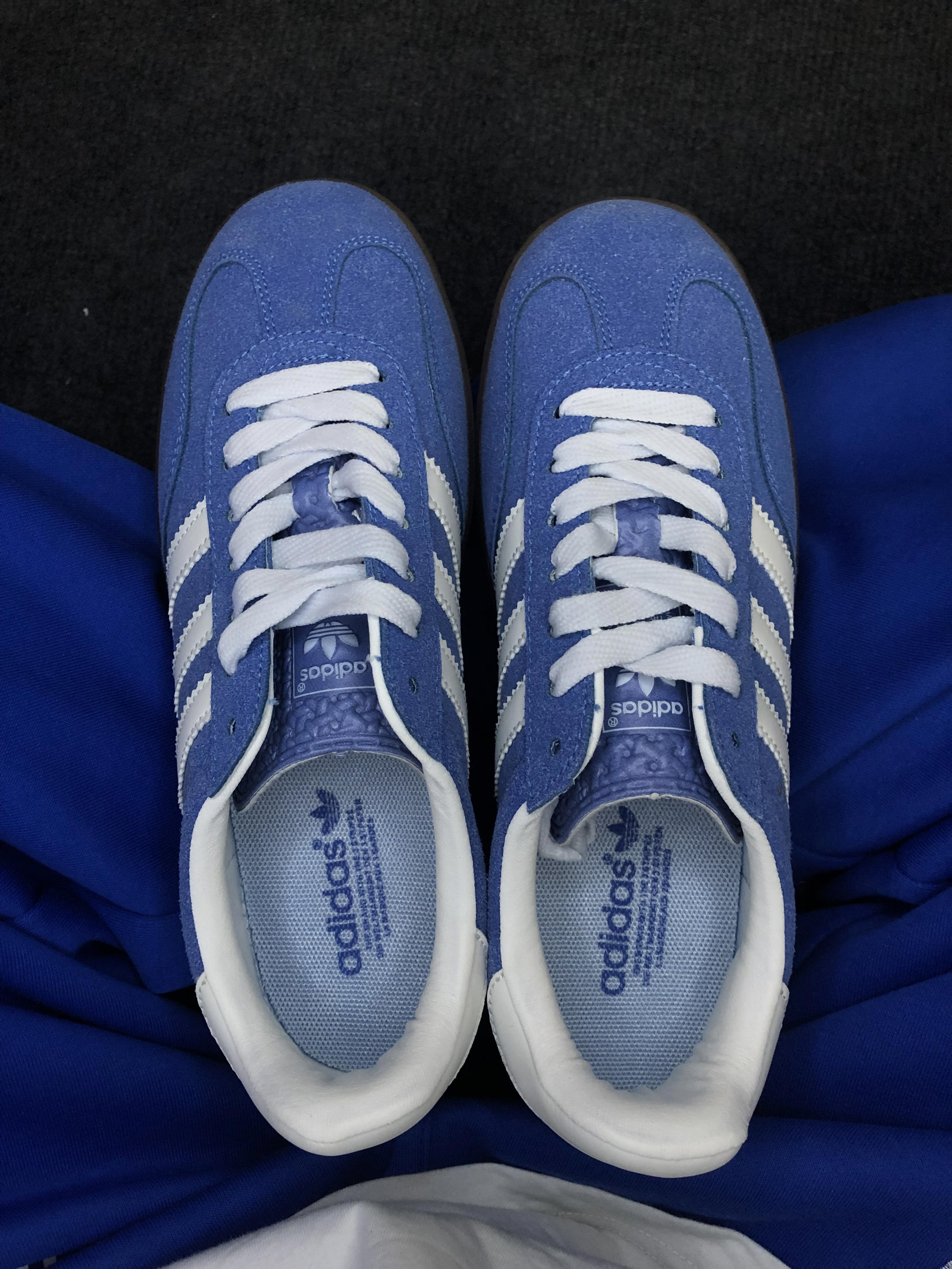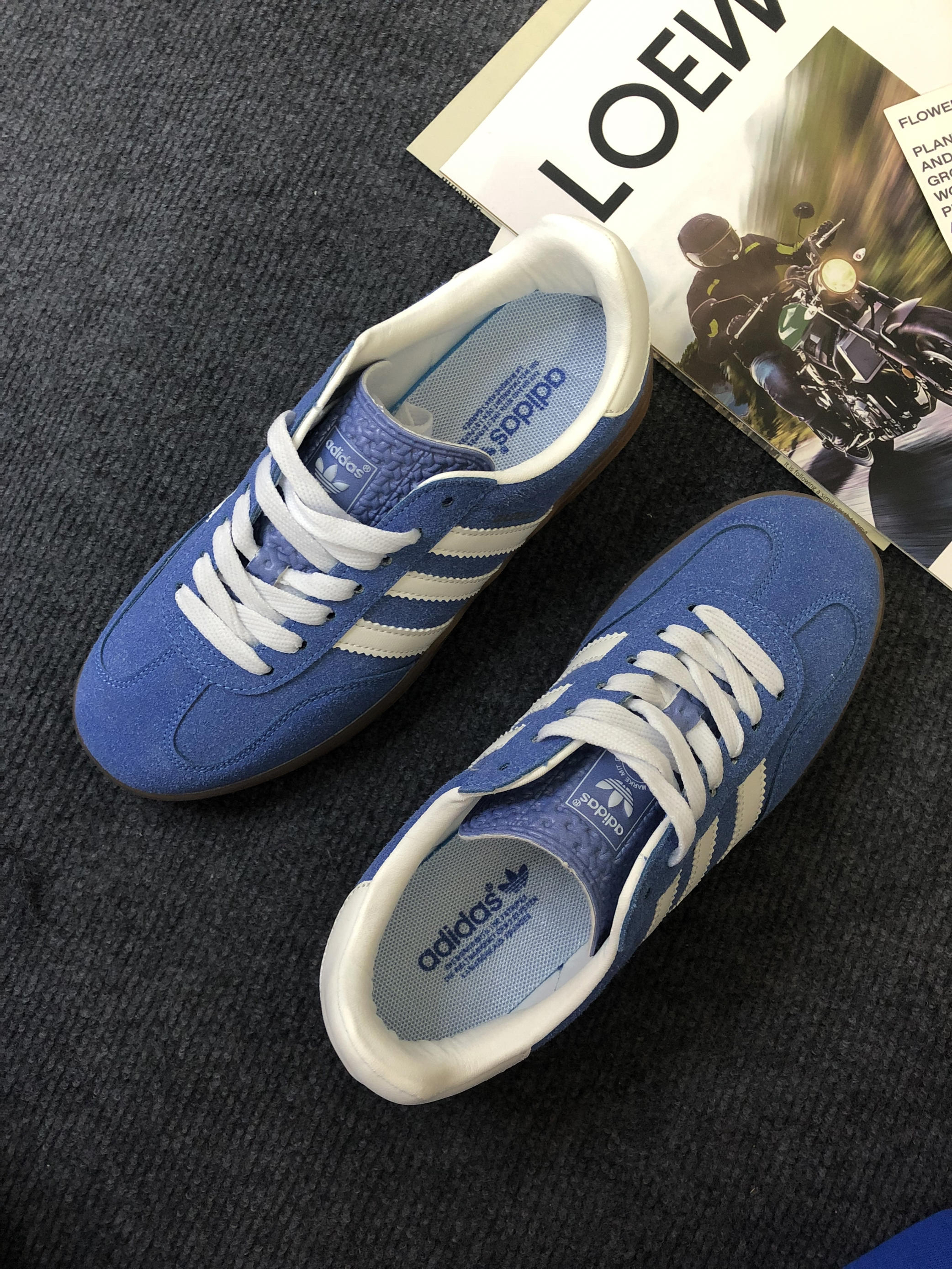 adidas Gazelle 复古德训鞋,经典的蓝白配色+麂皮材质,自带复古运动氛围 脚感体验:麂皮材质柔软不磨脚,生胶底防滑又耐磨,日常通勤、逛街暴走都毫无压力,舒适度满分💯 搭配万能:蓝白配色太干净了!搭同色系运动裤是清爽少年感,配牛仔阔腿裤又秒变复古街头风,一年四季都能穿,实用性拉满。
