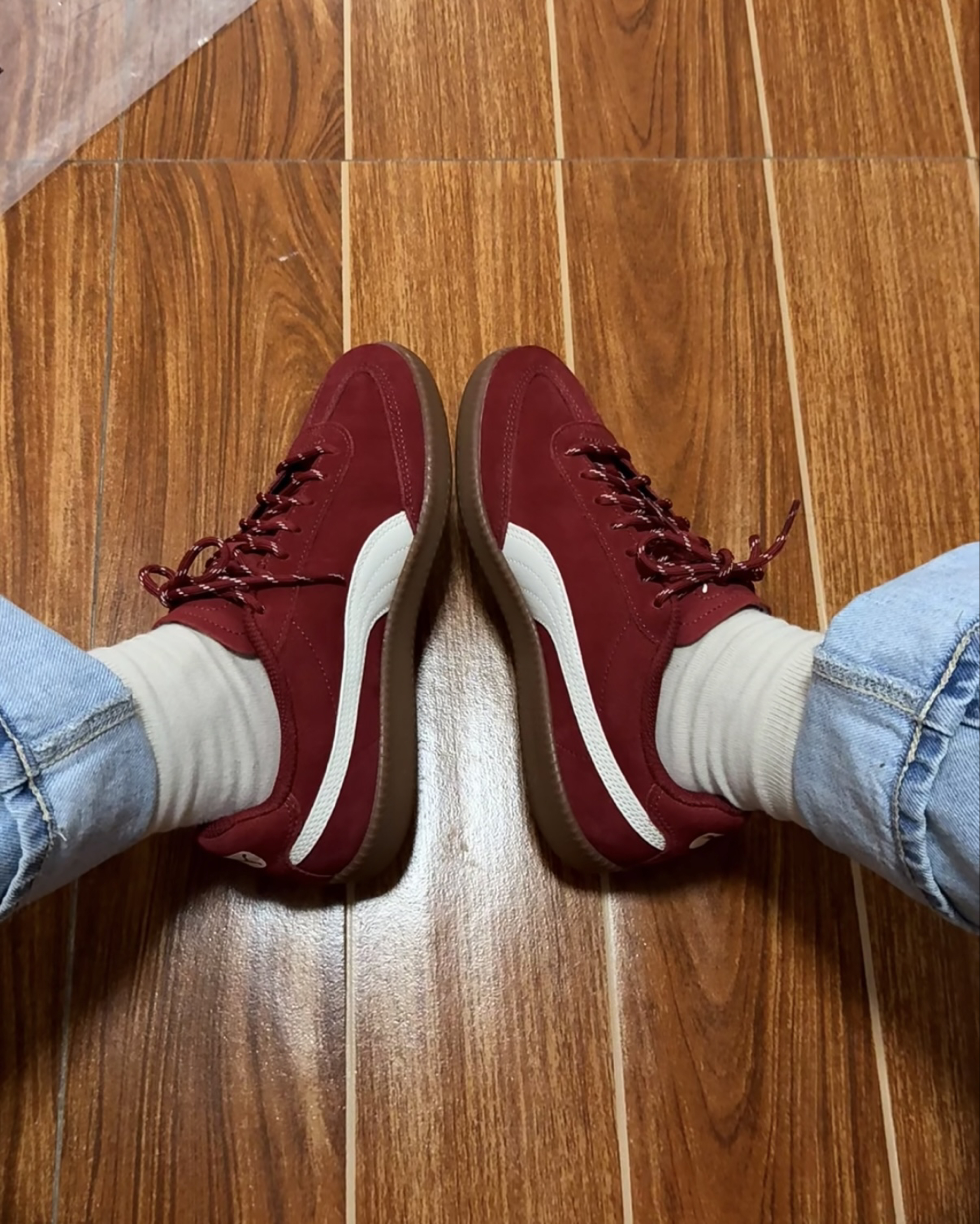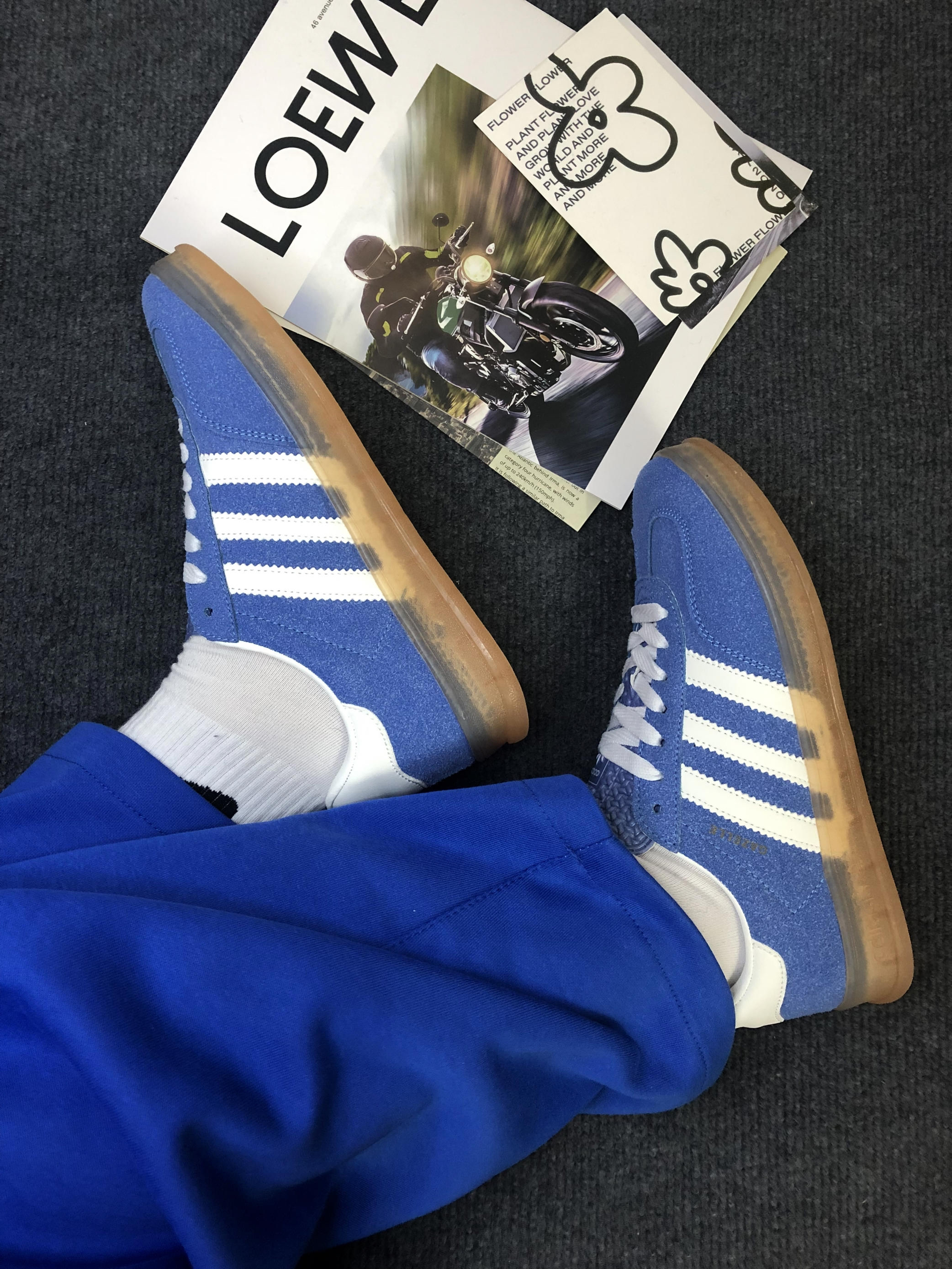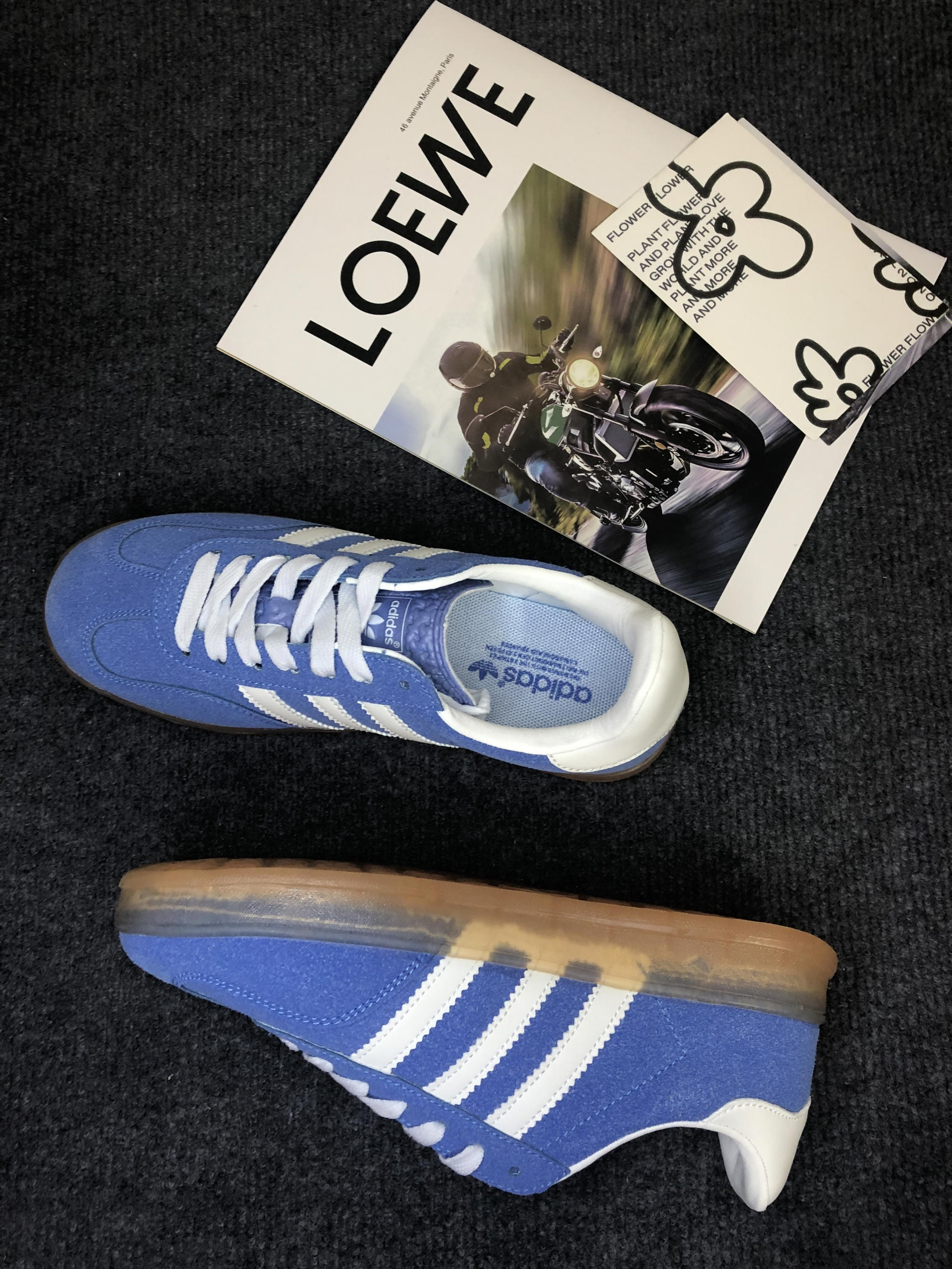 adidas Gazelle 复古德训鞋,经典的蓝白配色+麂皮材质,自带复古运动氛围 脚感体验:麂皮材质柔软不磨脚,生胶底防滑又耐磨,日常通勤、逛街暴走都毫无压力,舒适度满分💯 搭配万能:蓝白配色太干净了!搭同色系运动裤是清爽少年感,配牛仔阔腿裤又秒变复古街头风,一年四季都能穿,实用性拉满。