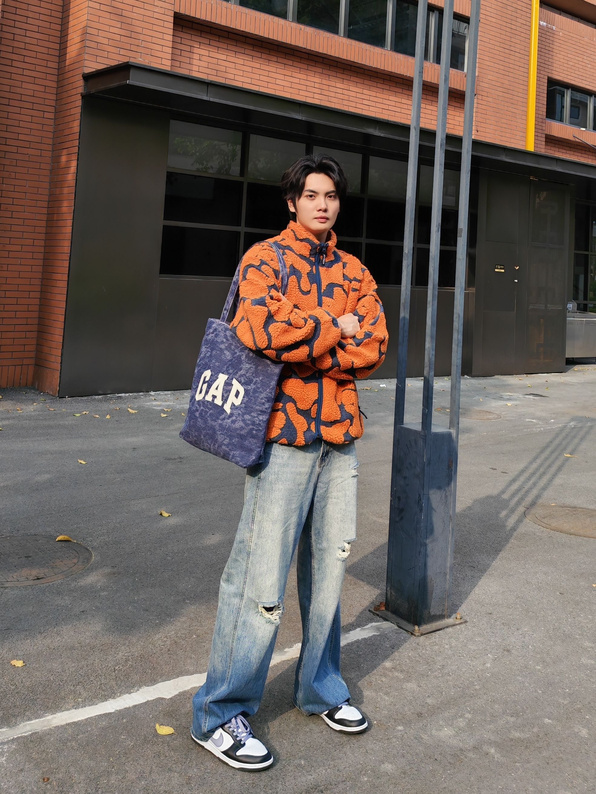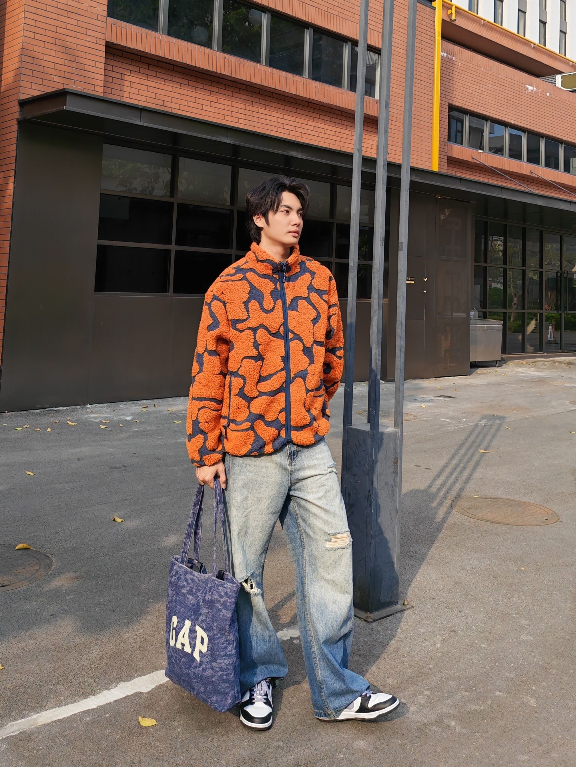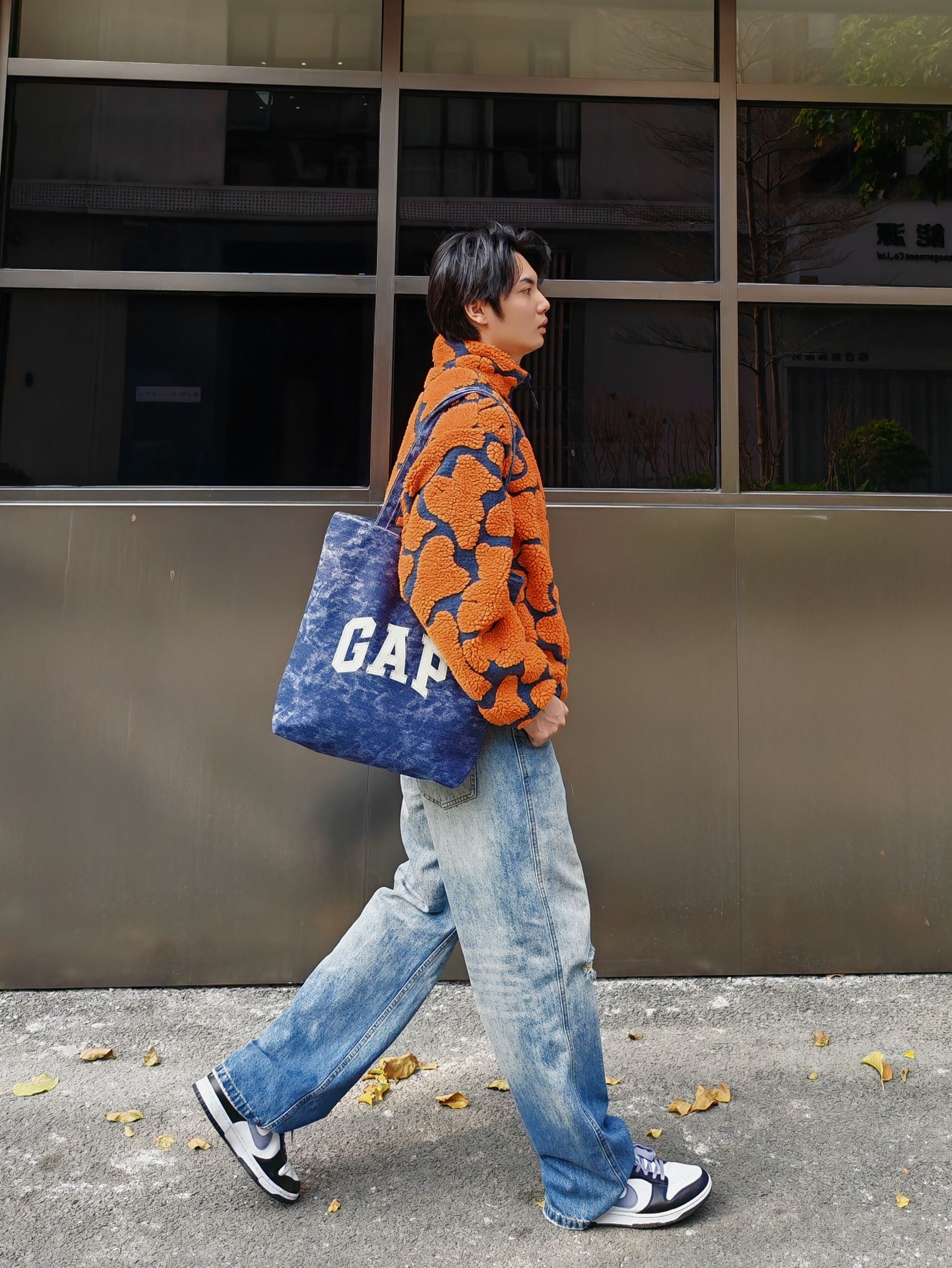 hi 这里是镭子的出街穿搭分享 橘色羊羔毛外套真的太吸睛!不规则花纹自带复古滤镜,软糯又保暖。 搭配做旧破洞牛仔裤,随性又有层次感。 脚上的dunk鞋和GAP托特单肩包,让整套look更有街头感。 185的身高撑起来完全不压个子,随便站在街角都很出片~