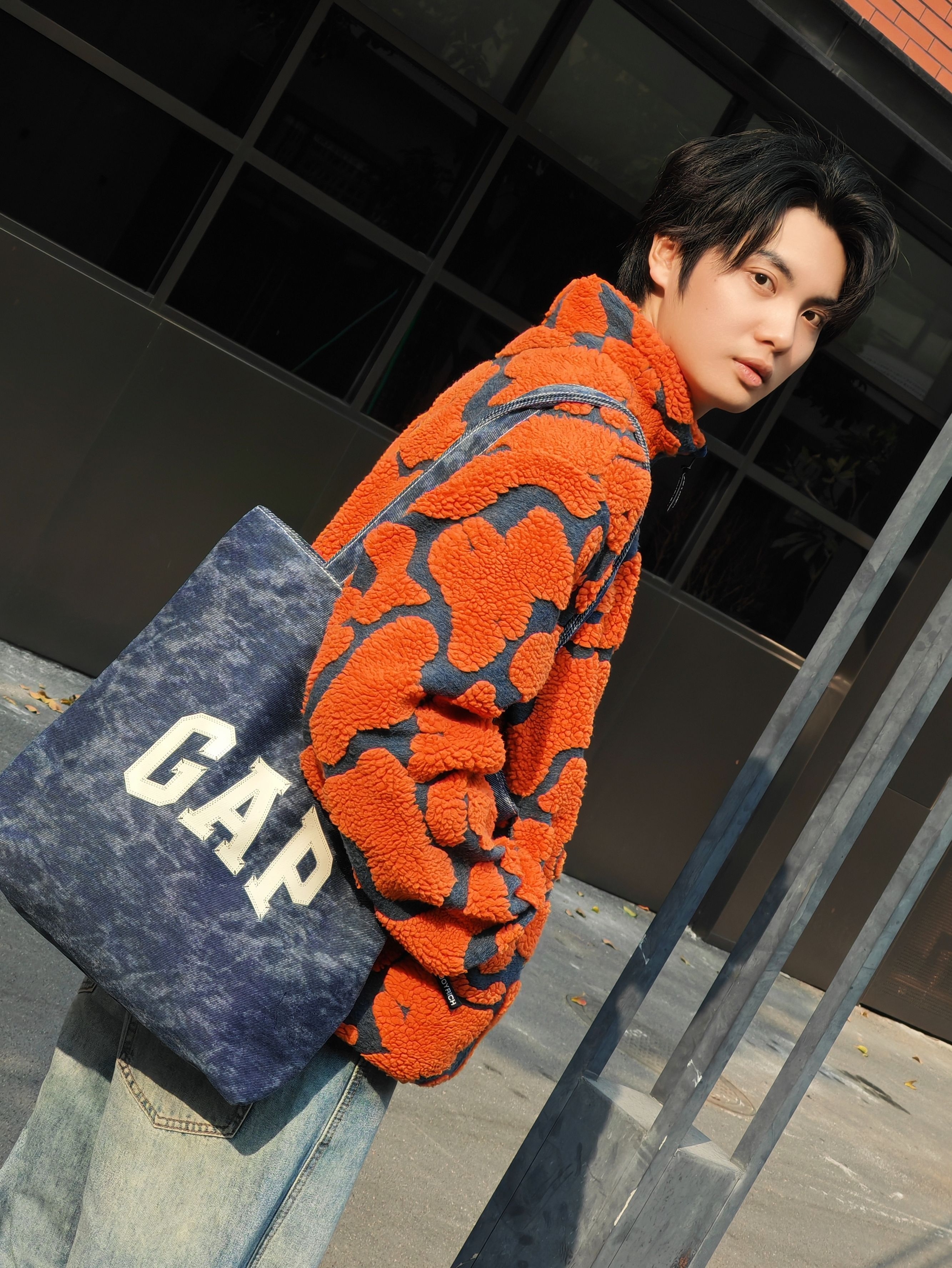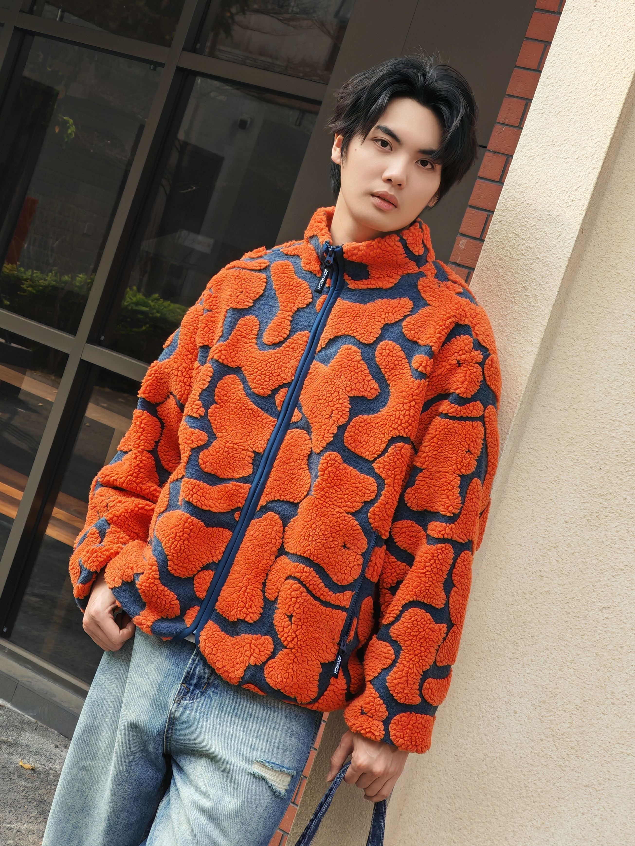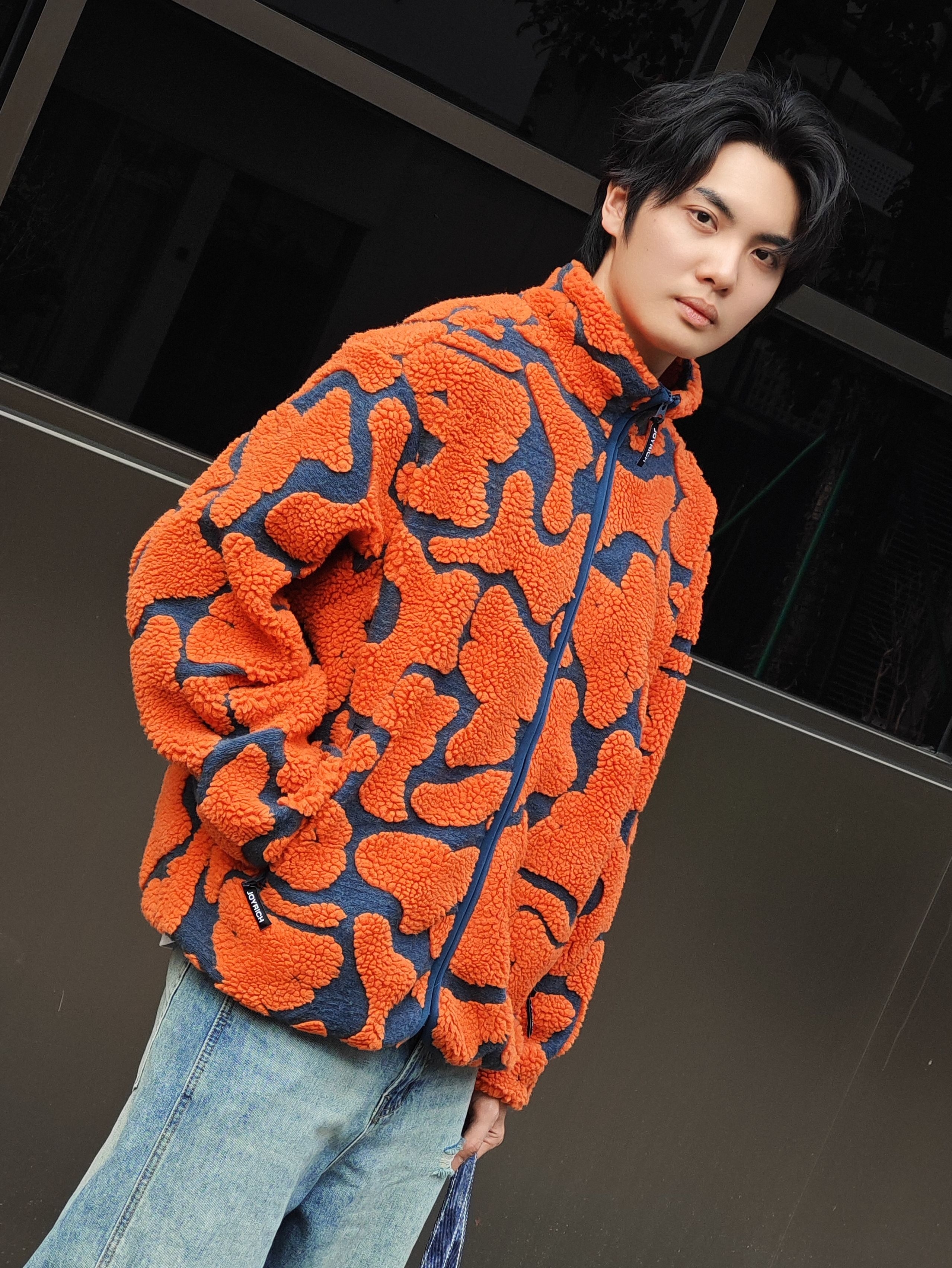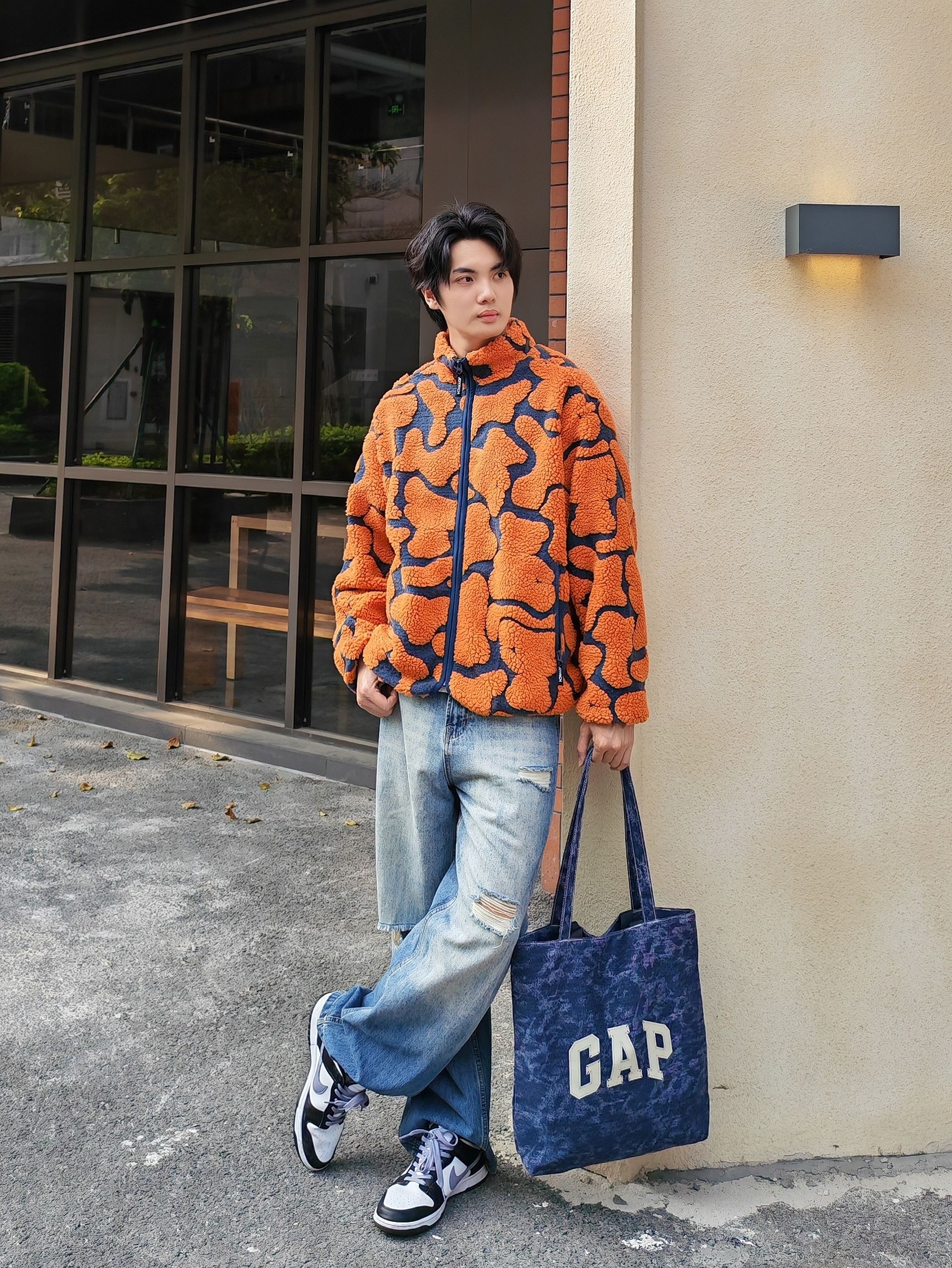 hi 这里是镭子的出街穿搭分享 橘色羊羔毛外套真的太吸睛!不规则花纹自带复古滤镜,软糯又保暖。 搭配做旧破洞牛仔裤,随性又有层次感。 脚上的dunk鞋和GAP托特单肩包,让整套look更有街头感。 185的身高撑起来完全不压个子,随便站在街角都很出片~