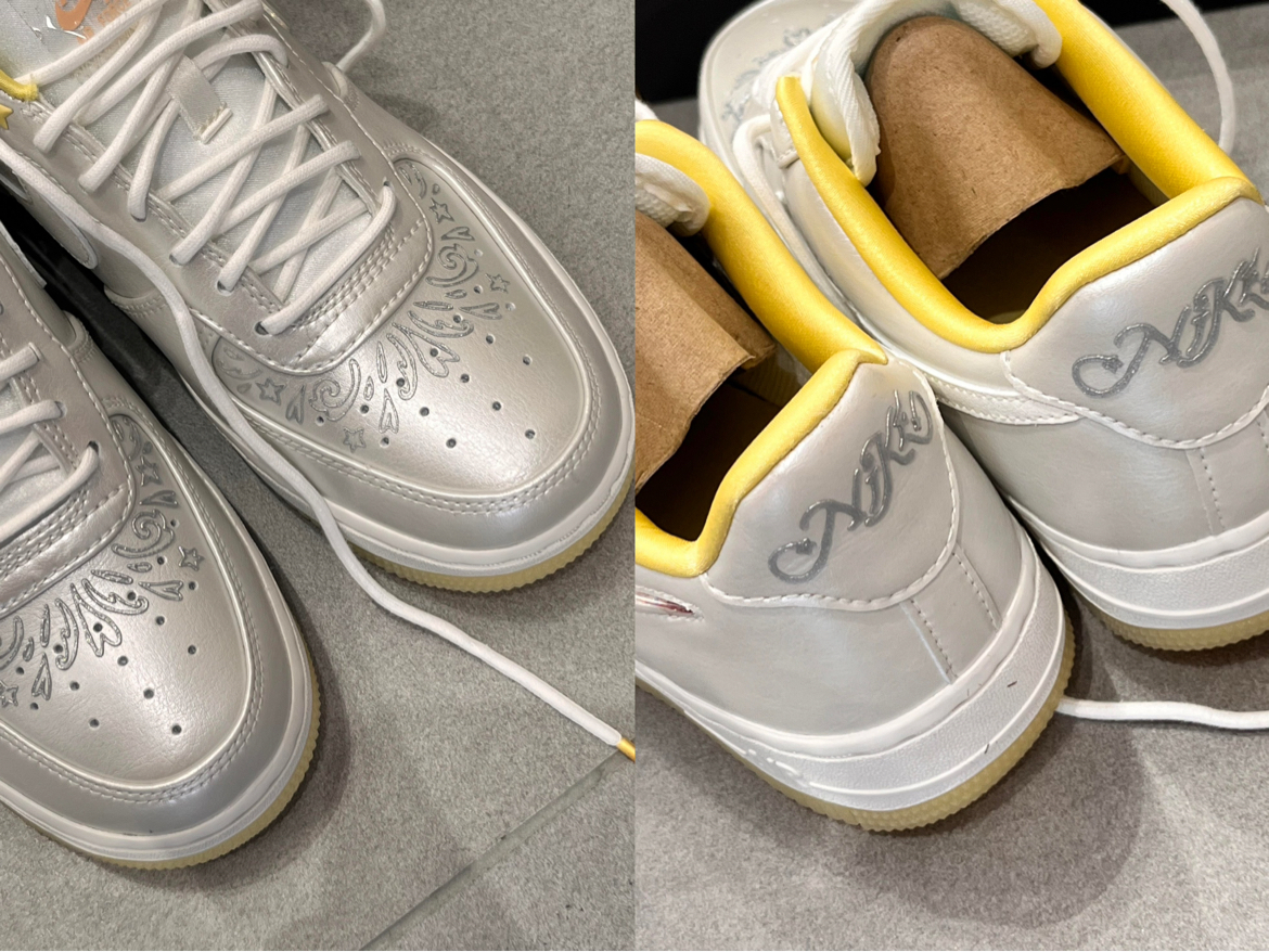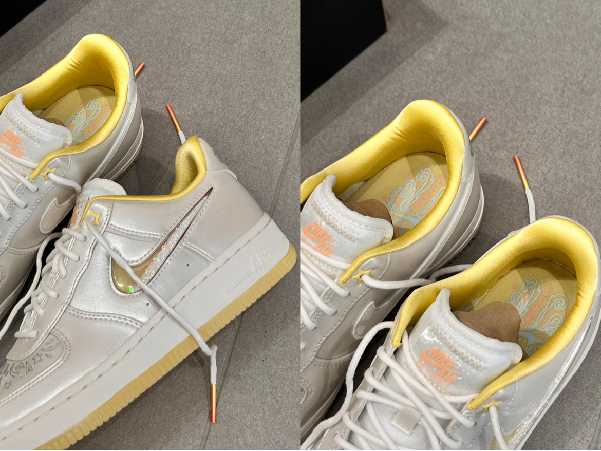 想买百搭小白鞋但怕太普通,想有点设计感又怕太夸张不好搭,担心亮面材质显廉价,还怕磨脚。 这双银闪AF1刚好踩在审美点上。珠光银皮自带细闪,鞋头和后跟的花纹刺绣很精致,渐变勾子和橙黄鞋舌细节拉满,配牛仔裤、小裙子都合适。生胶底耐磨,鞋口加了软绒,穿久也不磨脚。 优点是质感细腻、配色温柔,日常好搭;缺点是珠光皮容易留指纹,需要偶尔擦一擦。 结尾小问题:你们平时会更偏爱亮面还是哑光的鞋