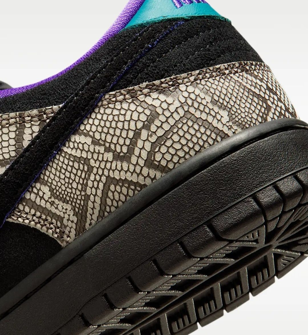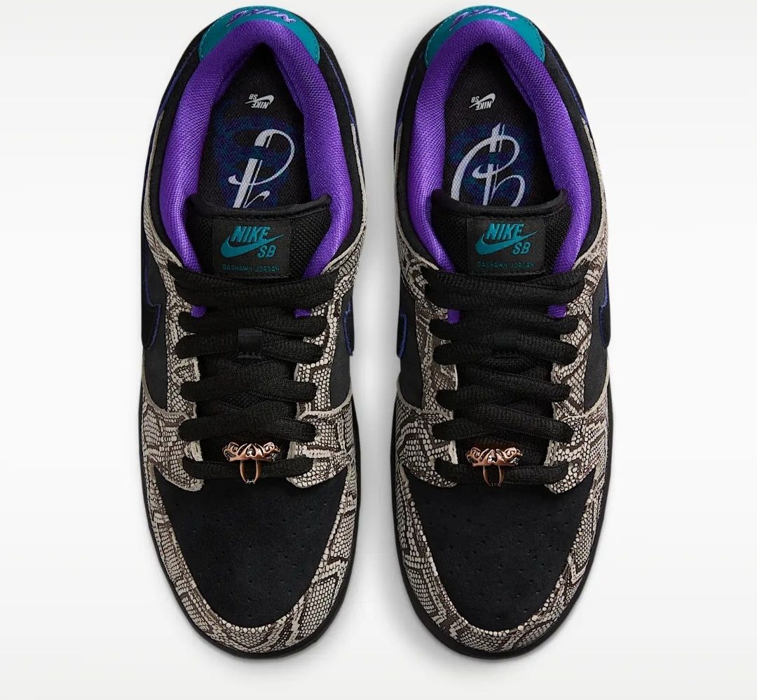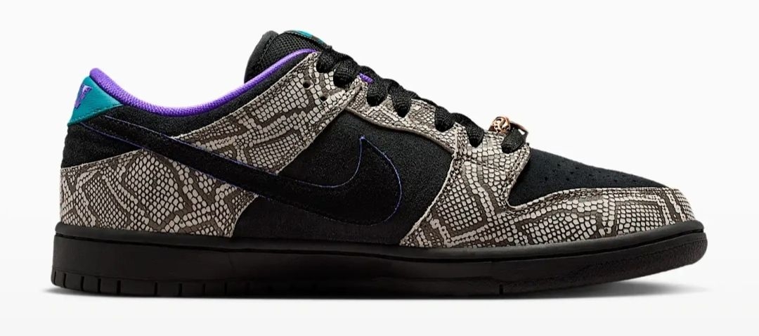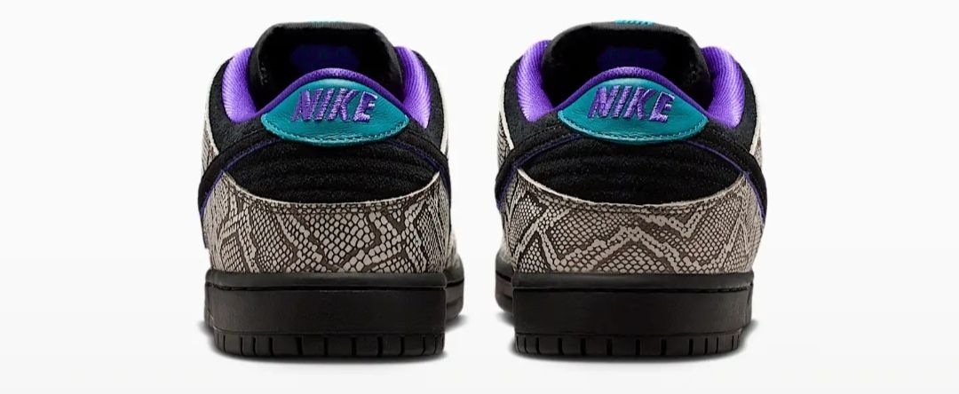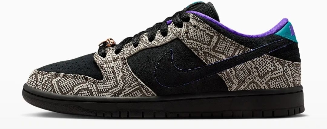 当达肖恩·乔丹踏上滑板,速度与激情便在脚下迸发,而陪伴他征服街头的,正是这双充满故事的Nike SB Dunk Low。这一次,他以家乡凤凰城为灵感,将西南旷野的粗犷与灵动,注入了自己钟爱的滑板鞋中。 鞋身的仿蛇纹鞋面,灵感源自凤凰城特有的菱斑响尾蛇,细密的鳞片纹理在黑白底色间交错,仿佛将沙漠生灵的野性穿在脚上,每一步都带着原生力量。黑色麂皮与蛇纹面料拼接,既保留了Dunk经典轮廓,又增添了层...