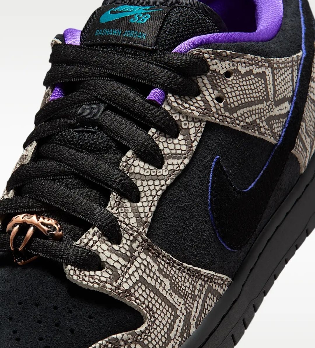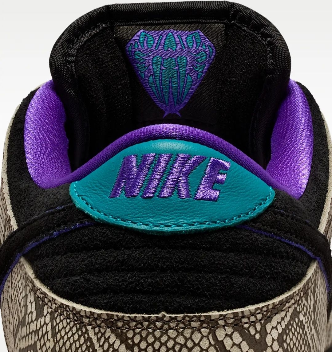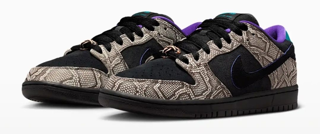 当达肖恩·乔丹踏上滑板,速度与激情便在脚下迸发,而陪伴他征服街头的,正是这双充满故事的Nike SB Dunk Low。这一次,他以家乡凤凰城为灵感,将西南旷野的粗犷与灵动,注入了自己钟爱的滑板鞋中。 鞋身的仿蛇纹鞋面,灵感源自凤凰城特有的菱斑响尾蛇,细密的鳞片纹理在黑白底色间交错,仿佛将沙漠生灵的野性穿在脚上,每一步都带着原生力量。黑色麂皮与蛇纹面料拼接,既保留了Dunk经典轮廓,又增添了层...