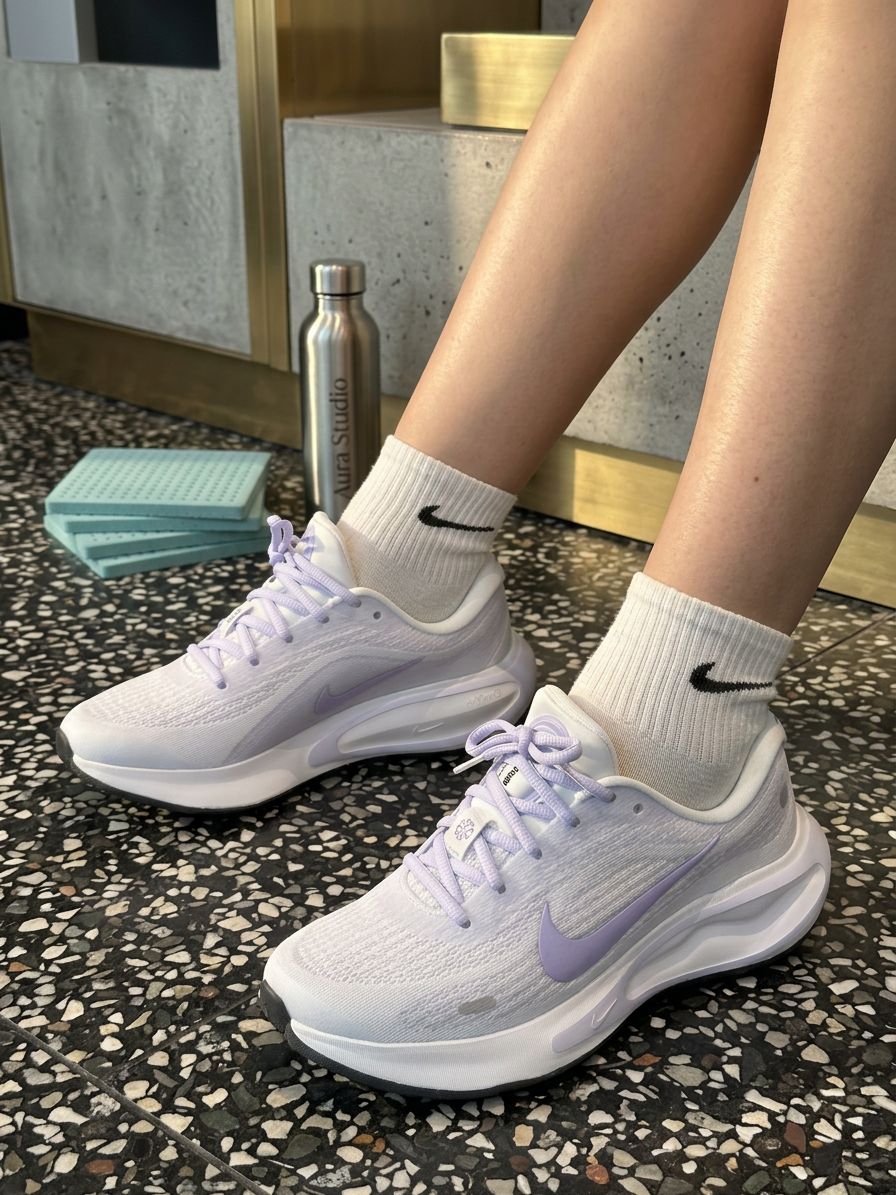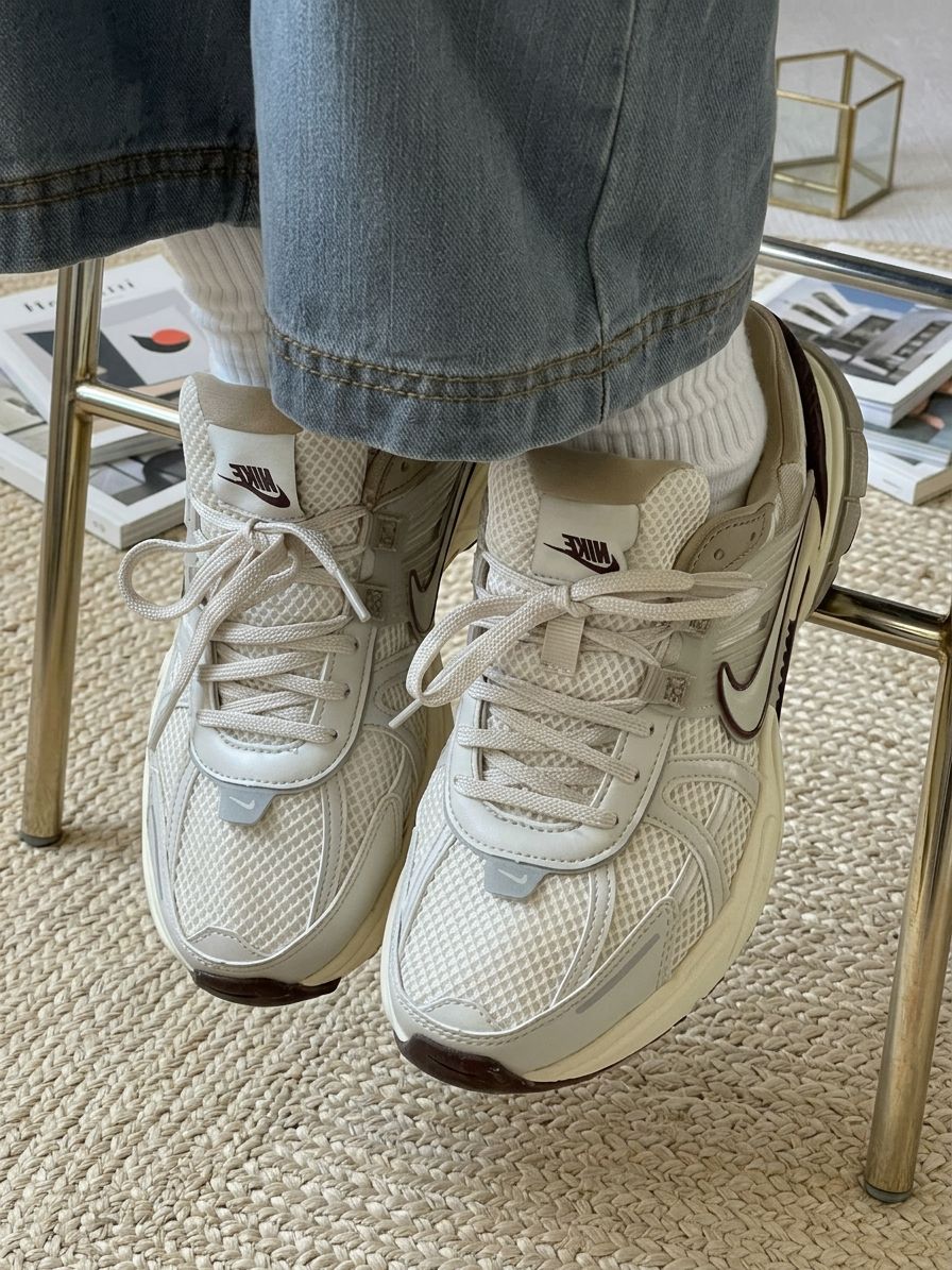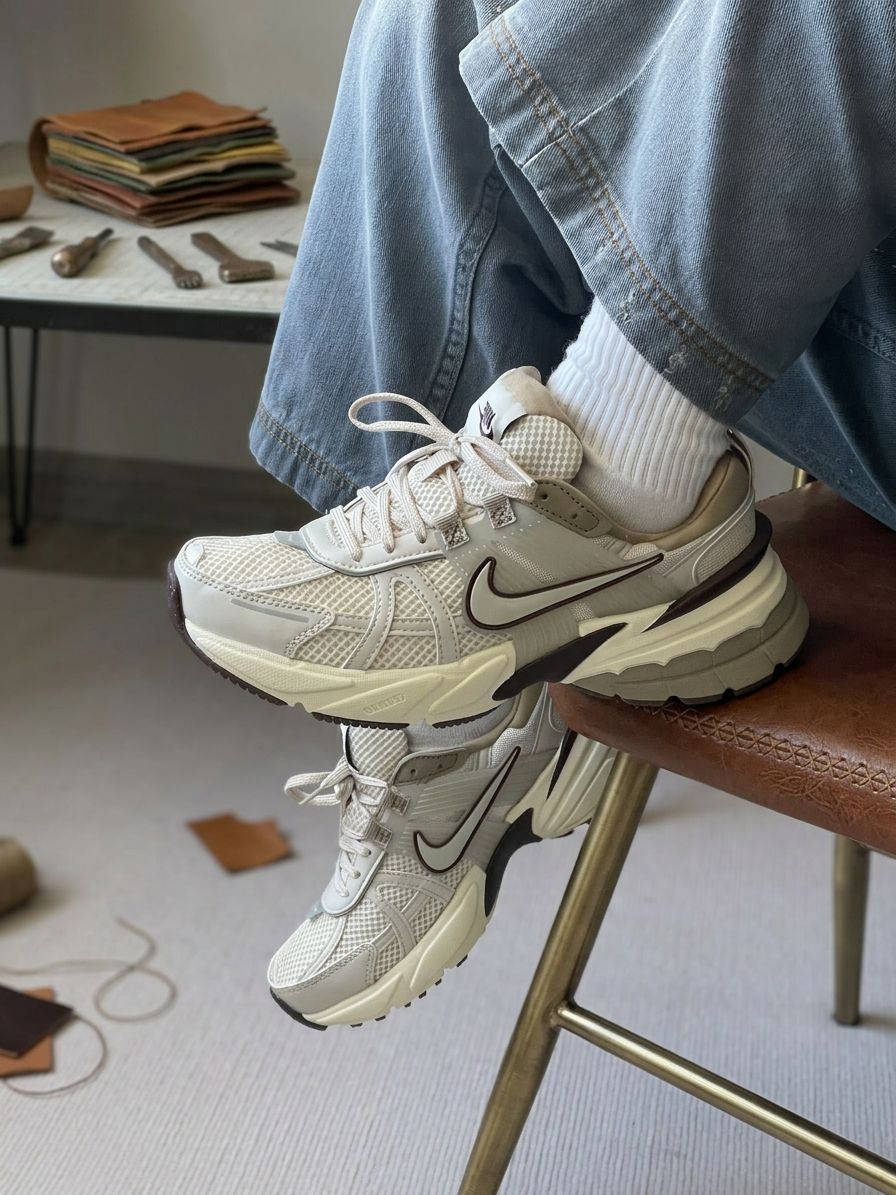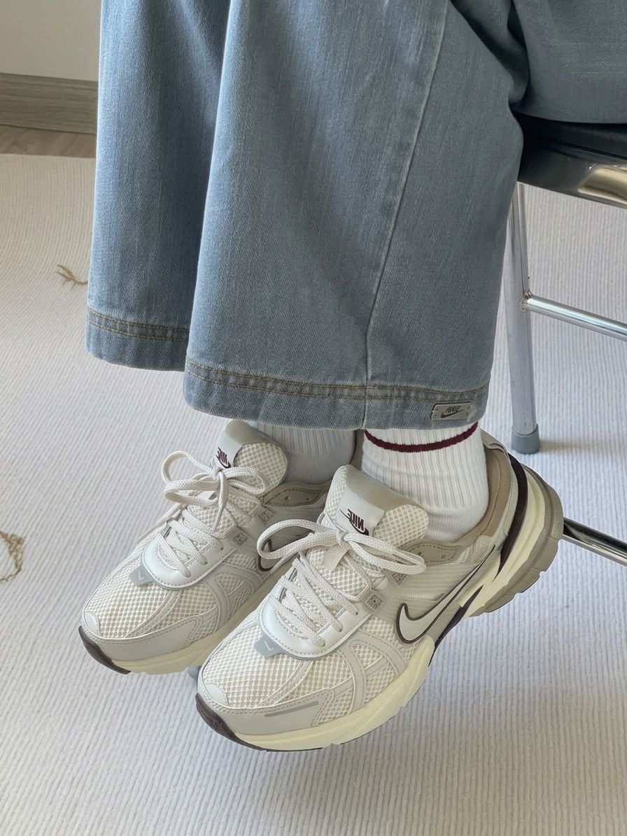 这双Nike运动鞋以浅灰网面为主调,搭配米白厚底与深灰Swoosh,网面材质透气舒适,厚底设计复古有质感,Nike标志低调亮眼。搭配浅蓝牛仔裤与白色中筒袜,休闲中带点精致,轻松适配日常出街、咖啡馆小坐。置于木地板上,浅灰与米白的碰撞在自然光线下柔和呈现,成为居家或外出的焦点。经典设计+舒适材质,让每一步都充满惬意与潮流感!