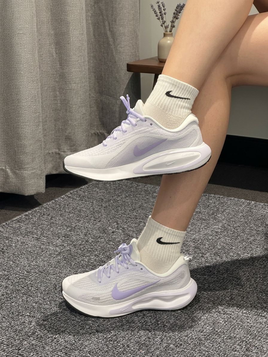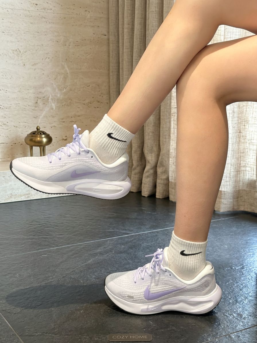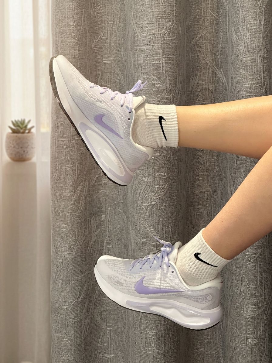 这双Nike运动鞋以淡紫色网面为主调,轻盈透气,鞋侧的紫色Swoosh标志低调亮眼,淡紫色鞋带与整体配色和谐统一。白色中筒袜(带黑色Nike标志)的搭配,增添干净利落感。搭配浅色牛仔裤或运动裤,轻松适配日常出街、健身房训练或咖啡馆小坐。置于水磨石地面上,淡紫与白色的碰撞在自然光线下柔和呈现,成为街头或休闲场景的焦点。网面材质舒适透气,厚底设计带来缓震体验,让每一步都充满清新与活力!
