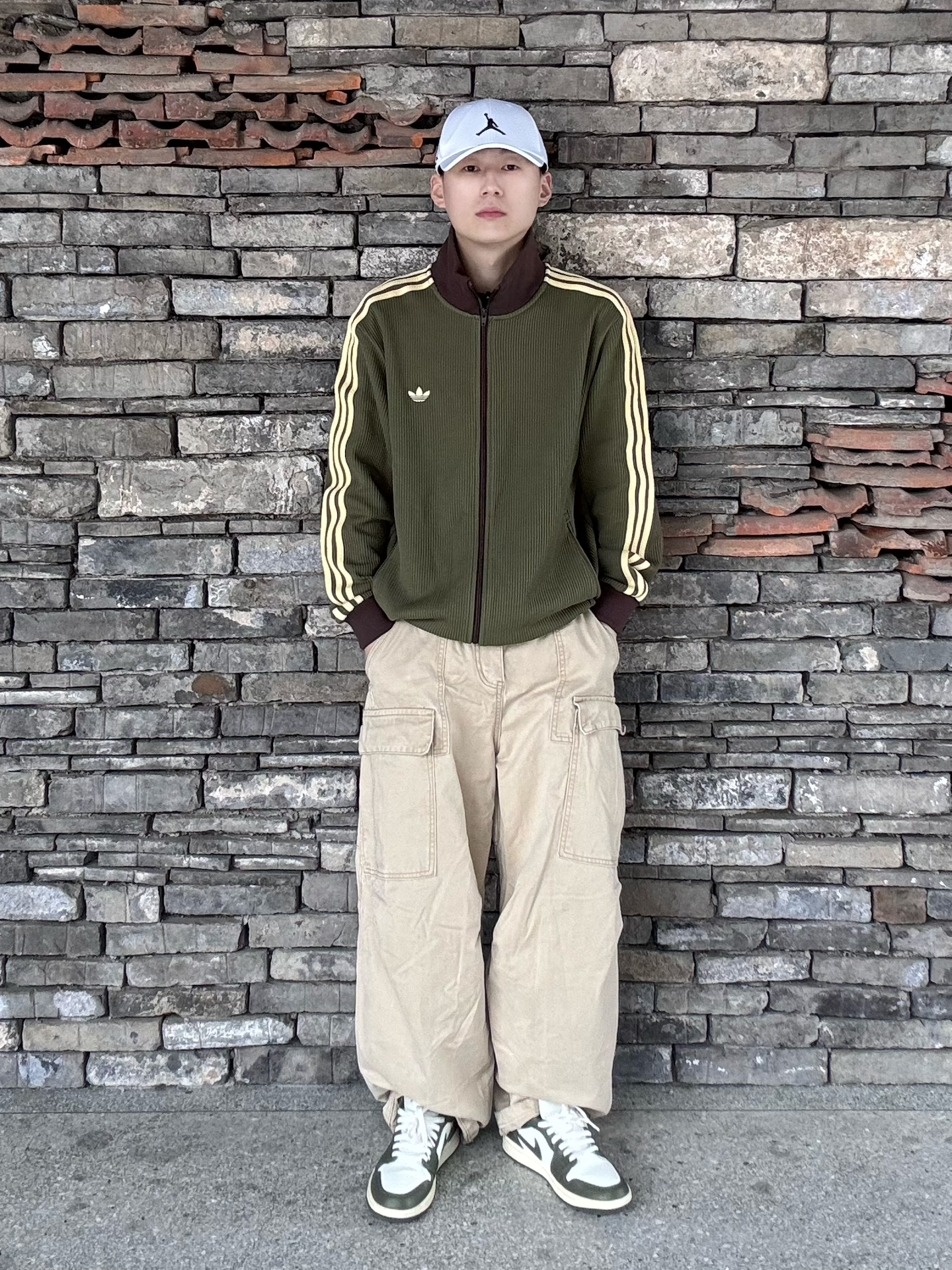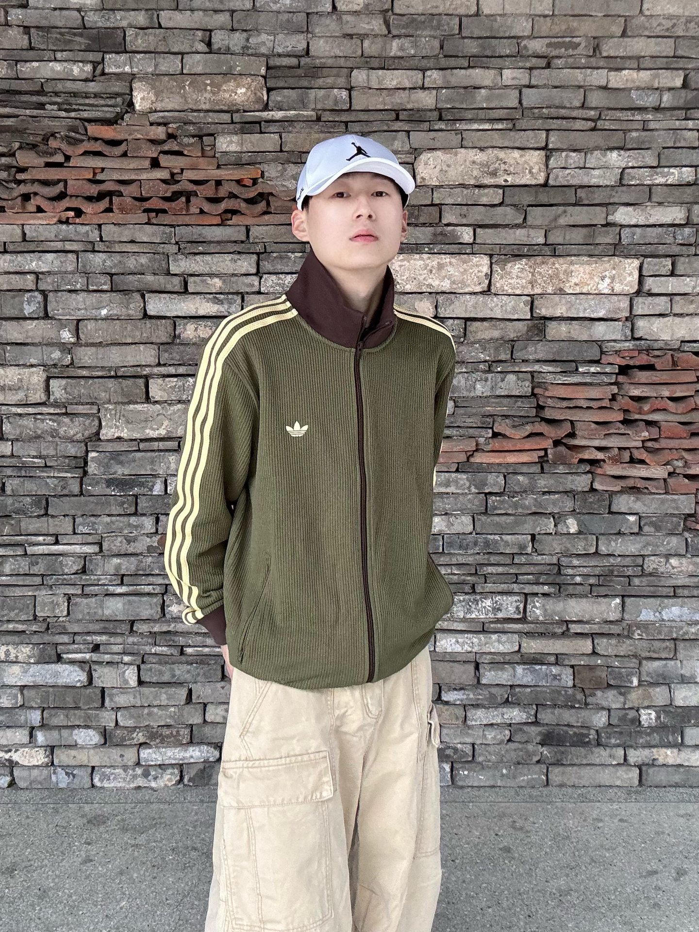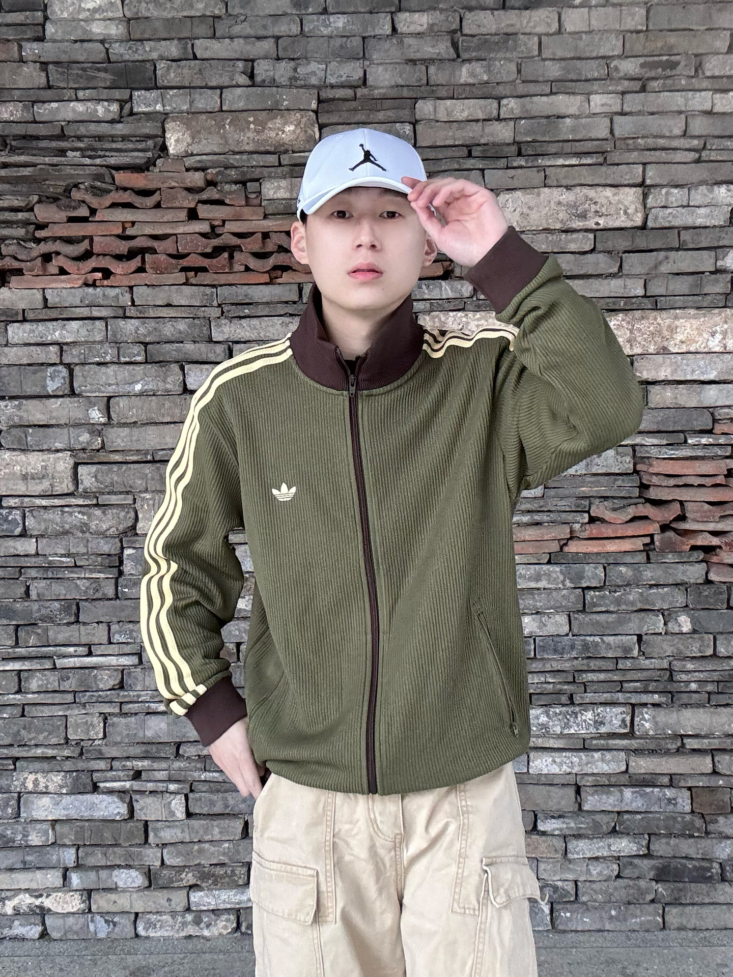 橄榄绿三叶草华夫格外套,自带复古肌理感,浅黄三条杠+深棕撞色领,把90年代运动风拉满💯 下装搭卡其工装裤,同色系叠穿更显层次,脚踩橄榄绿AJ1,整套色系和谐又有细节。 日常出街、citywalk都适配,慵懒又不失少年感,复古党直接冲,轻松拿捏松弛感穿搭 ! 🧢: #Jordan 👕: #adidas originals 👟: #Jordan #潮人的春天来了 #早八无脑穿搭 #买双...