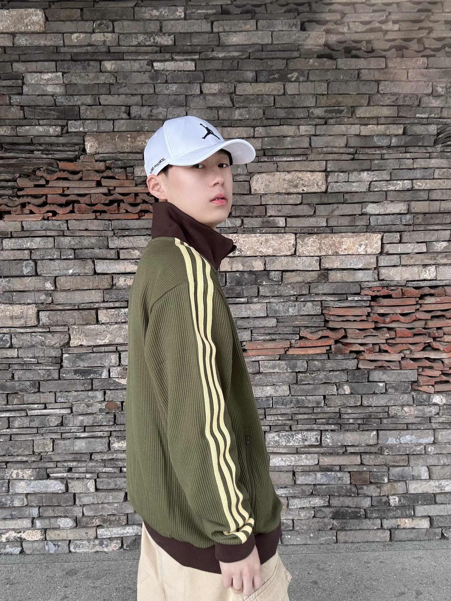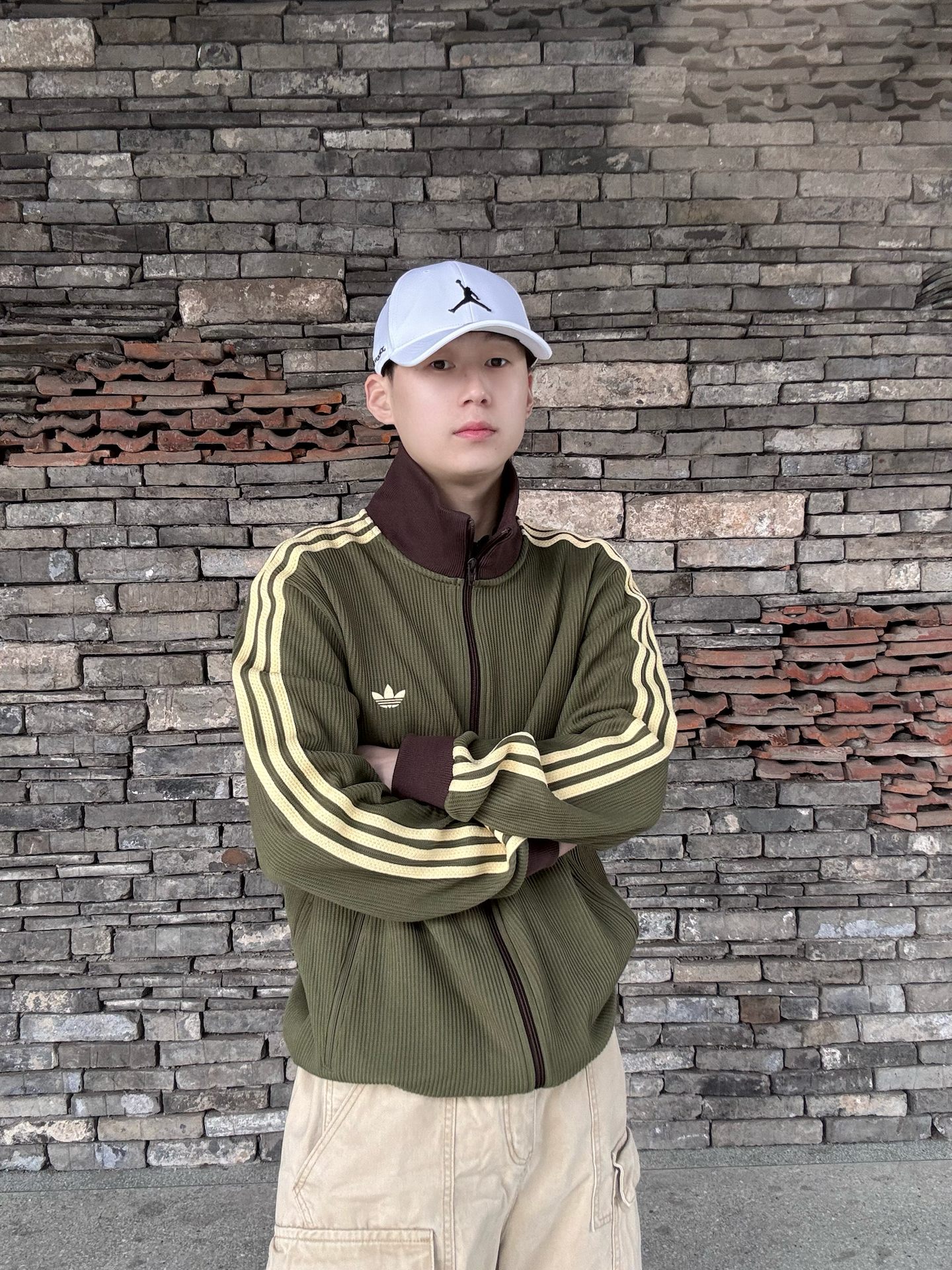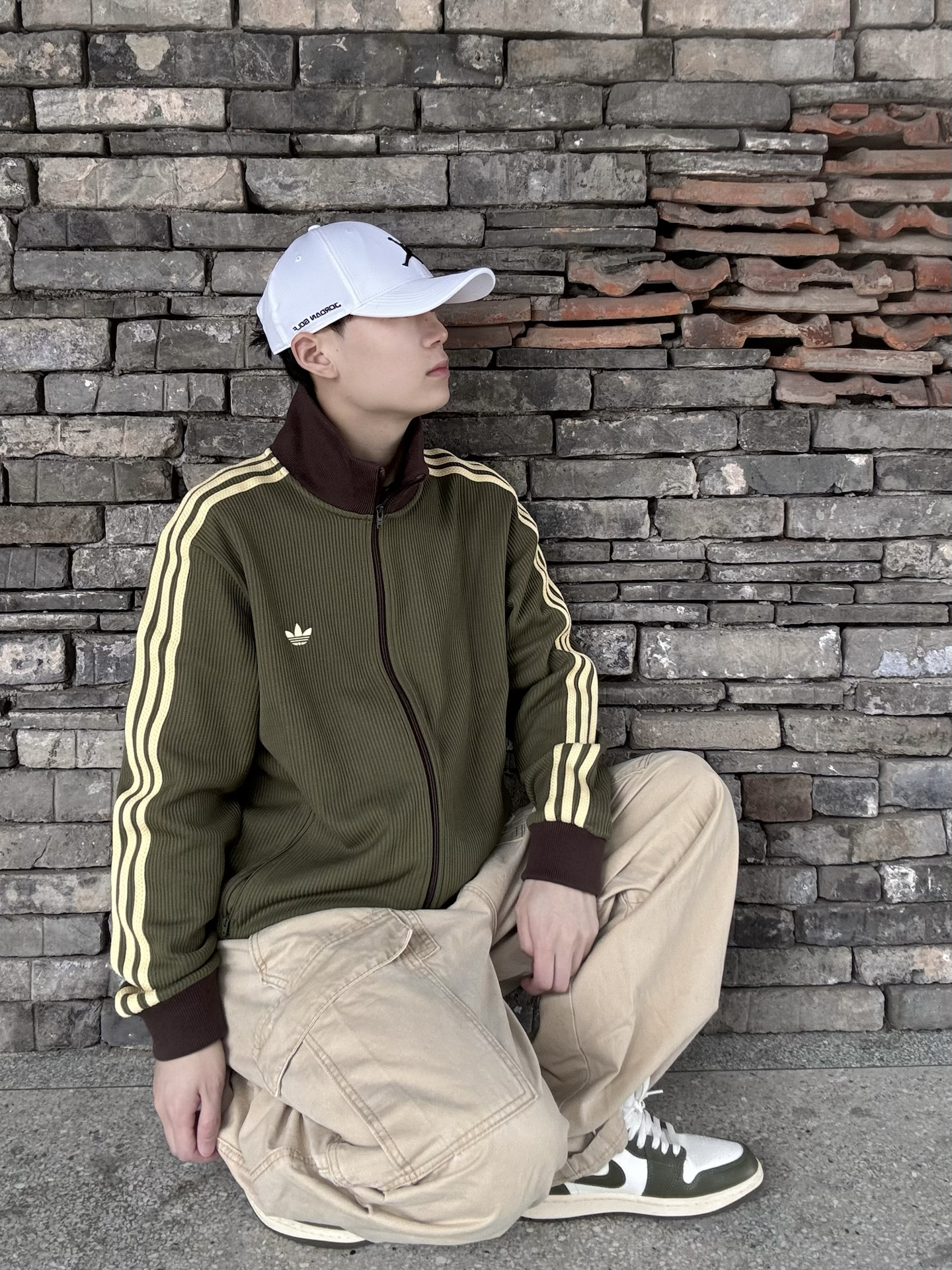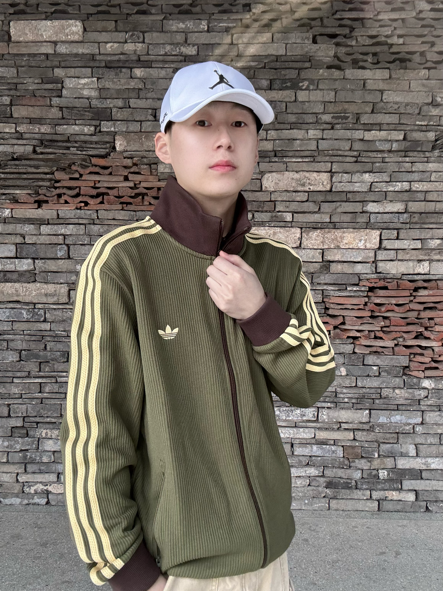 橄榄绿三叶草华夫格外套,自带复古肌理感,浅黄三条杠+深棕撞色领,把90年代运动风拉满💯 下装搭卡其工装裤,同色系叠穿更显层次,脚踩橄榄绿AJ1,整套色系和谐又有细节。 日常出街、citywalk都适配,慵懒又不失少年感,复古党直接冲,轻松拿捏松弛感穿搭 ! 🧢: #Jordan 👕: #adidas originals 👟: #Jordan #潮人的春天来了 #早八无脑穿搭 #买双...