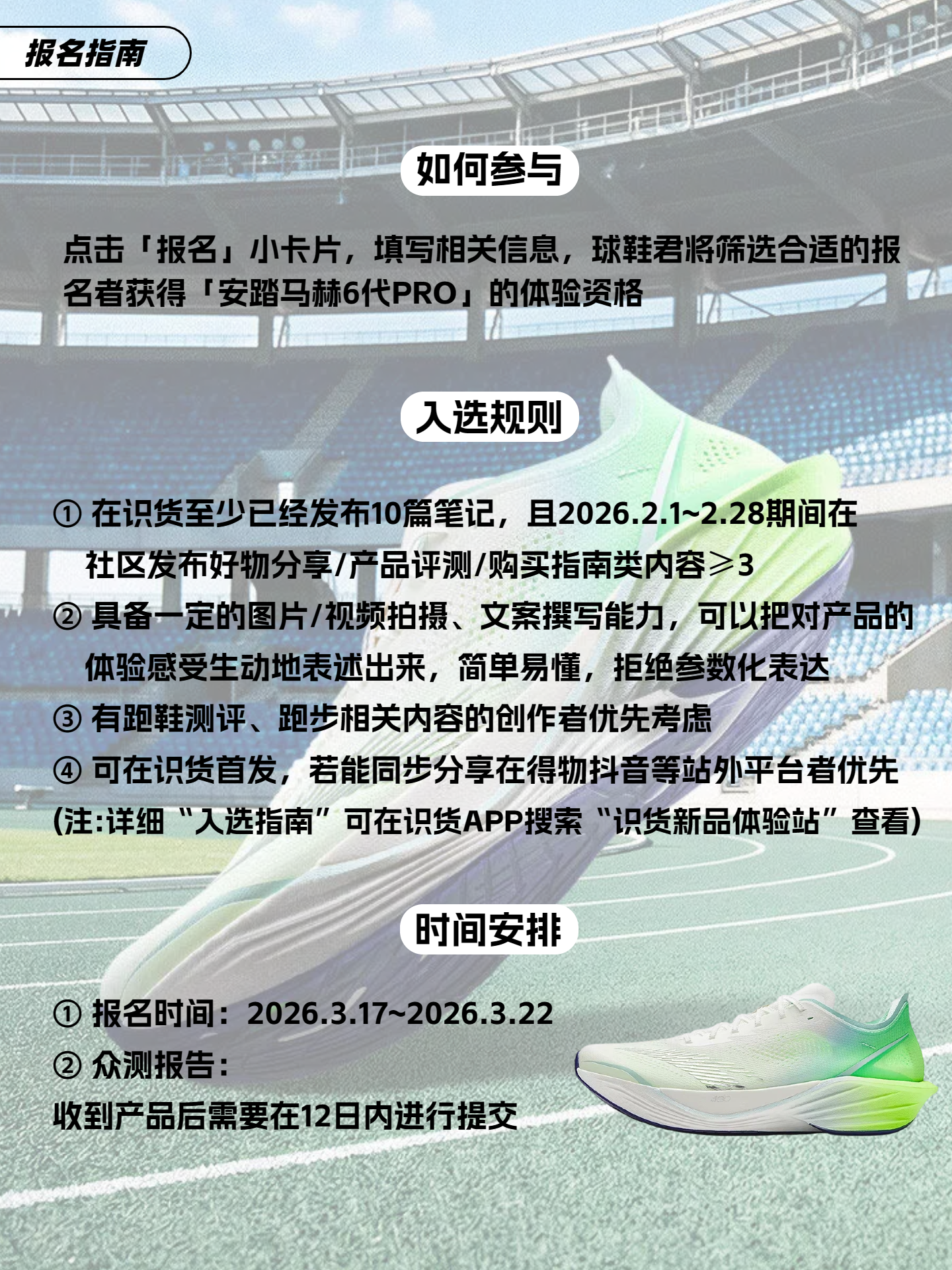 招募名额:10名 【如何参与】 点击「报名」小卡片,填写相关信息,球鞋君将筛选合适的报名者获得「安踏马赫6代PRO」的体验资格 【入选规则】 ① 在识货至少已经发布10篇笔记,且2026.2.1~2.28期间在社区发布好物分享/产品评测/购买指南类内容≥1 ② 具备一定的图片/视频拍摄、文案撰写能力,可以把对产品的体验感受生动地表述出来,简单易懂,拒绝参数化表达 ③ 有跑鞋测评、跑步相关内容的...
