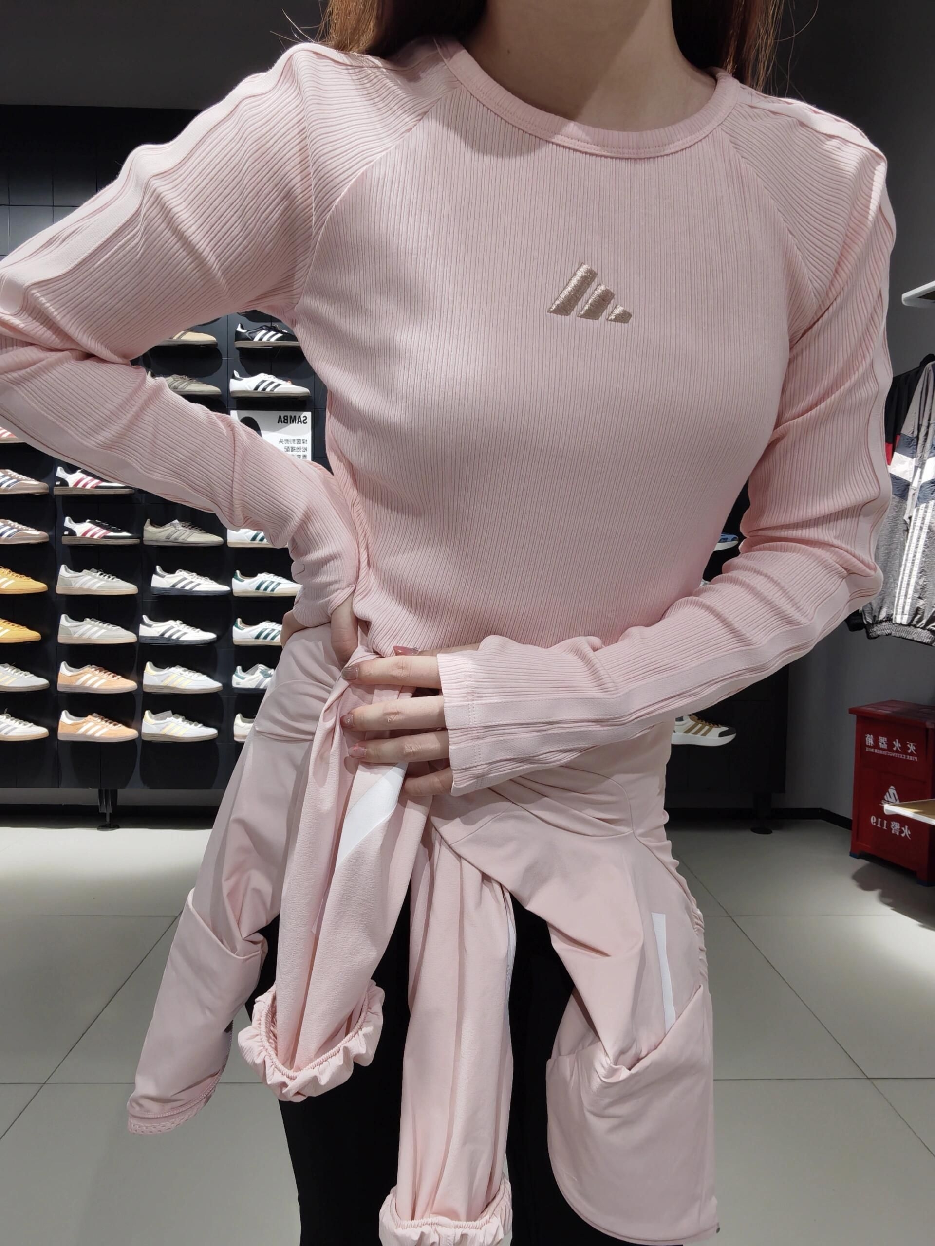 浅粉阿迪长袖+袖口小设计,搭黑色瑜伽🧘♂️喇叭裤,松弛又显身材~外套随意系腰上,运动感拉满,逛店试穿超上镜,日常出街or运动都适配,粉粉嫩嫩拿捏少女感💗