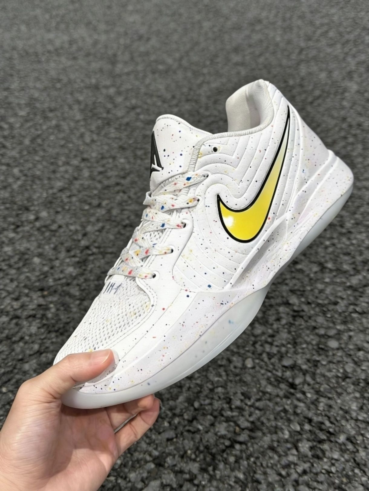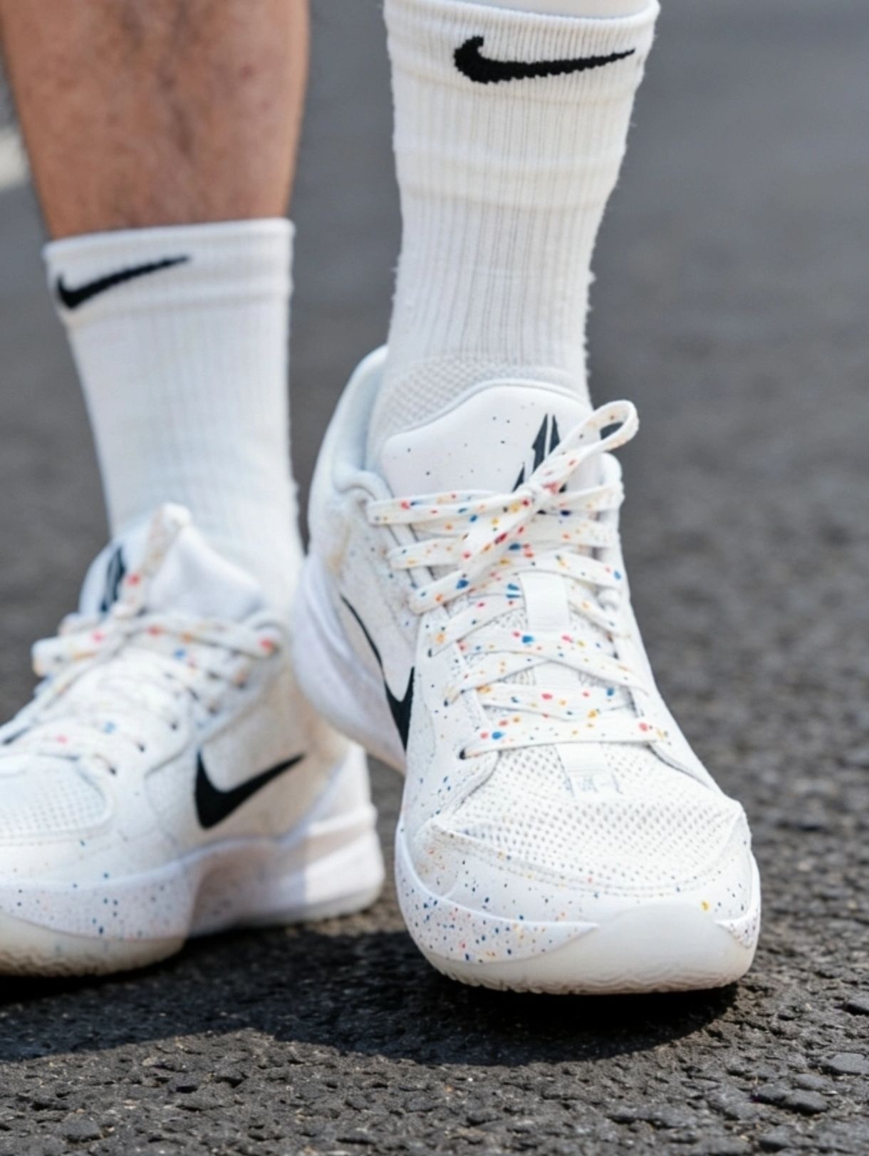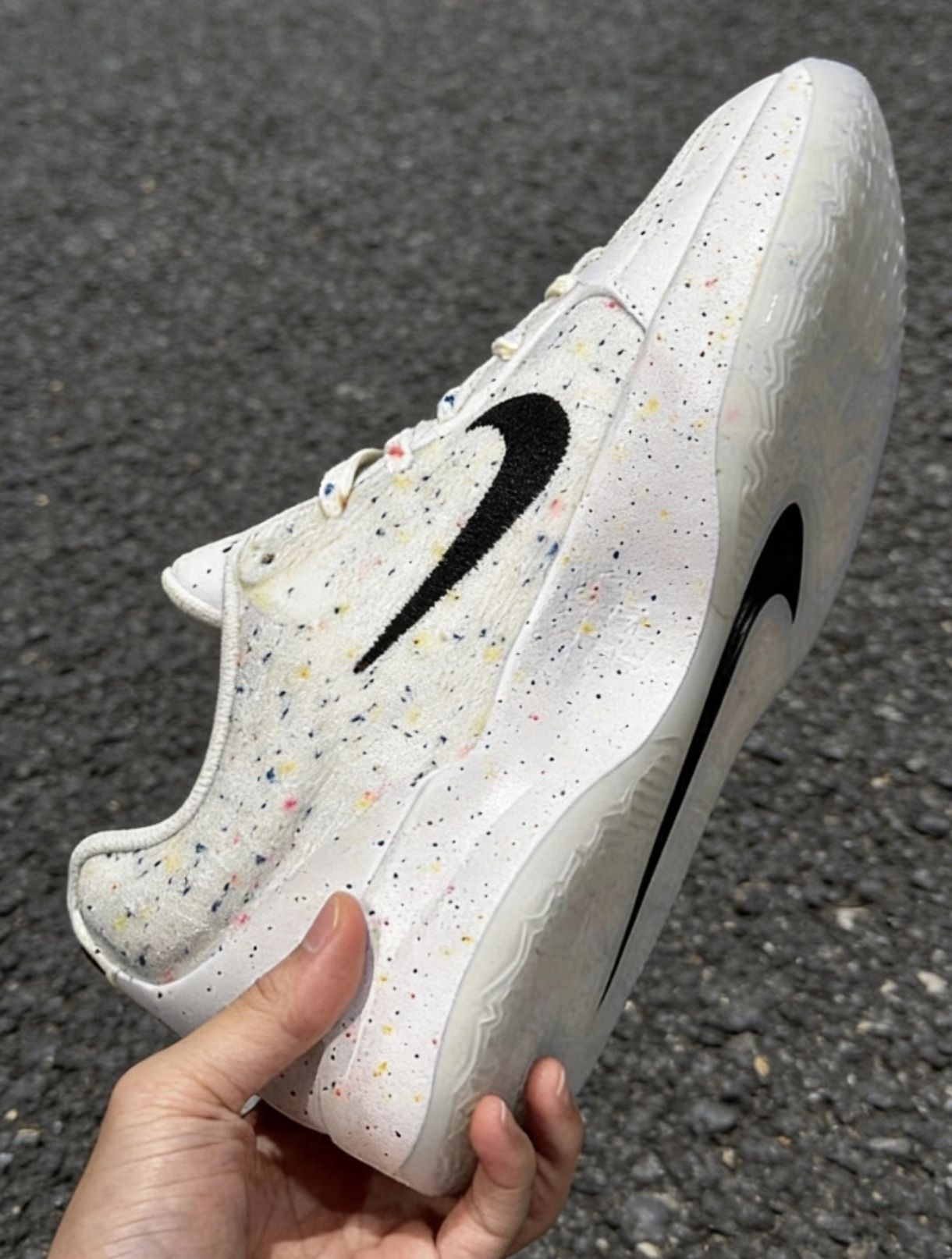 这双莫兰特二代的白彩泼墨款,网面透气不闷脚,彩色泼墨细节很有街头感。不管是打球穿还是日常出街都合适,配白袜或者运动裤都清爽。柏油路、球场、街头都能hold住,脚感软弹,颜值和实用性都在线,日常穿不挑搭配,低调又有细节。