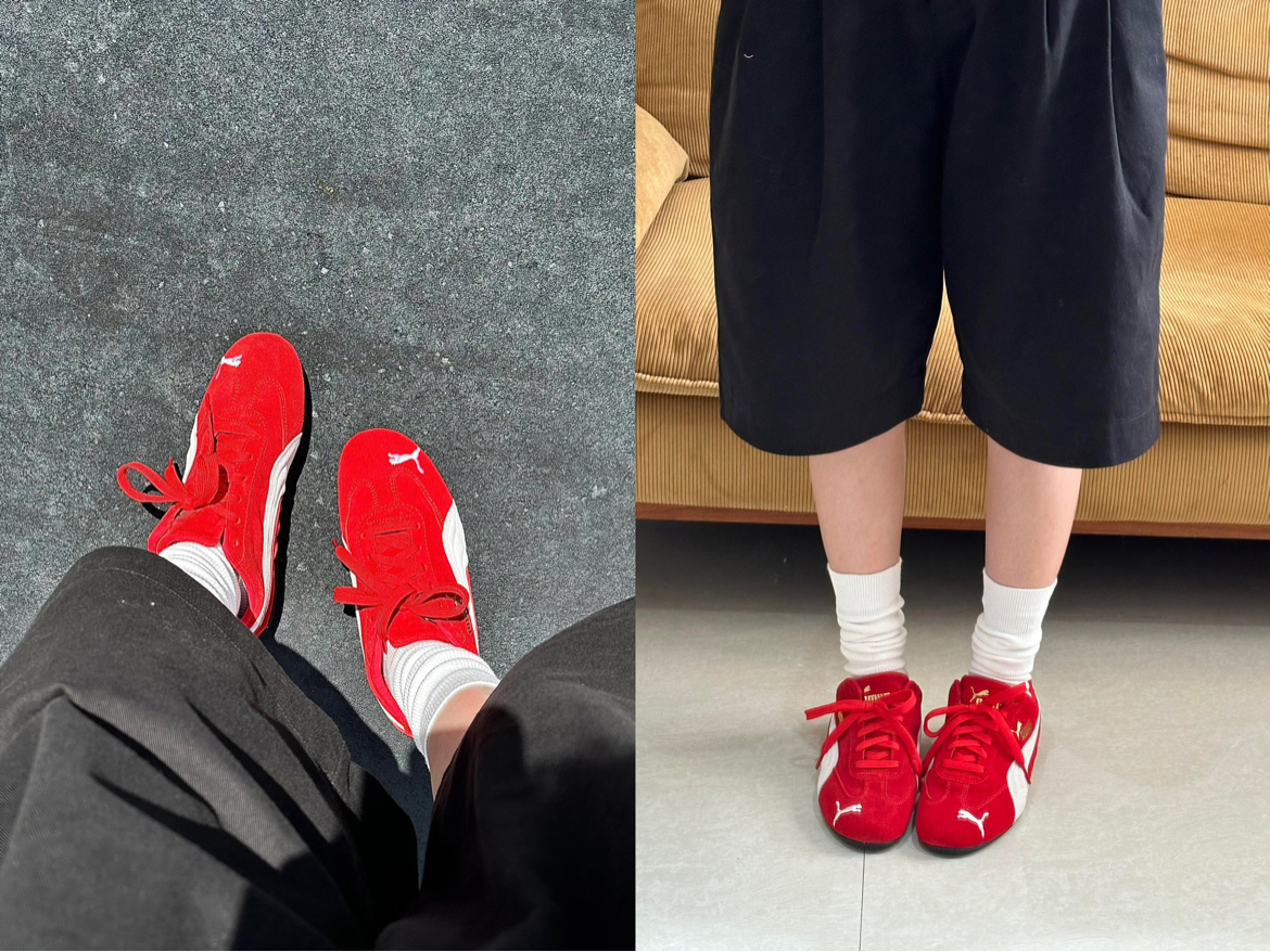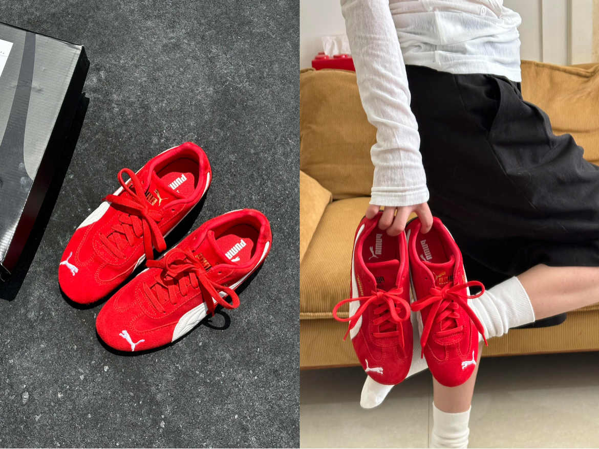 想选一双百搭板鞋,怕款式太烂大街没记忆点,担心红色显土气,还顾虑麂皮难打理、鞋底硬磨脚。 这双PUMA红拼白复古鞋,正红配白边超显元气,麂皮质感高级,辨识度拉满;鞋型贴合脚型,上脚轻盈不笨重。 使用心得:红色很衬肤色,搭配牛仔裤、短裙都和谐;麂皮触感细腻,暂时没发现易掉毛情况;走路轻便,日常通勤无压力。 小缺点:麂皮材质沾灰尘明显,需定期清洁;新鞋鞋头边缘略硬,穿前可稍微磨合。