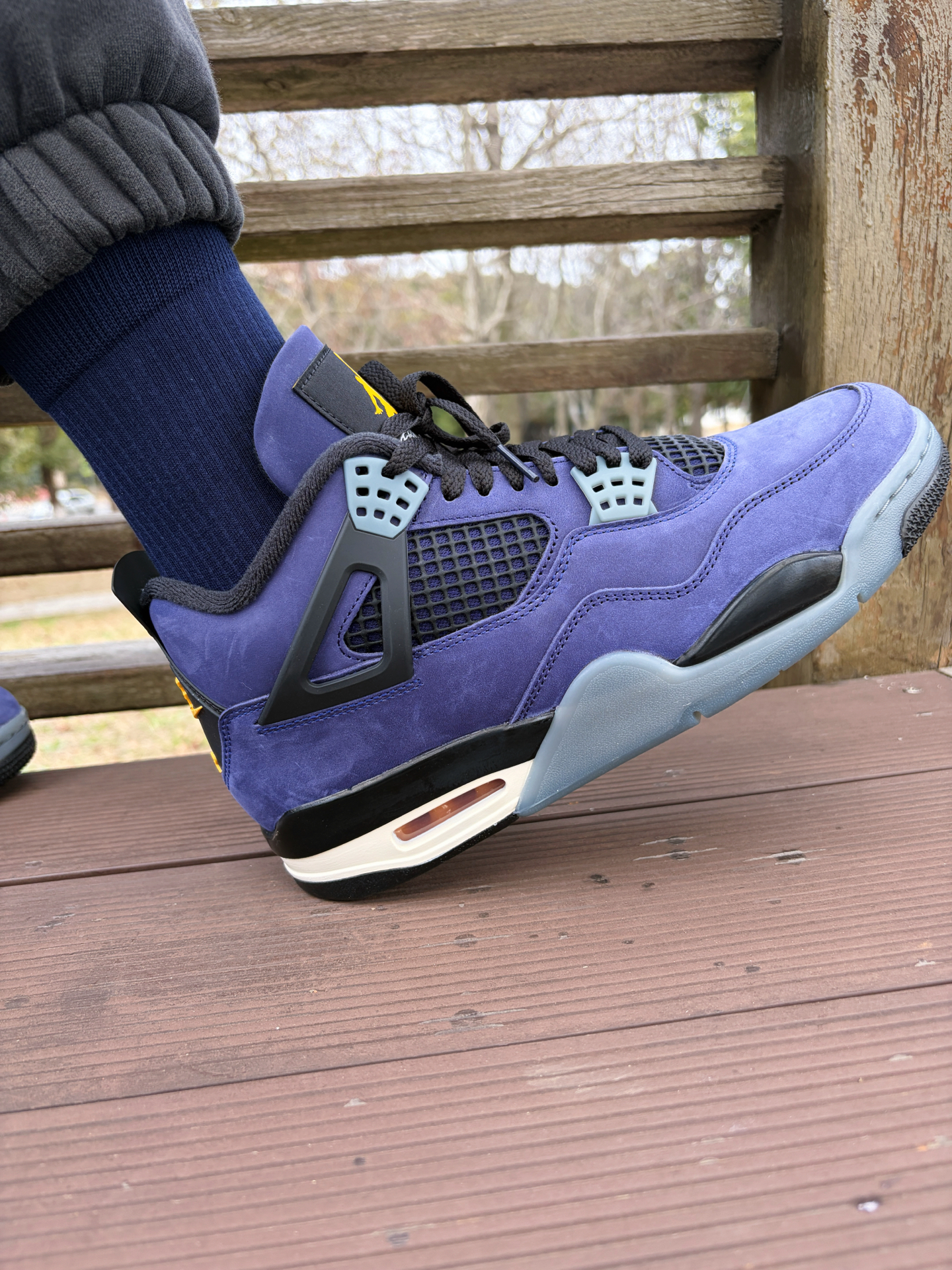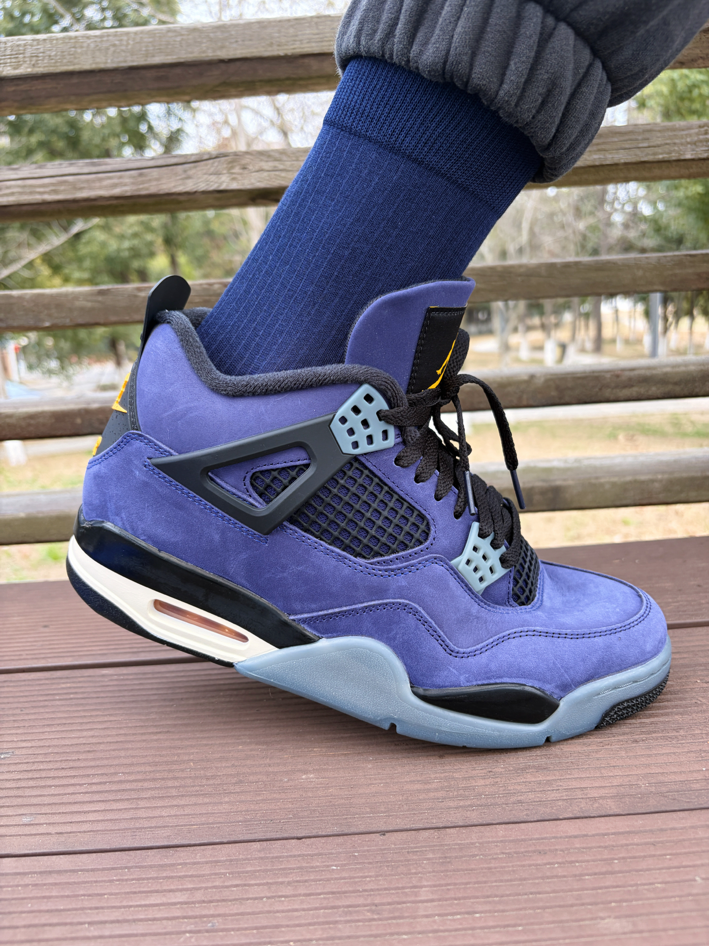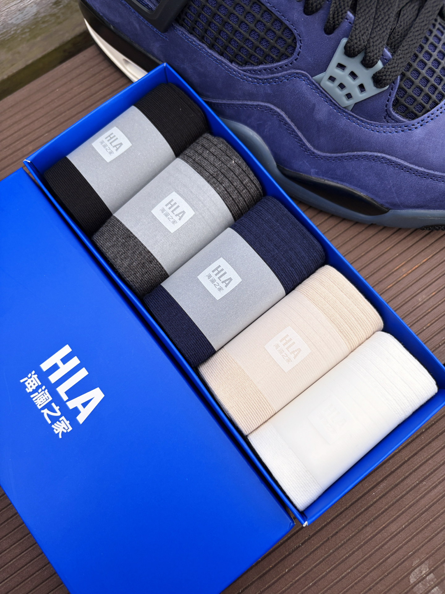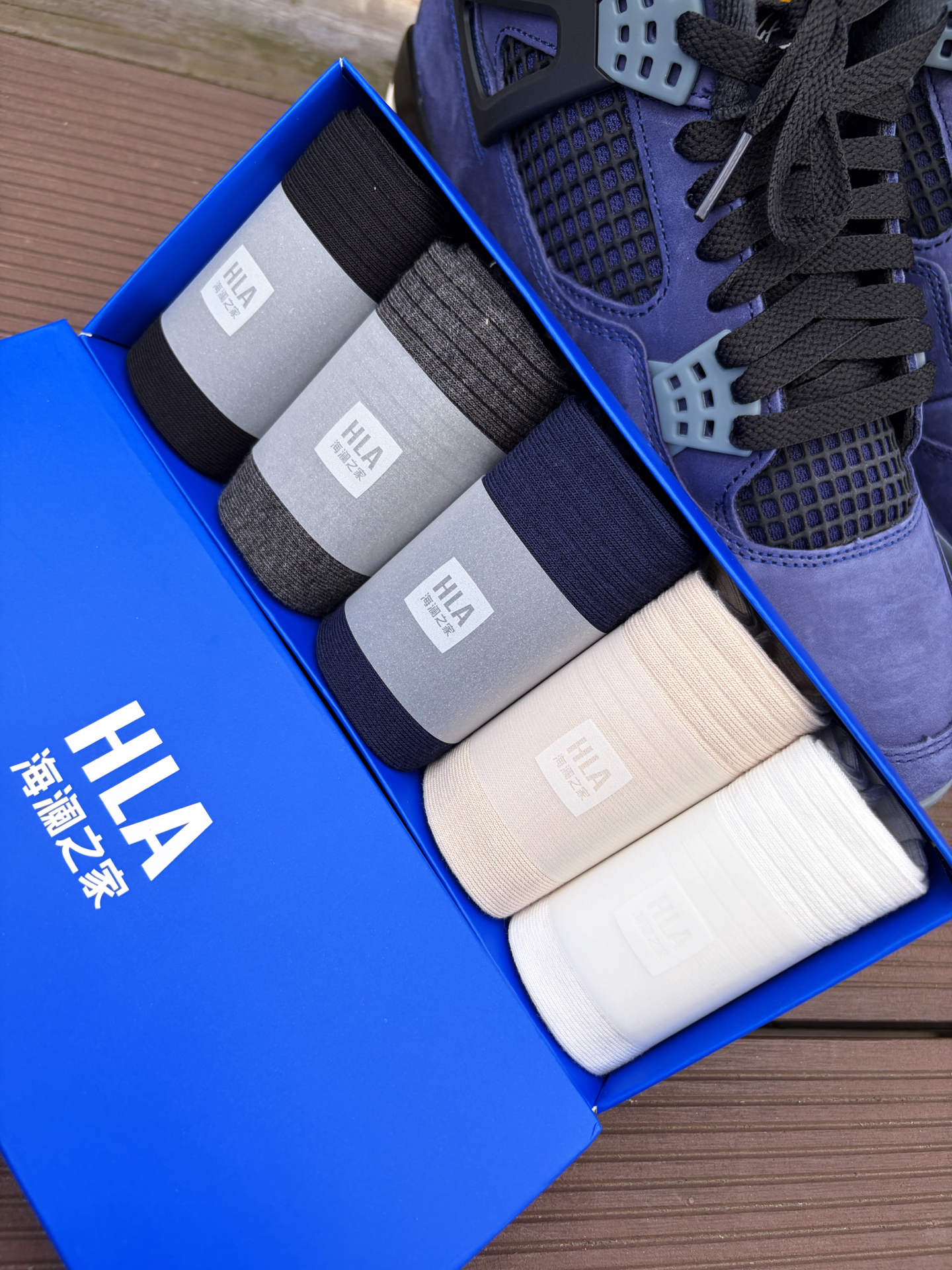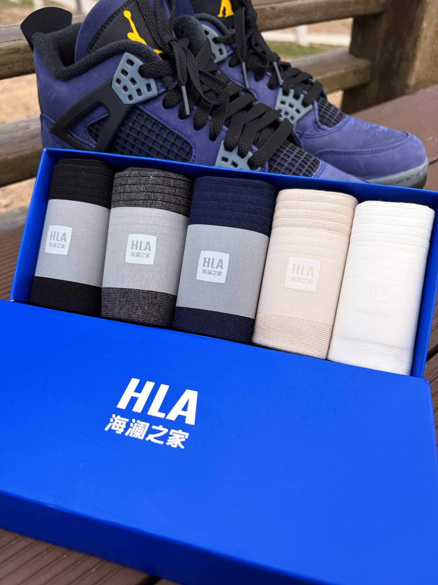今天分享一下我出行的装备,鞋子是最近发售的湖人配色aj4,袜子是海澜之家这一款纯棉中筒袜,上脚很是舒服。 #海澜之家 HLA 袜子材质用到了新疆精梳棉,而且还加了艾草香氛,淡淡的草本味道,穿一天下来脚都很干爽也不会臭脚,作为上班通勤穿又或者是健身运动都能够轻松满足。 @海澜之家配饰穿搭 #海澜之家袜子 #防臭抗菌袜子推荐 #特别强推的一款袜子 #实用穿搭看我的 #好物分享