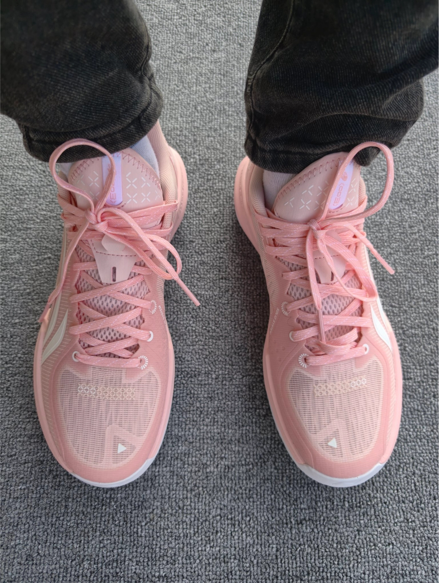 上脚不浮夸,打球日常穿都合适。轻量化设计真的实用,我每次打全场来回冲刺,脚下都没什么负重感,突破第一步启动特别轻快,不会有鞋子拖后腿的情况。抓地力也够稳,室内木地板和外场塑胶地我都试过,急停变向的时候鞋底能牢牢扒住地面,从来没打滑过。中底缓震刚好,落地不震脚,通勤穿也舒服。