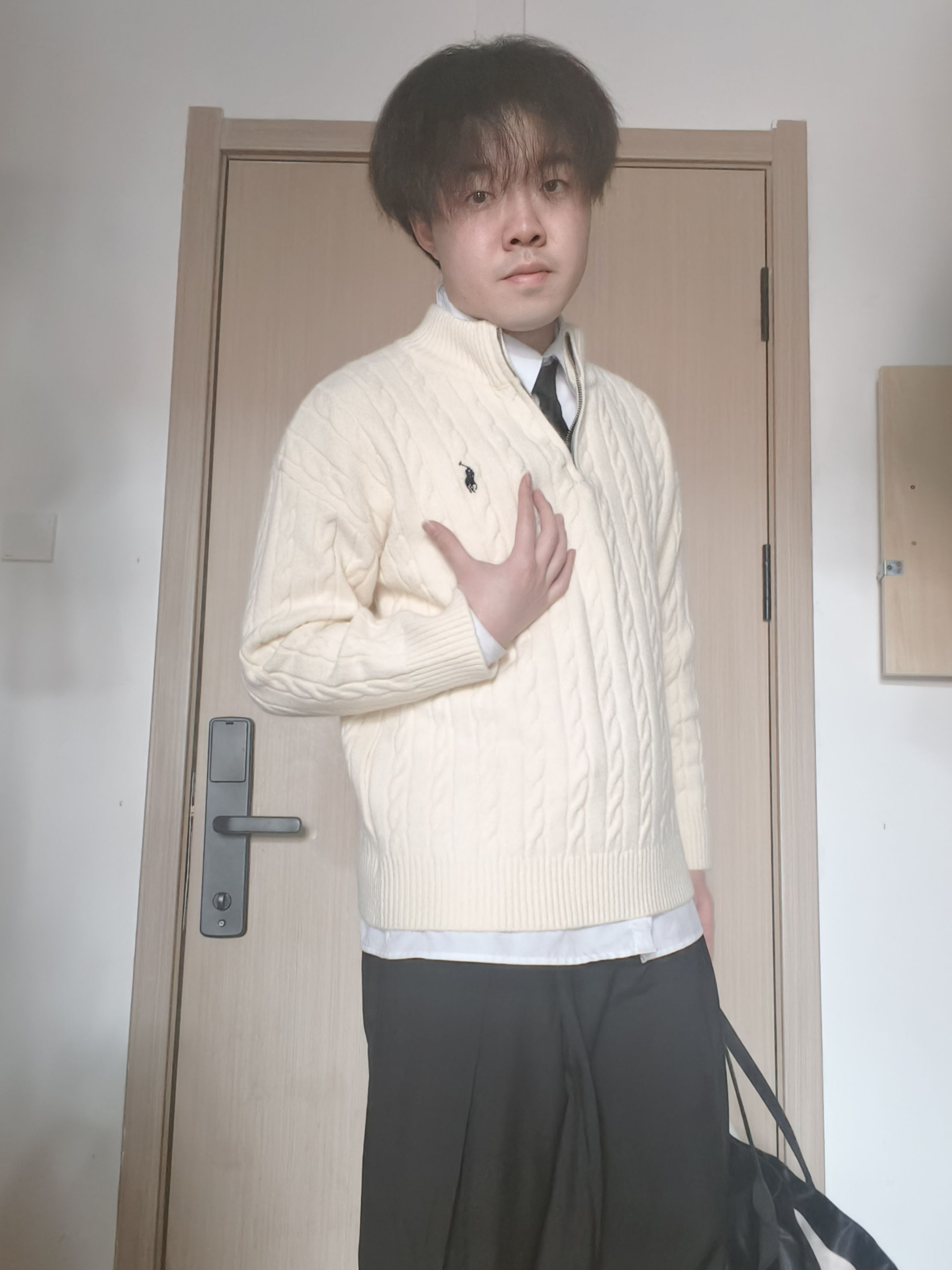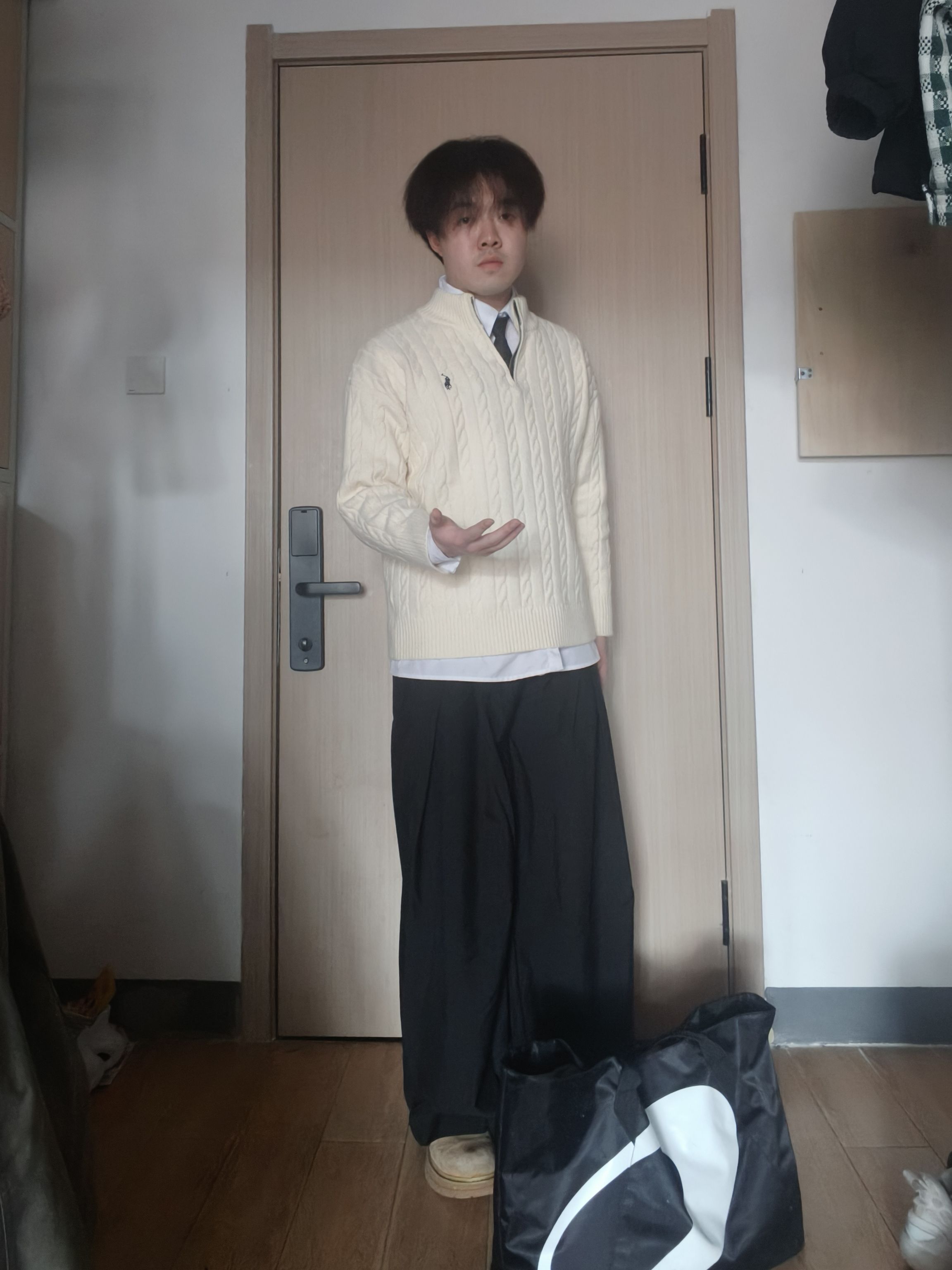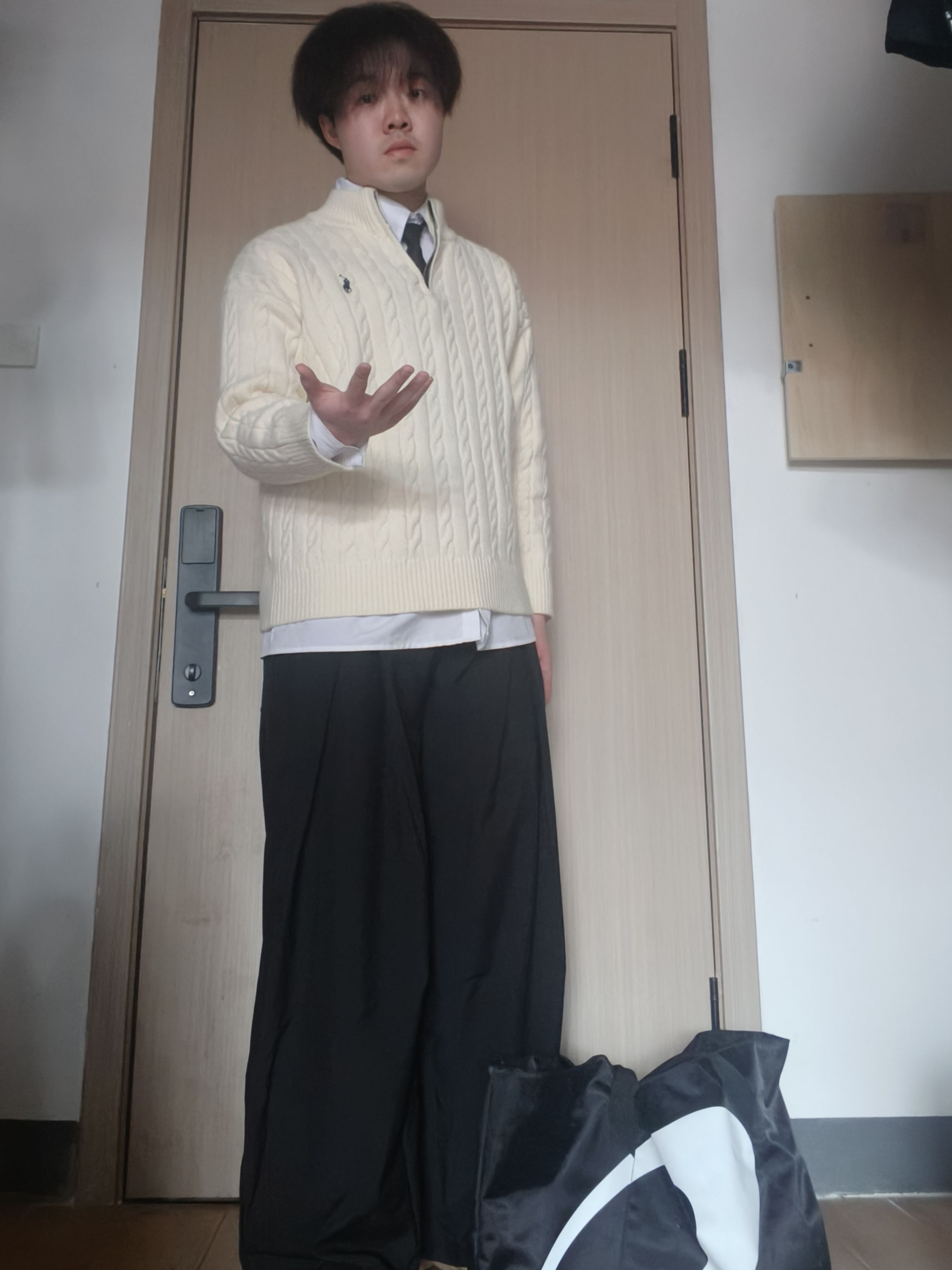 【学院风👔叠穿公式👐🏻|绞花毛衣+白衬衫+阔腿裤,175/60男生的氛围感😍】,由用户 豚的彘qP2 分享,来自河北。这是一篇来自识货社区的真实用户分享笔记。