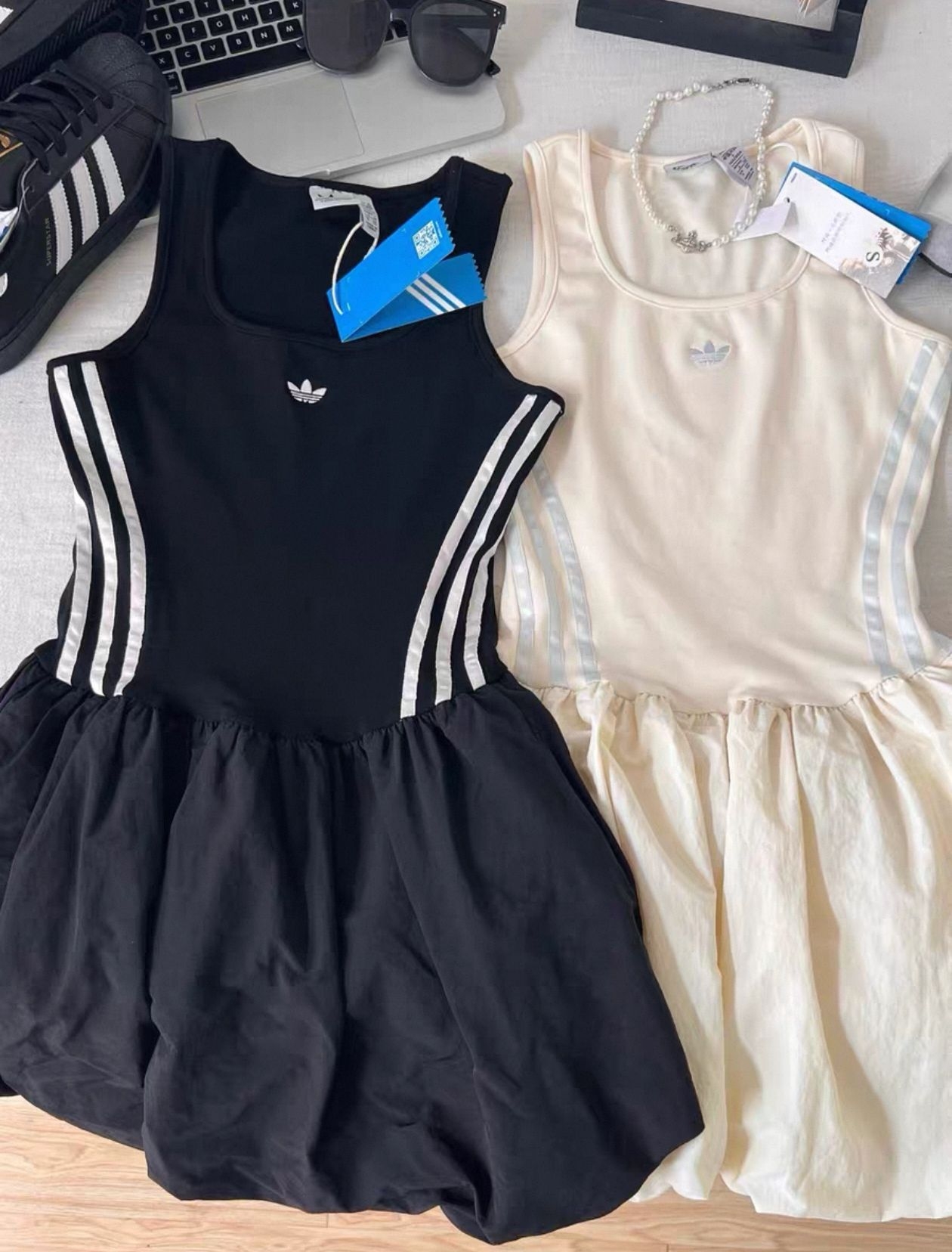 🤍adidas三叶草花苞连衣裙,奶白色KE5075,无袖背心+蓬蓬裙拼接,芭蕾风设计超甜美!上身纯棉单层,弹力小,下摆有内衬,松紧弹力大,穿着舒适又显瘦✨。高腰设计拉长腿部比例,梨形身材友好,遮肉显高!日常、拍照、休闲都能轻松驾驭,搭配洞洞鞋或外套,韩系少女感满满~