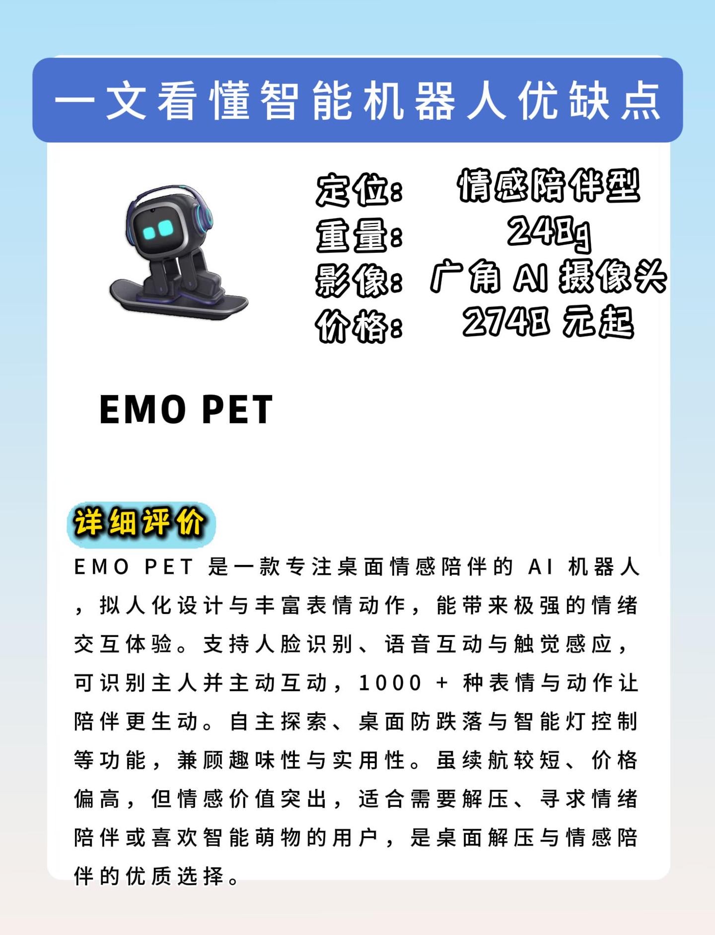 EMO PET是桌面情感陪伴的“天花板”,拟人化设计搭配1000+种表情动作,灵动又治愈,办公、学习时放桌面,解压又暖心。支持10人人脸识别,能精准记住主人,头部触控+四麦声源定位,主动互动感拉满,还能自主探索、防桌面跌落,甚至能控制智能灯,兼顾趣味性与实用性。虽续航不算突出,但情感交互拉满,适合需要情绪陪伴、喜欢萌物的用户。