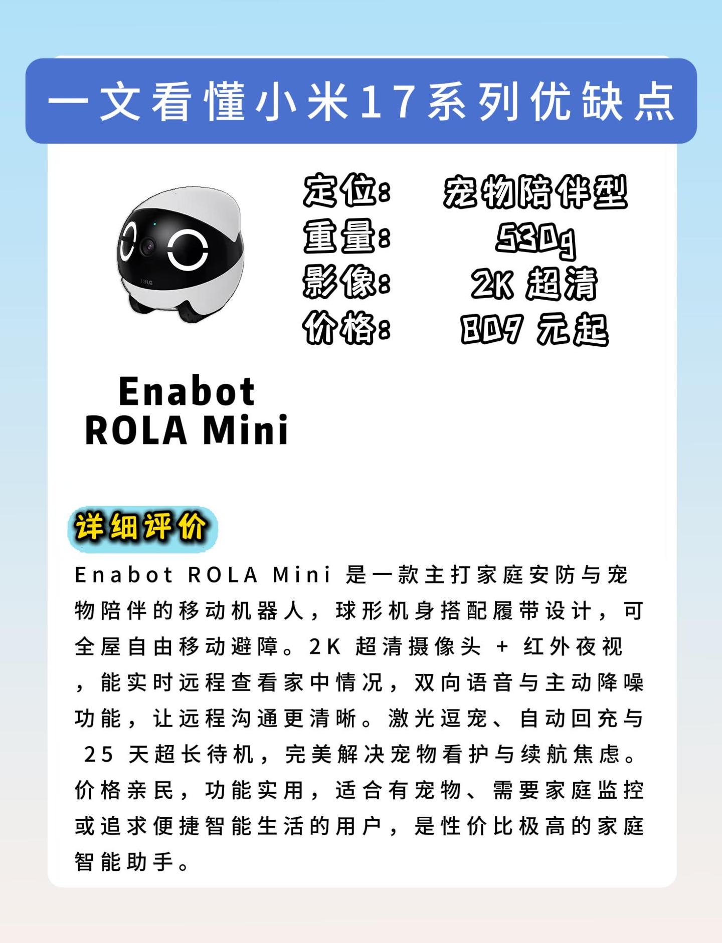 Enabot ROLA Mini则是家庭安防+宠物陪伴的“全能助手”,履带式球形机身,能全屋自由移动避障,2K超清摄像头+红外夜视,远程看家和看宠一目了然。双向语音+主动降噪,远程沟通清晰无杂音,激光逗宠、自动回充功能太省心,25天超长待机彻底告别续航焦虑,价格还亲民。适合有宠物、需要家庭监控,追求实用智能的家庭用户。