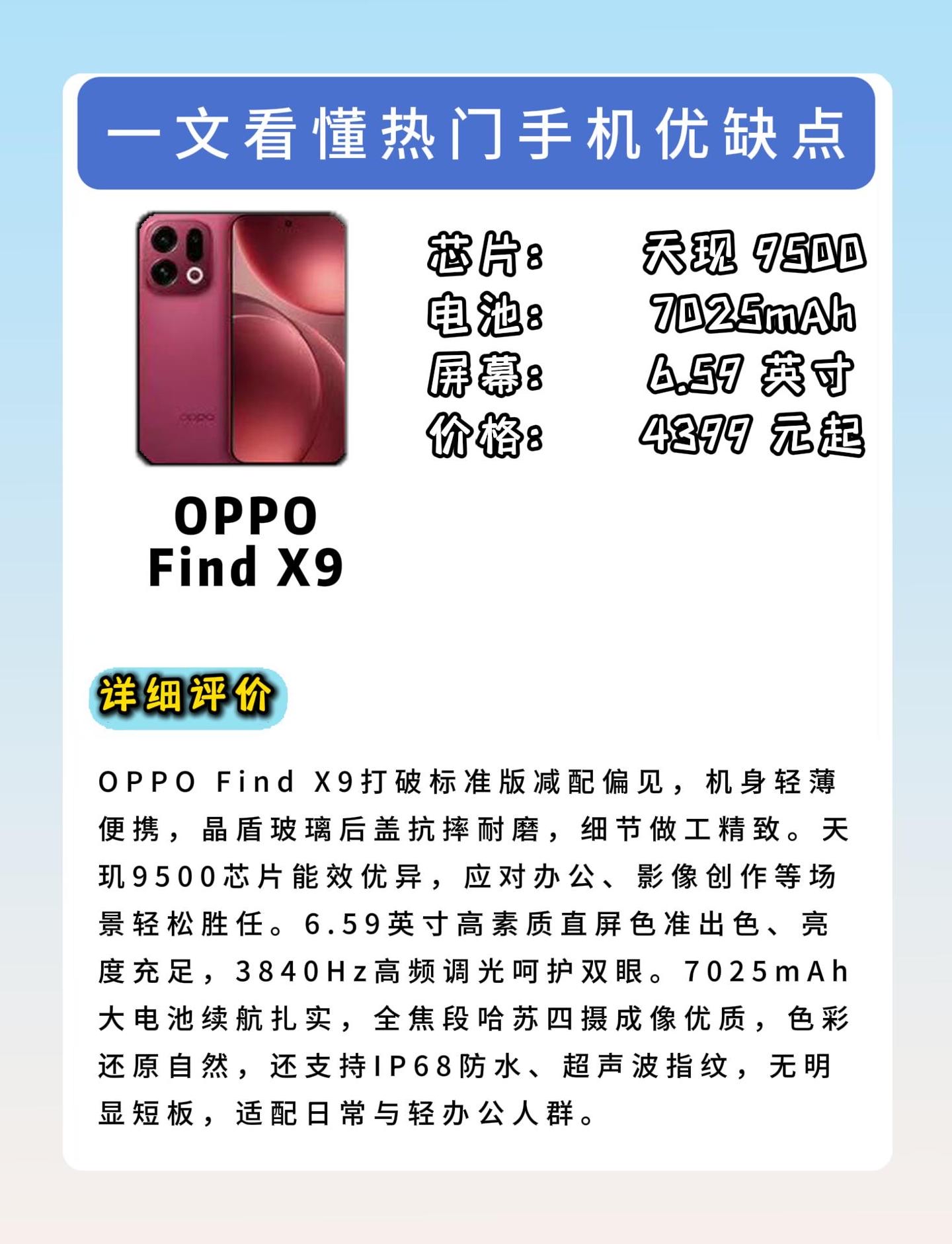 OPPO Find X9走的是精致细腻路线,晶盾玻璃后盖抗摔耐磨,机身轻薄便携,颜值和手感双在线。高素质直屏色准出众,亮度充足,户外强光下也能看清屏幕,3840Hz高频调光护眼到位。7025mAh冰川电池续航稳健,80W快充满足日常补电需求,哈苏调校影像色彩自然,长焦拍远景、主摄拍人像都很出彩,支持IP68防水与超声波指纹,细节体验拉满,适合注重屏幕观感、偏爱原生色彩的用户。