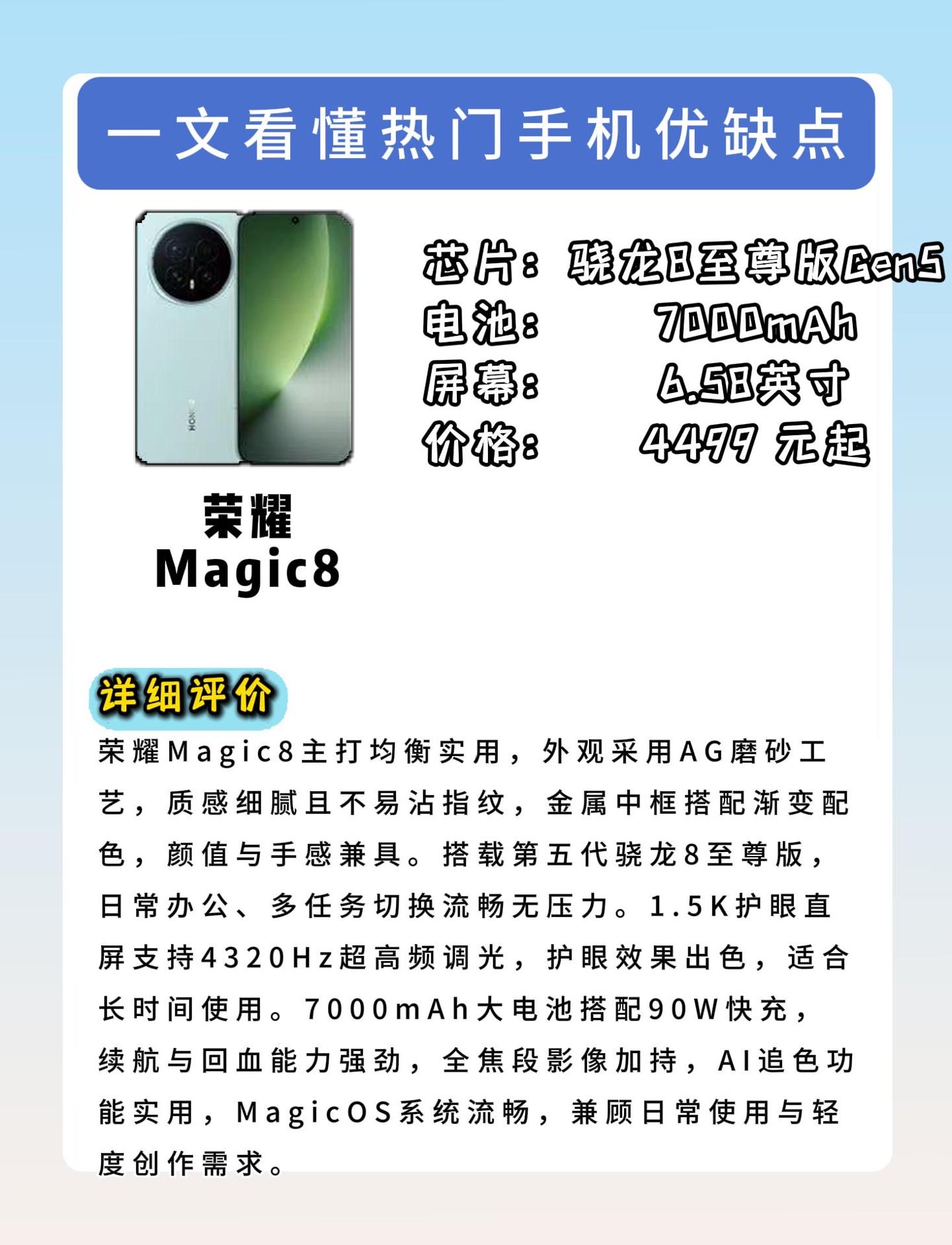 荣耀Magic8主打精致手感与高效体验,AG磨砂机身质感拉满,不沾指纹还耐看,握在手里辨识度十足。搭载旗舰骁龙芯片,多任务切换、办公软件运行丝滑不卡顿,1.5K护眼屏显示清晰,长时间看文档、追剧不易眼疲劳。7000mAh青海湖电池续航扎实,90W有线+80W无线快充,回血速度超快,全焦段影像成像通透,AI调校很省心,MagicOS流畅度拉满,无冗余功能,适合看重机身质感、偏爱快充的职场人群。
