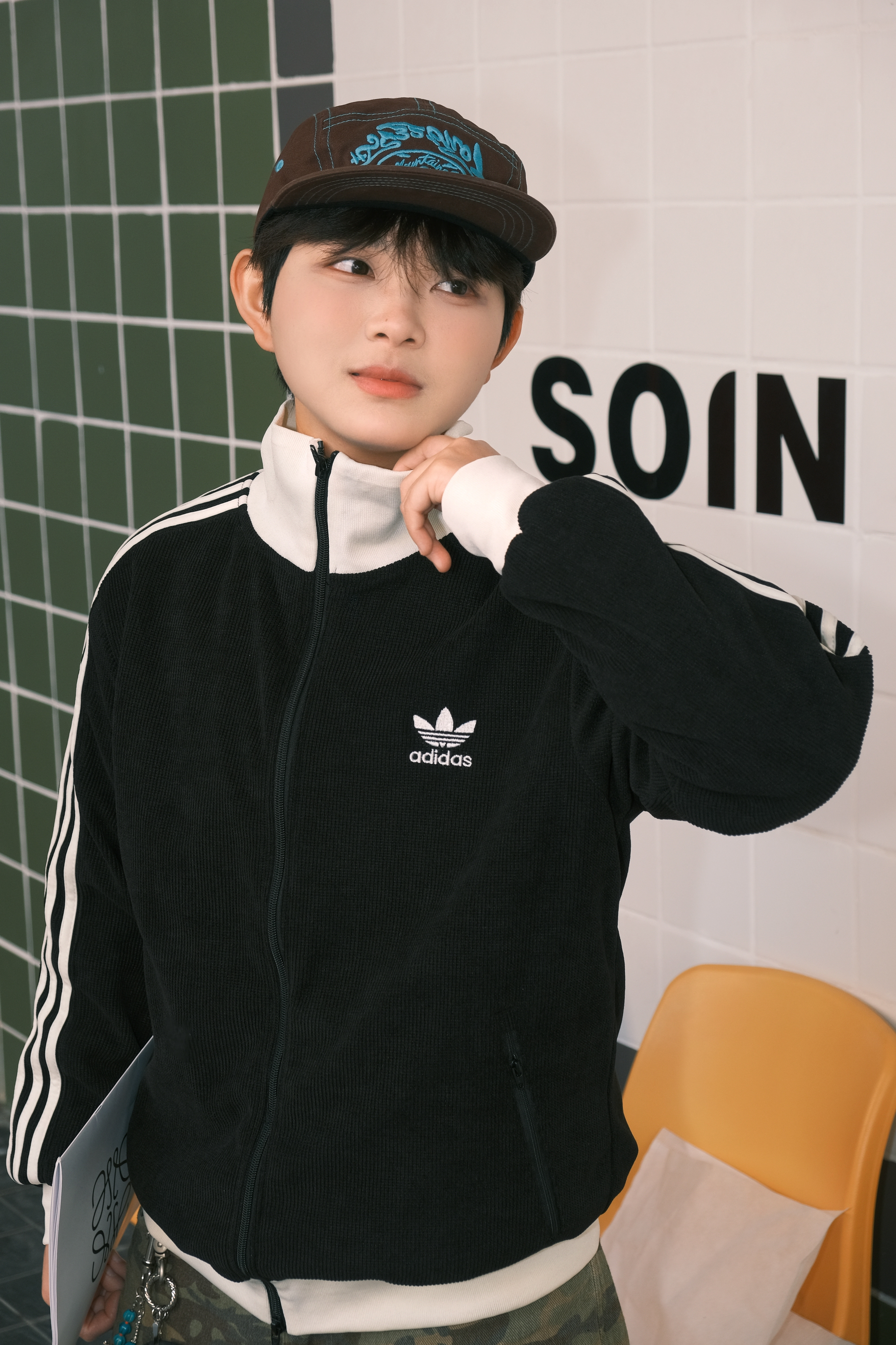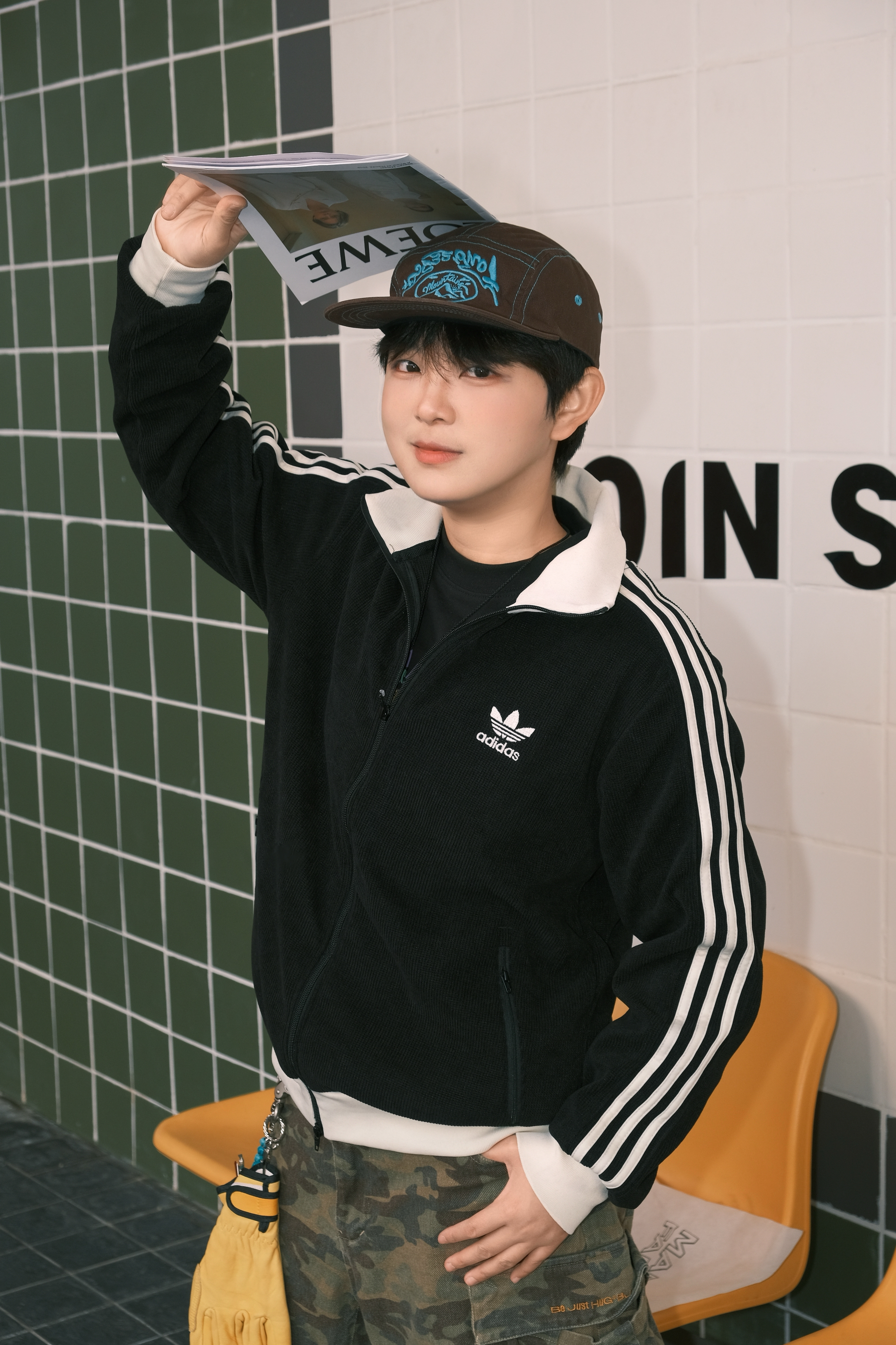 把运动穿进日常,不用刻意奔赴,自在就是最好的状态 • 黑白撞色外套,经典三条纹自带随性气场 • 灯芯绒面料软糯有质感,运动风也能很温柔 • 内搭黑衫+迷彩裤,简单叠穿就有层次感 • 一顶棒球帽,轻松拿捏随性少年气