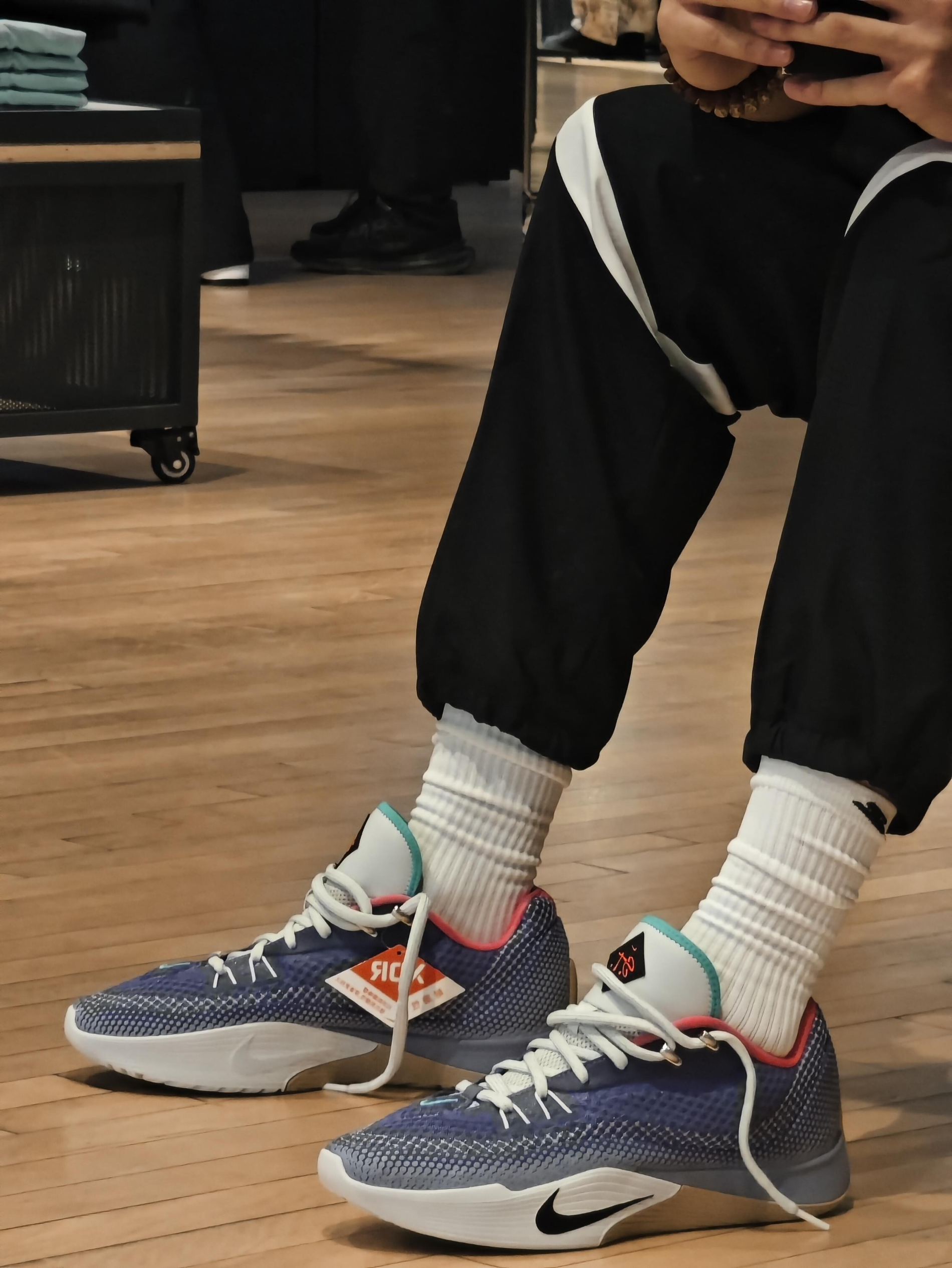 渐变紫鞋面碰撞粉绿撞色细节,Nike这双直接把实战硬实力和潮流辨识度双双拉满。 编织鞋面在球馆灯光下自带高级光泽,鞋舌个性标识、撞色鞋口处处暗藏小心机,每一次突破、变向、起跳都自带高光滤镜。 搭黑白运动裤+堆堆白袜,运动型男的氛围感直接拉满。 上场能杀穿防线,下场能炸街吸睛,妥妥的球鞋界双面王者,全场焦点非你莫属。