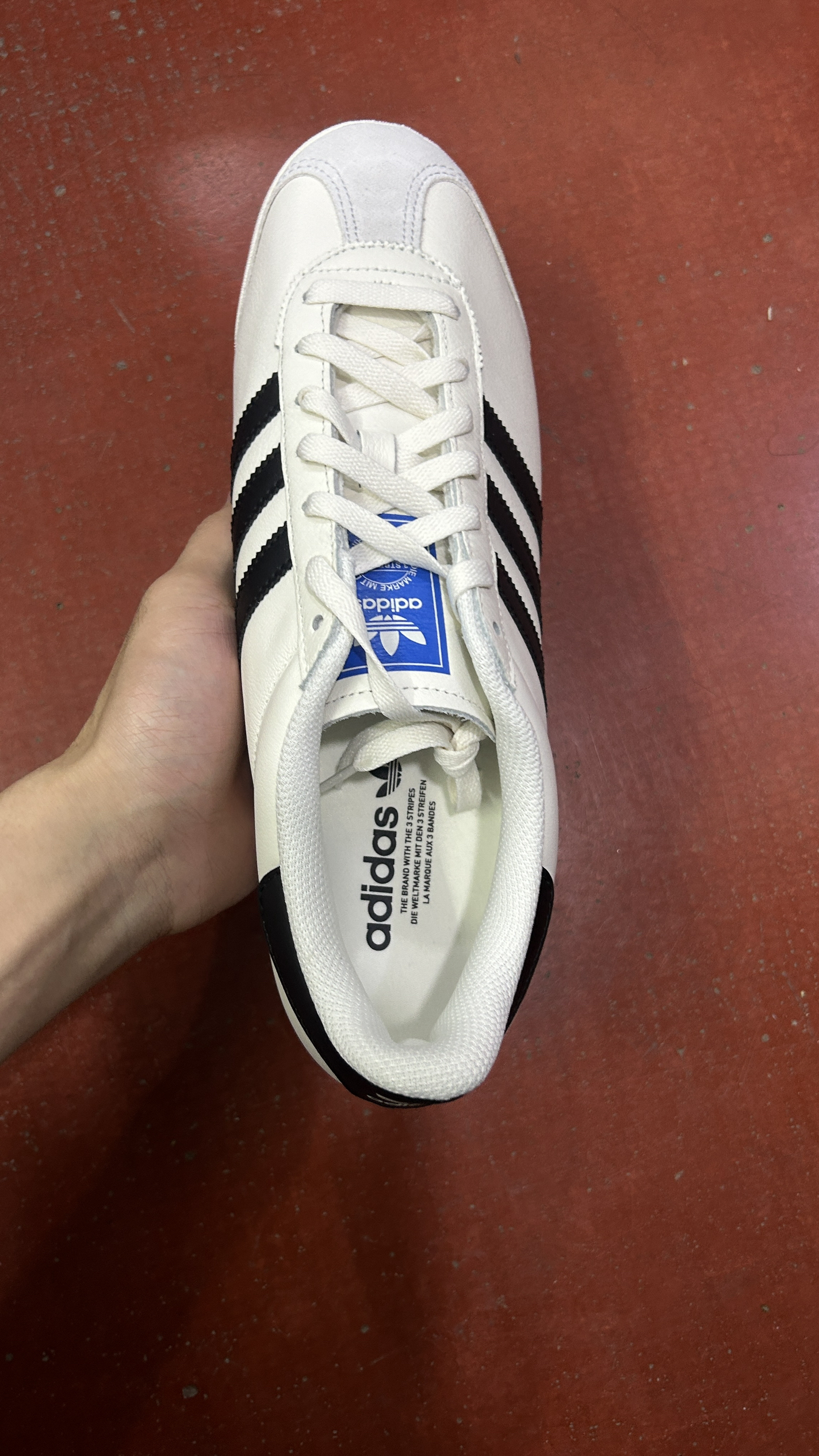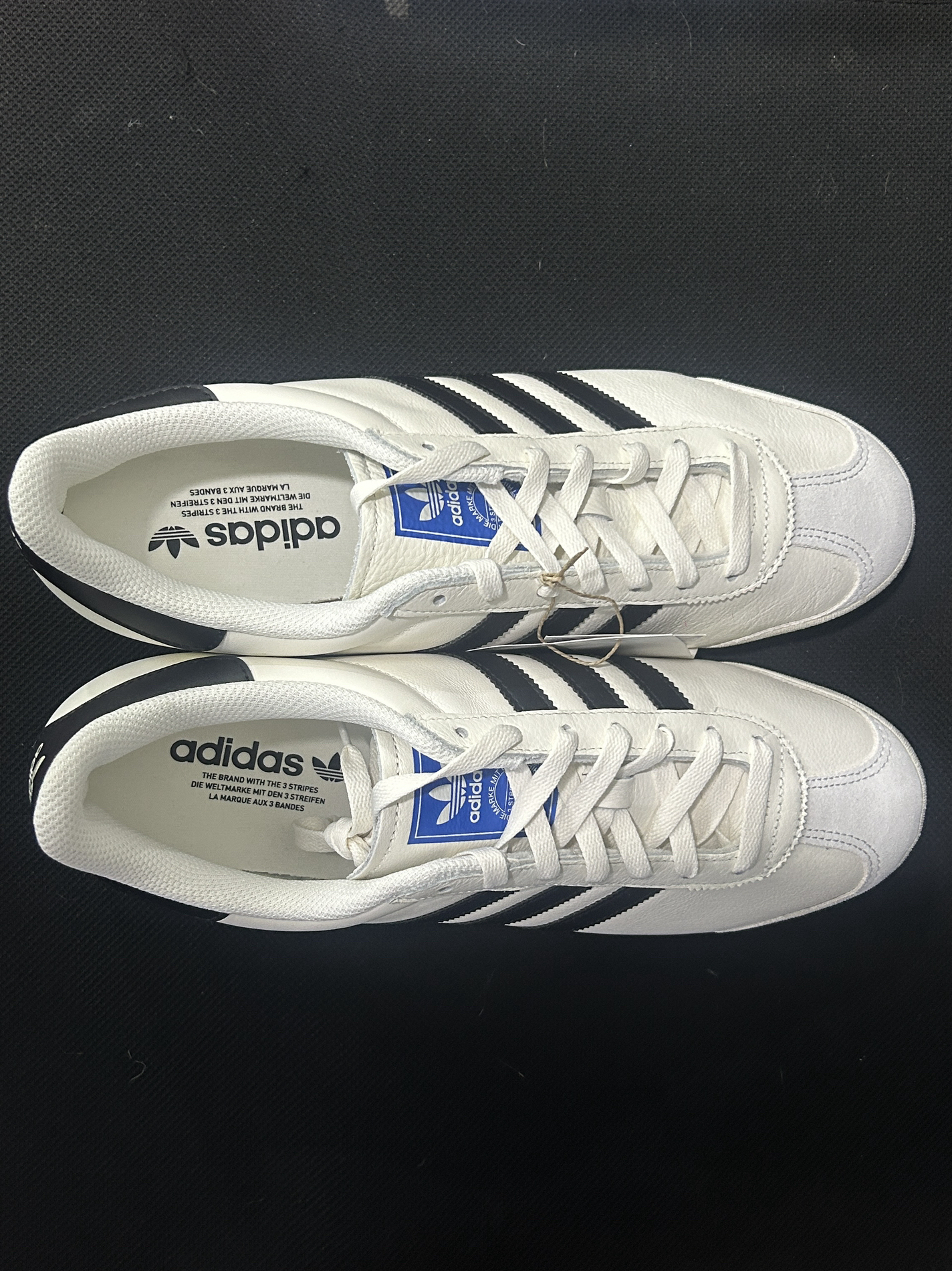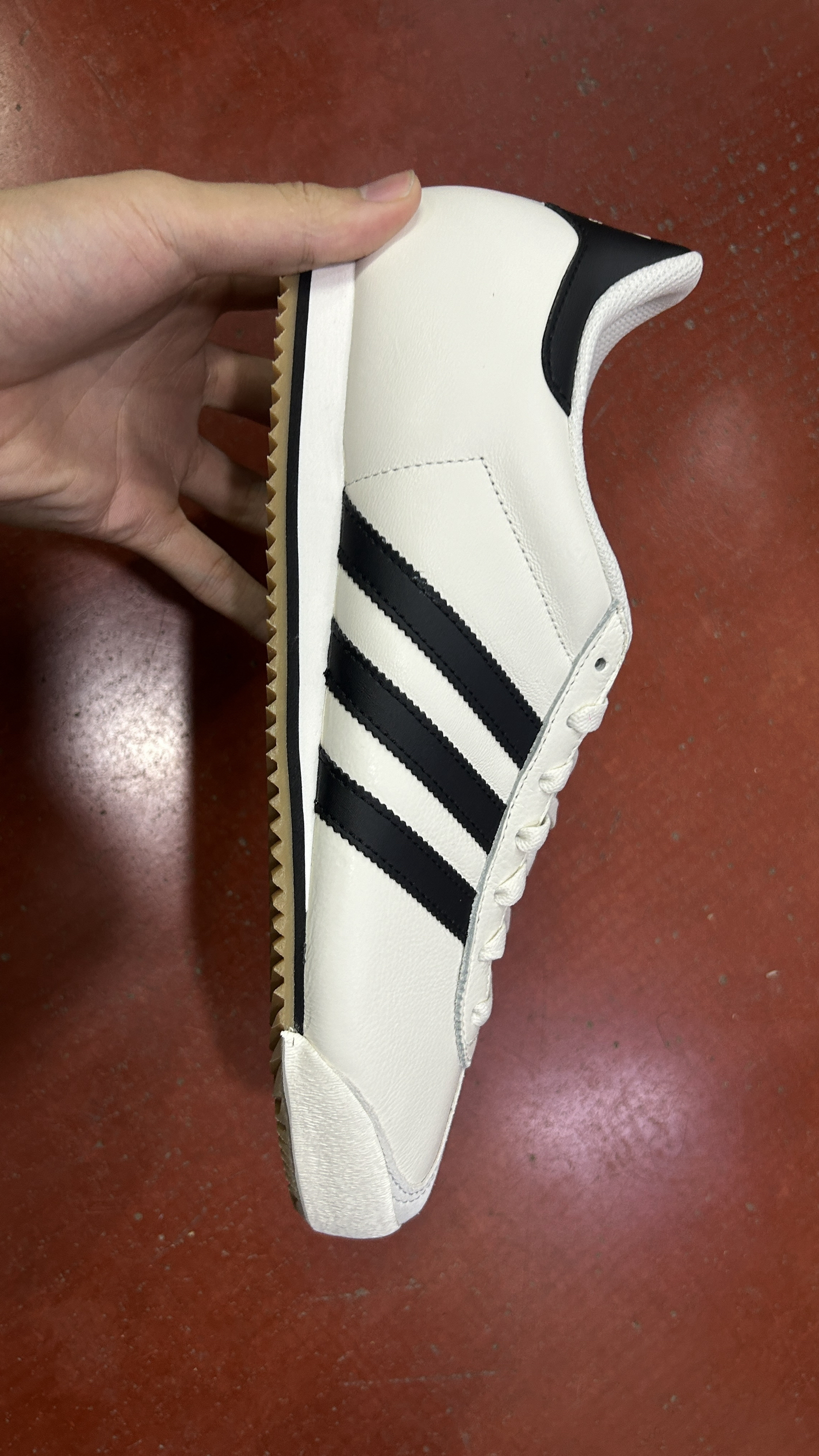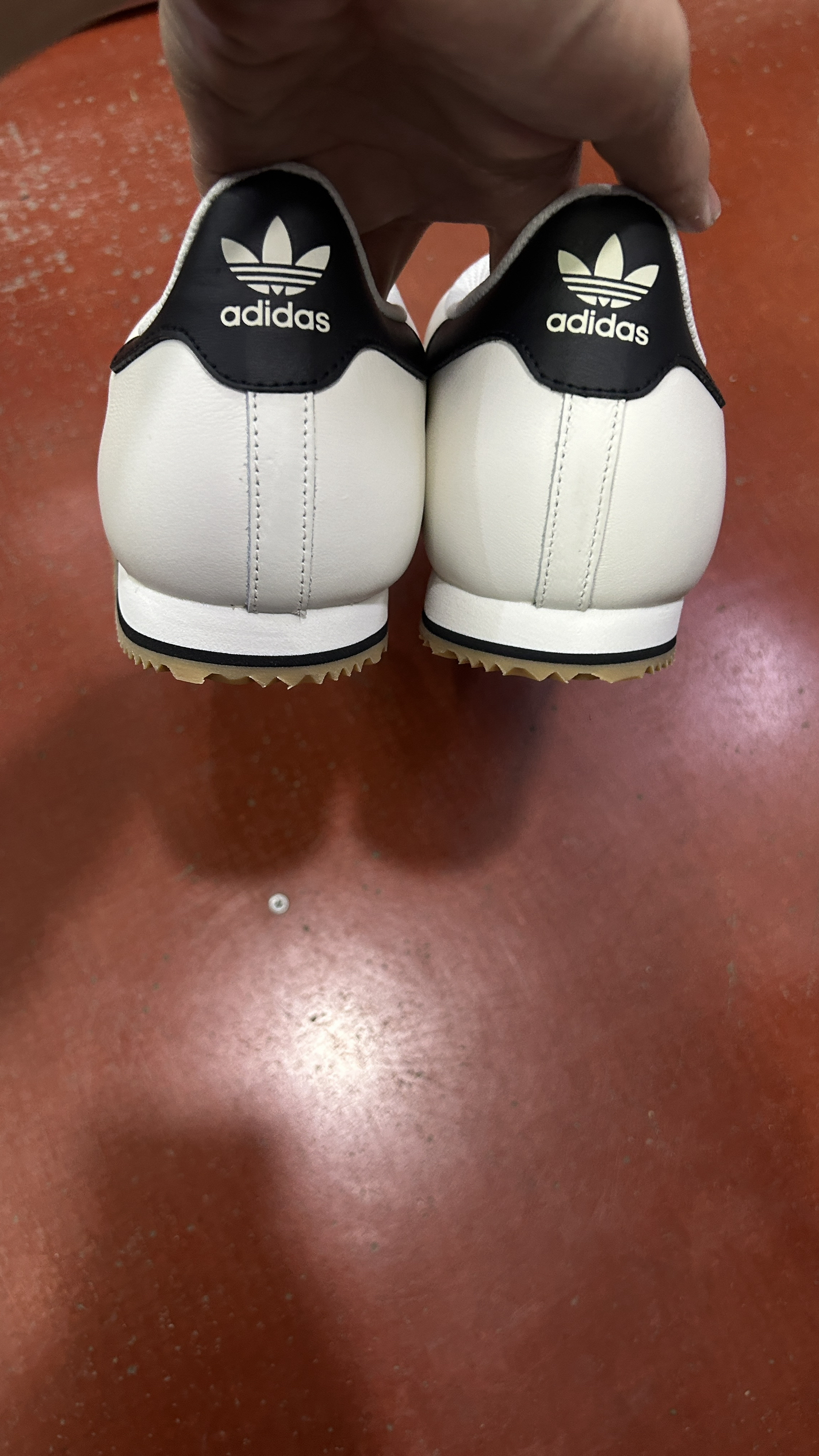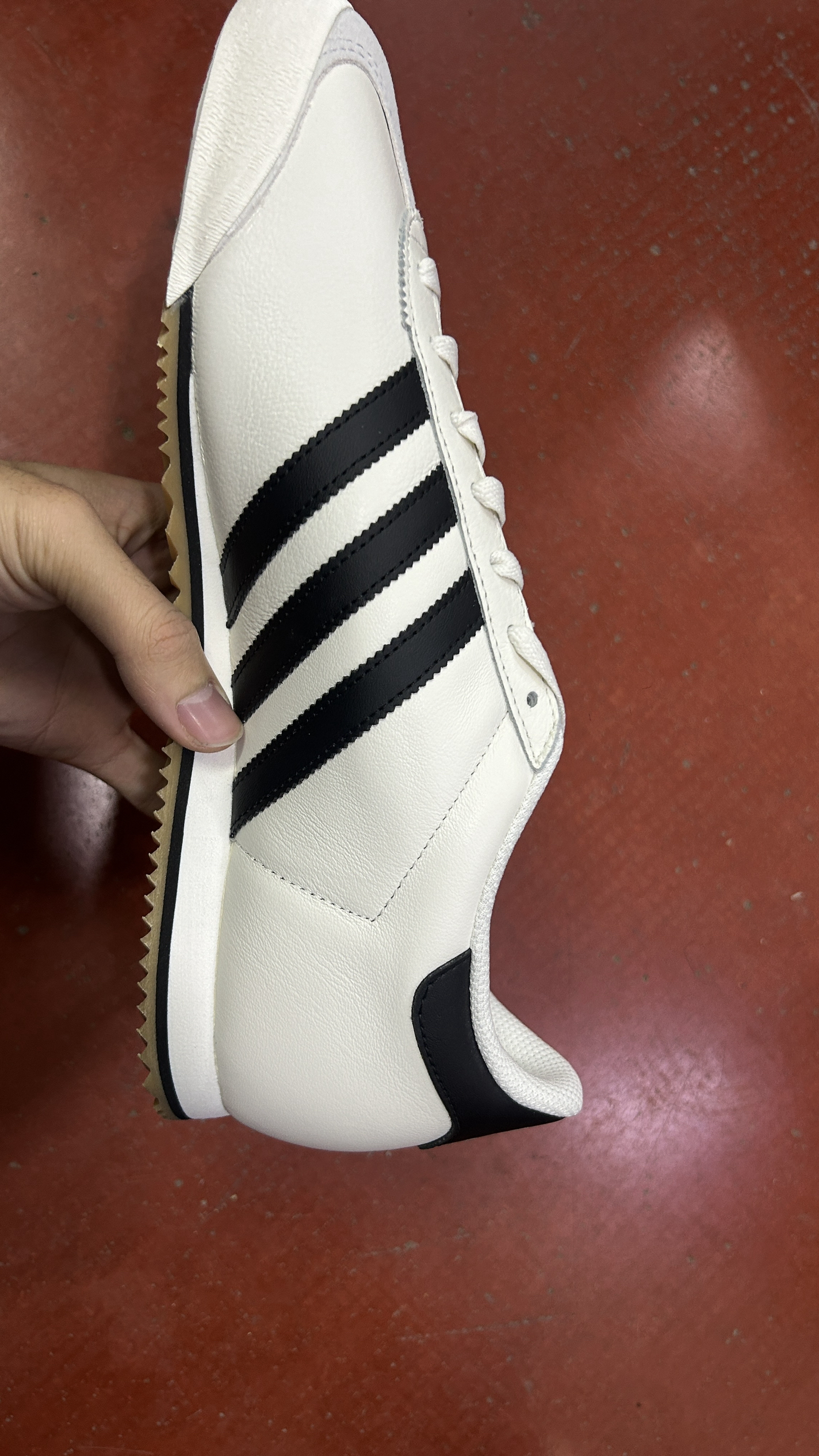 刚拆箱!adidas K74白黑生胶,整体是荔枝纹皮面,摸着挺扎实有质感,就是鞋头那块是麂皮材质,看着复古但确实容易脏,清理起来要费点劲。 鞋型比Samba更修长秀气,三条杠压纹很精致,生胶锯齿底是灵魂,复古味儿直接拉满,配牛仔裤特别好看,目前还没怎么撞款,就是麂皮鞋头得小心伺候~