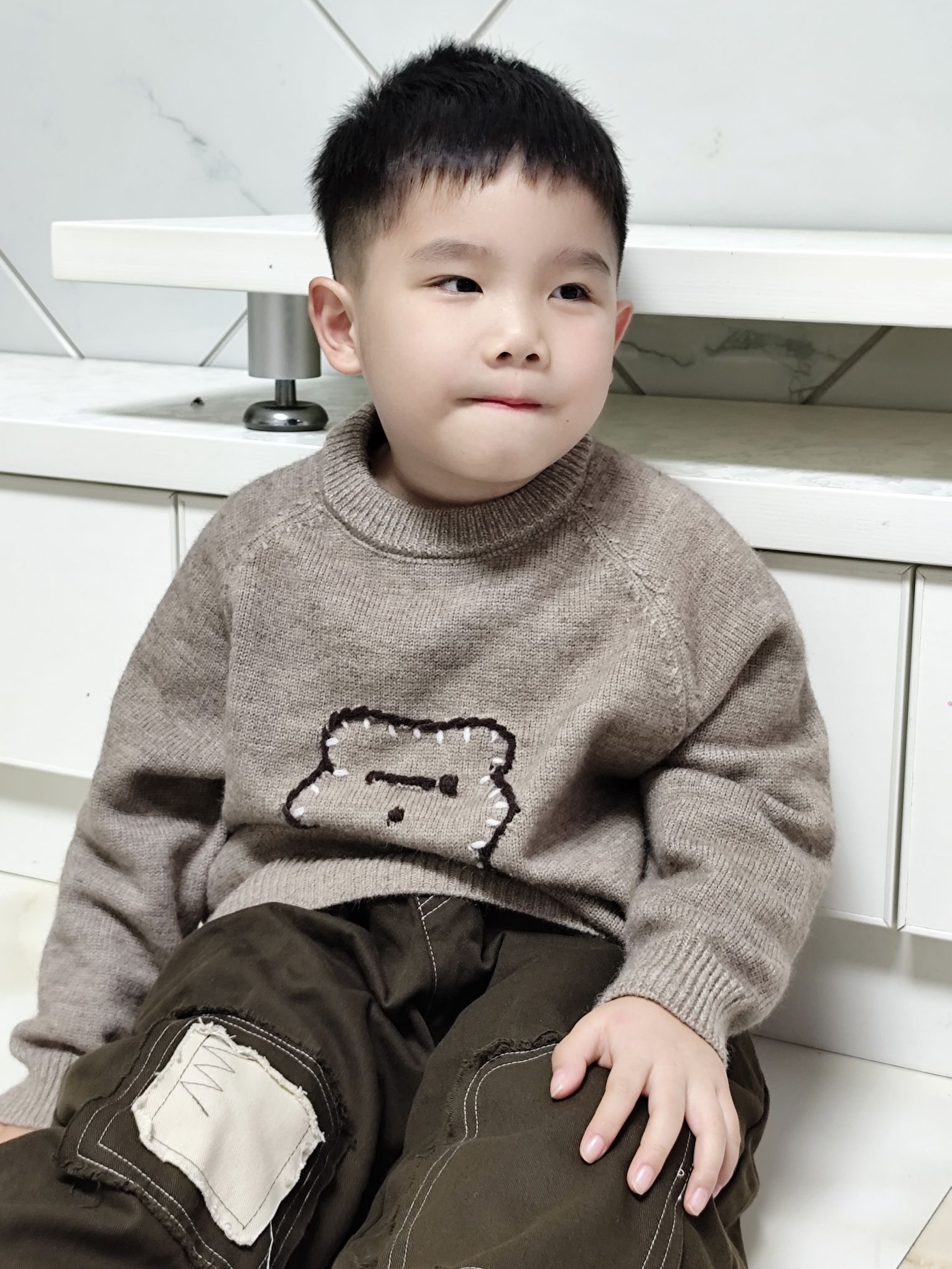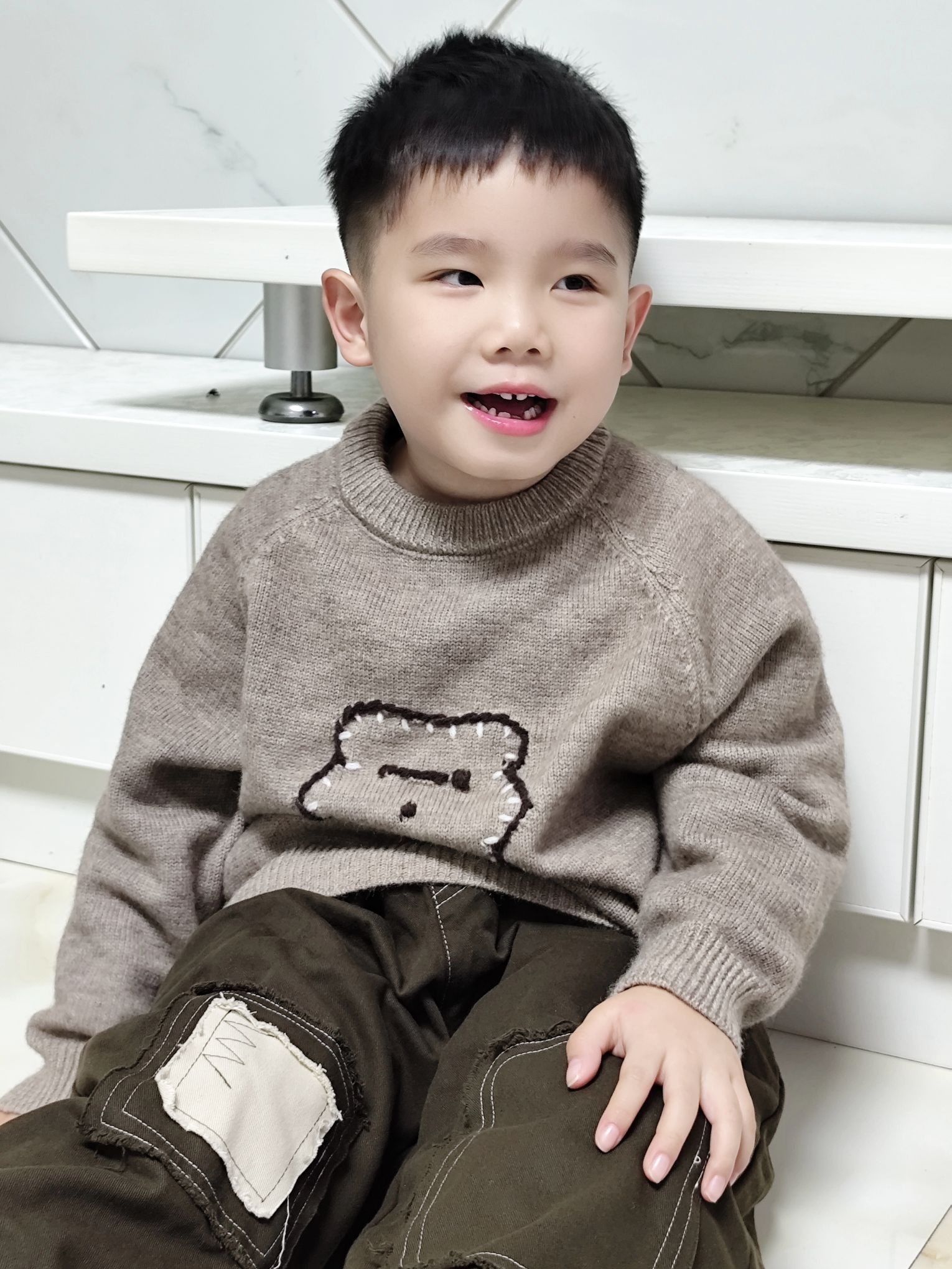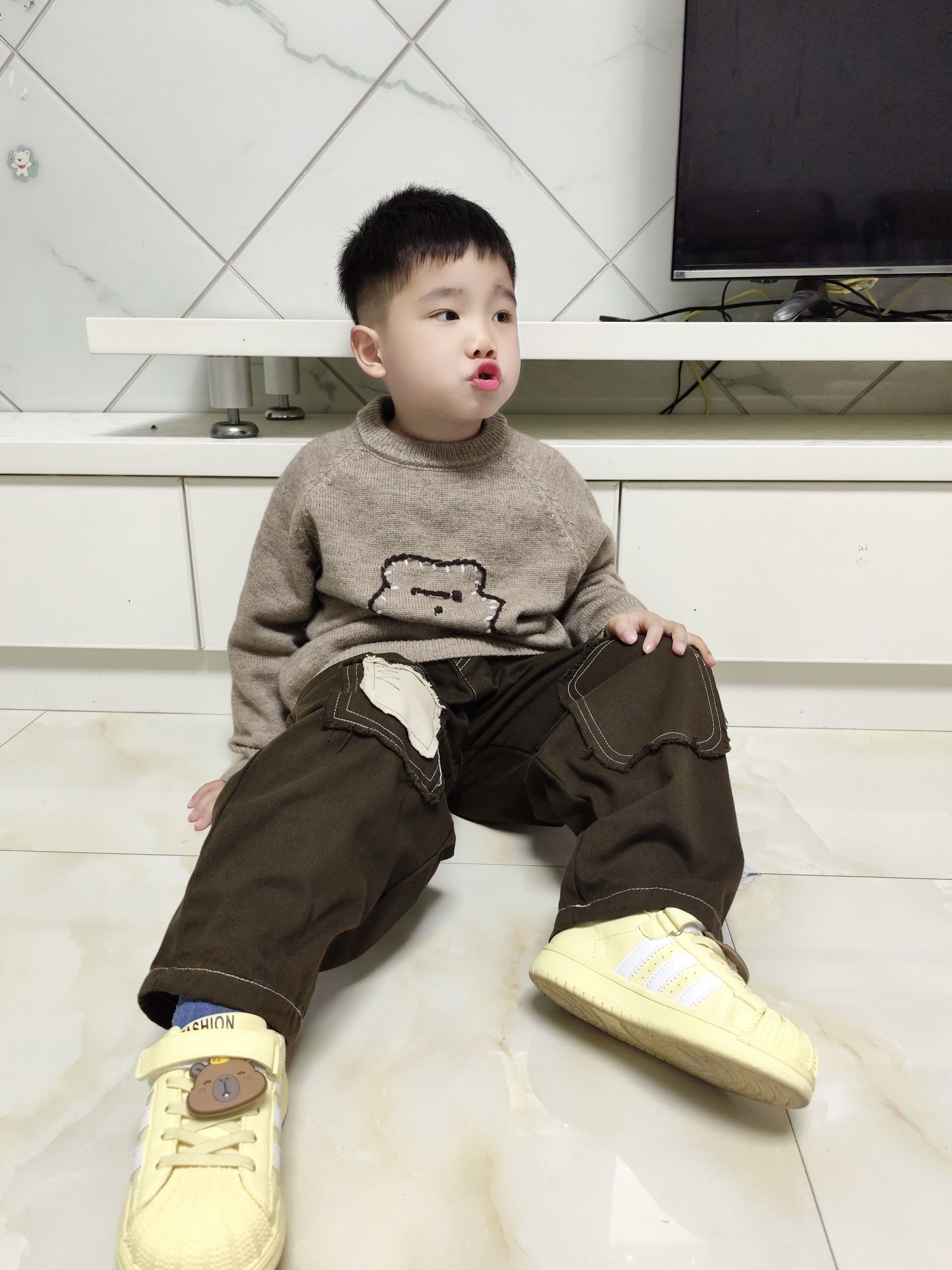 欢迎来到宸宝分享空间👏 身高:120cm 体重:23㎏ 衣服尺码:120 鞋子尺码:30 今天宸宝穿的浅卡其色小熊毛衣自带暖糯滤镜,刺绣小熊奶fufu的,软乎乎好rua的样子~搭配深棕做旧工装裤,破洞+贴布设计潮味拉满,宽松版型跑跳都舒服!最后踩双奶黄板鞋,整套低饱和色系温柔又耐看,谁看了不说一句“这娃衣品绝了”😎,喜欢的宝妈可以照公式搭配起来吧!