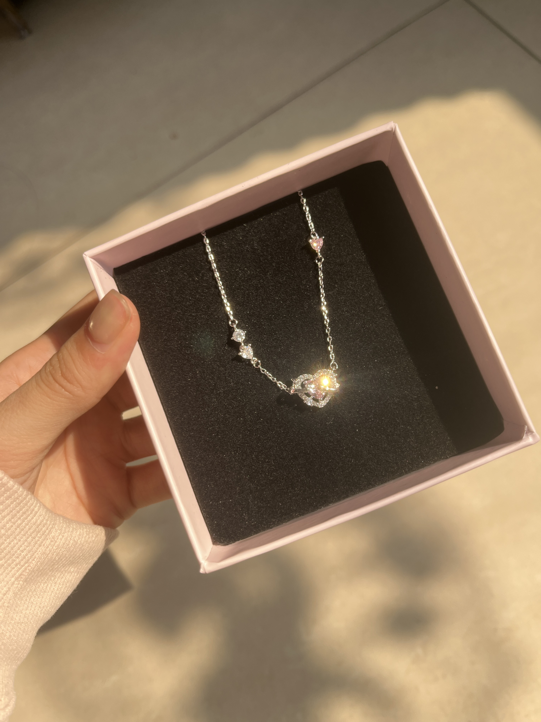 这款项链简直太好看了!在阳光下特别闪,很显气质,真的对闪闪发光的东西毫无抵抗力!项链不会过长,佩戴上正正好,而且搭配毛衣戴也很合适!整体更显气质,精致十足,爱心粉锆石的设计显得格外灵动,很独特的设计风格,令人眼前一新,毫不夸张,低调的同时不失优雅,很推荐!