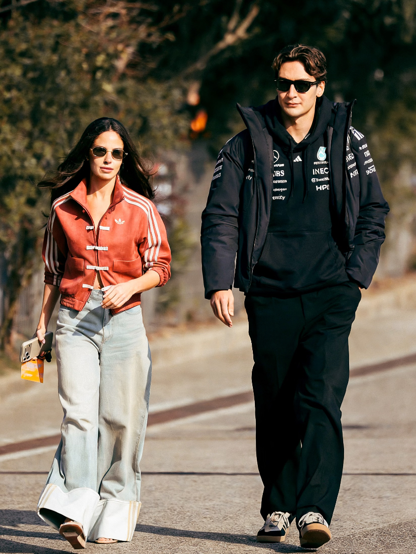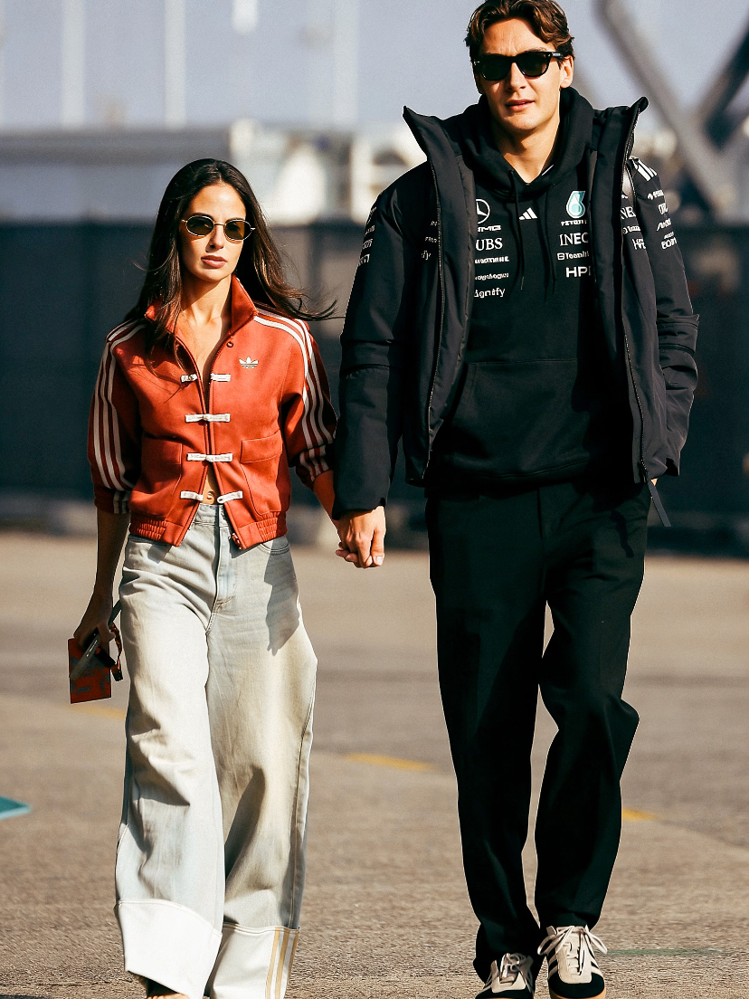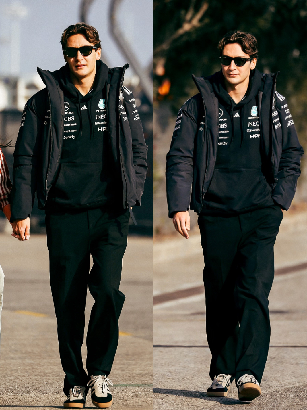 F1车手乔治·拉塞尔的这套穿搭是运动休闲风和商务休闲感的结合,低调又有质感,情侣出街黑红撞色也太好磕了💘