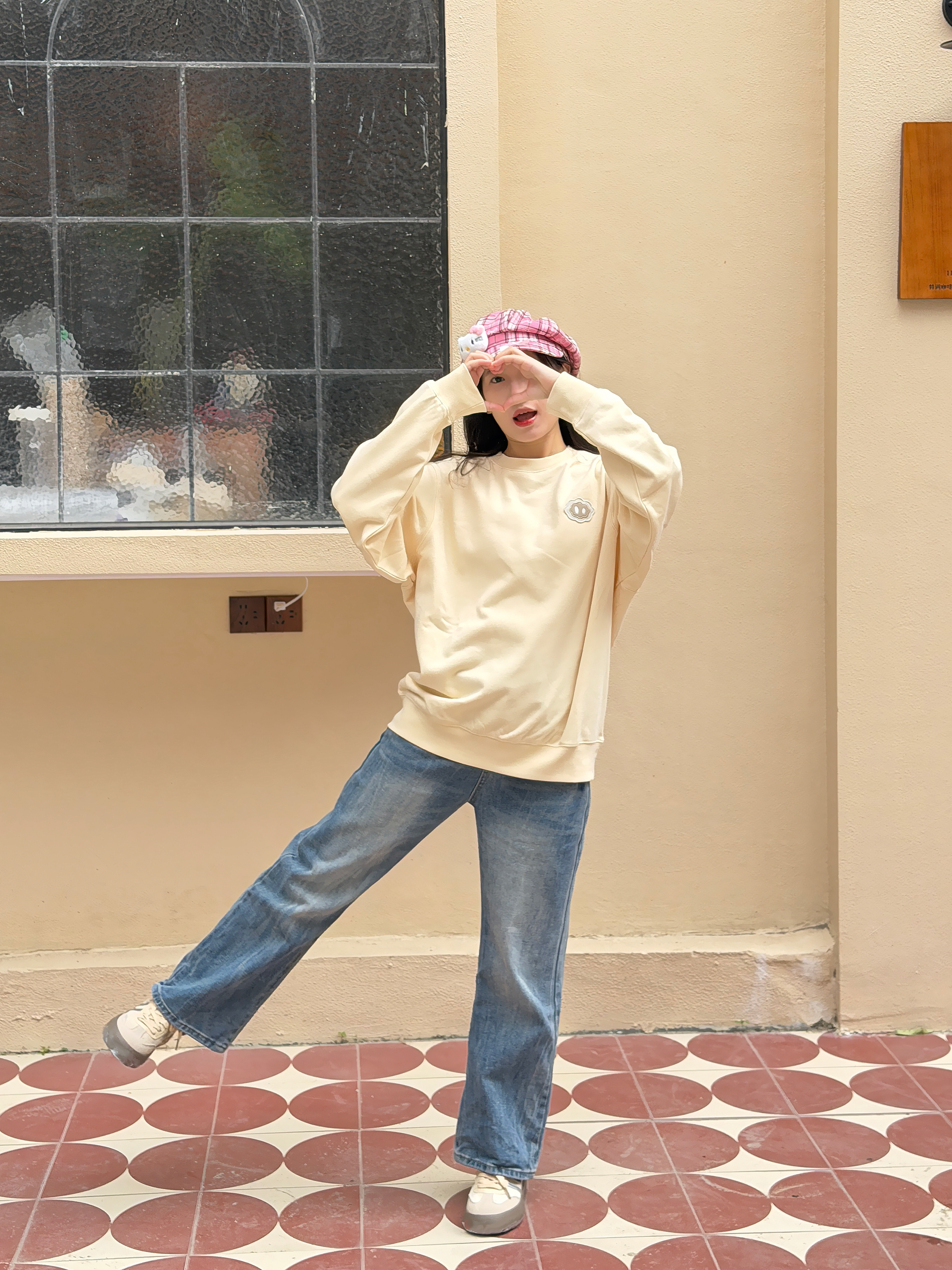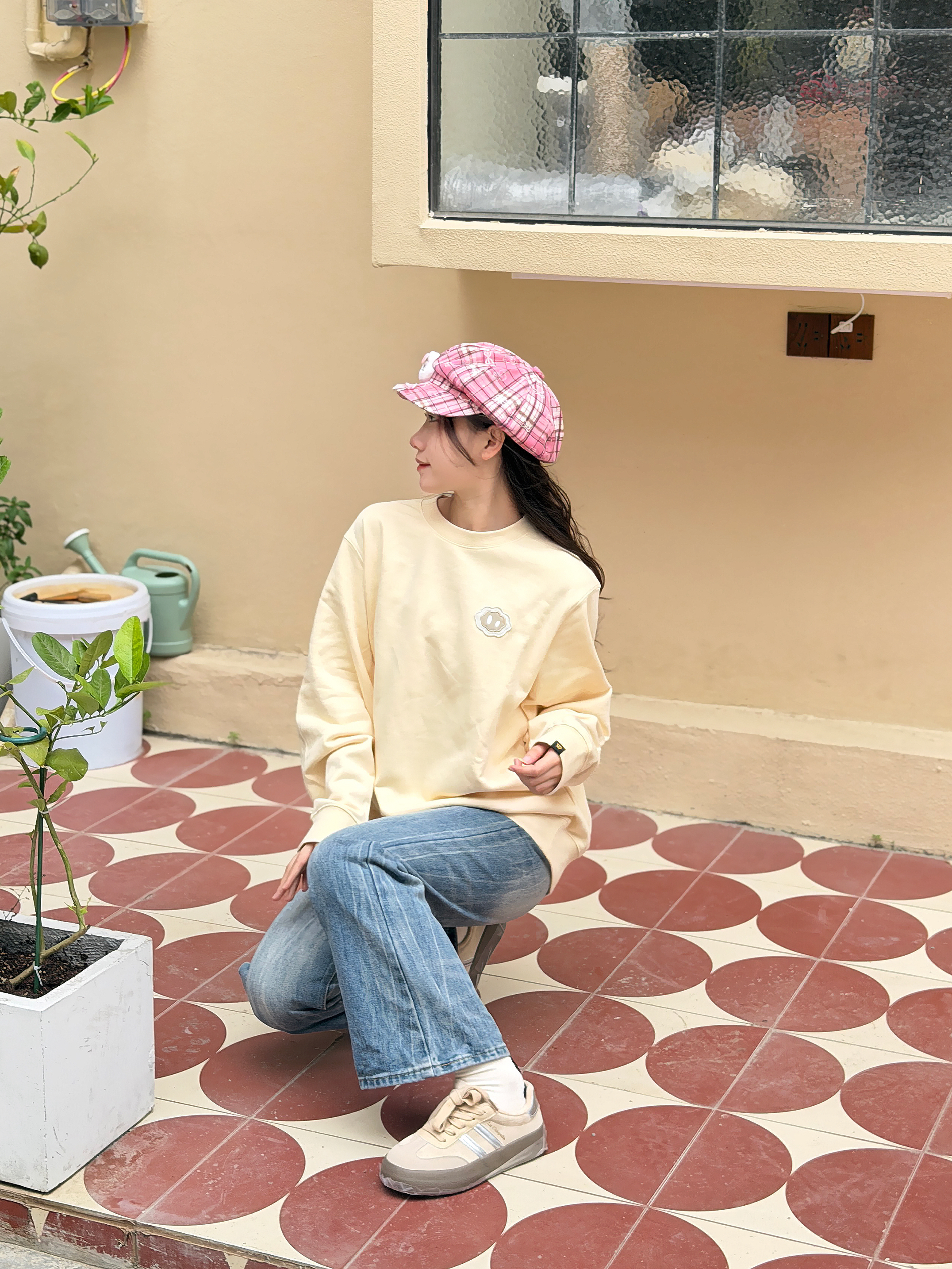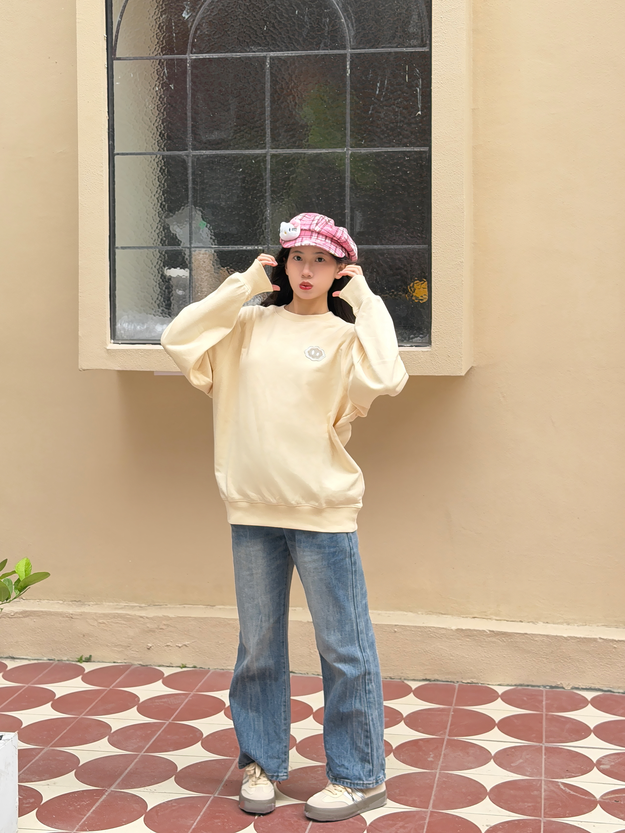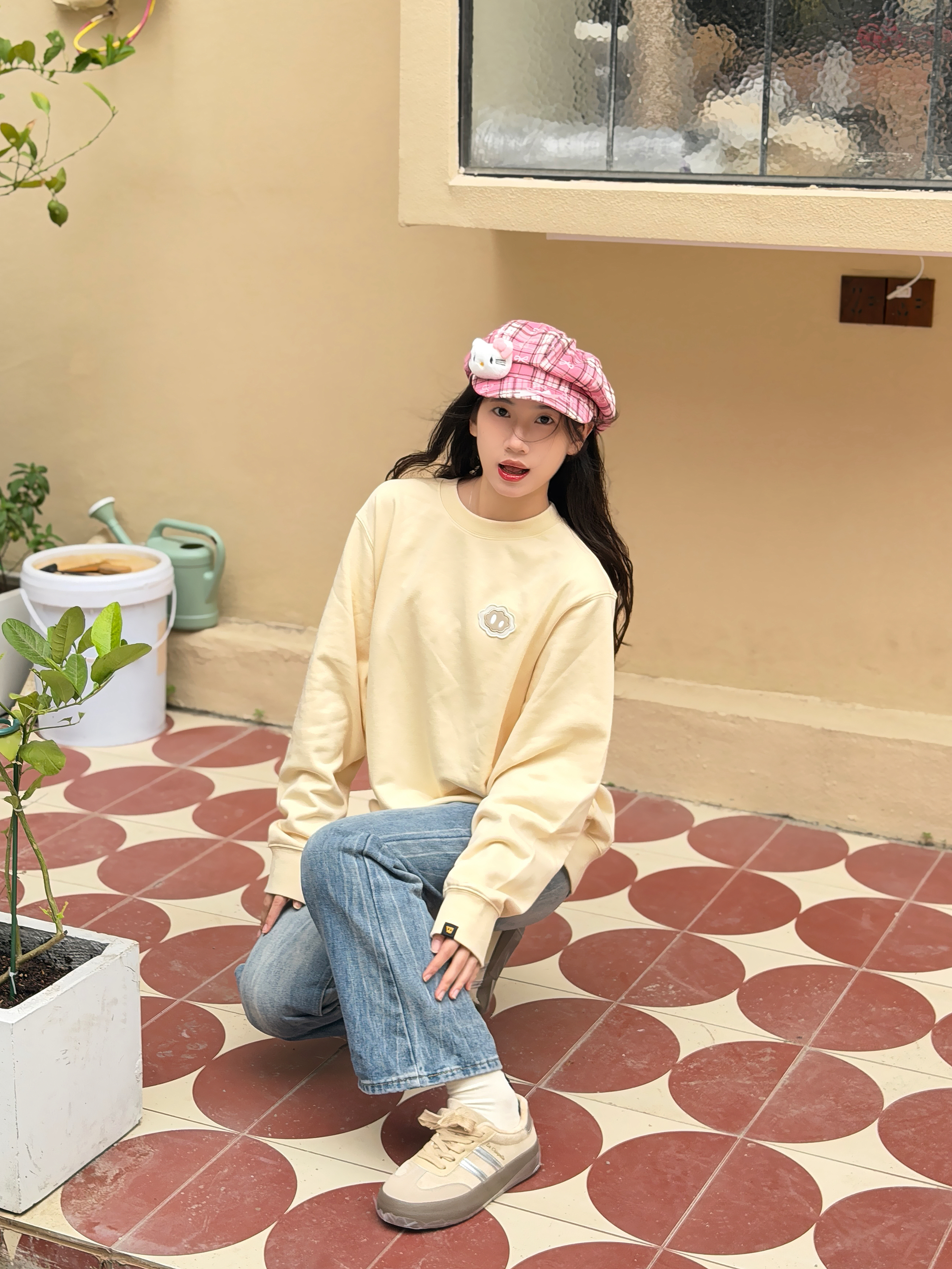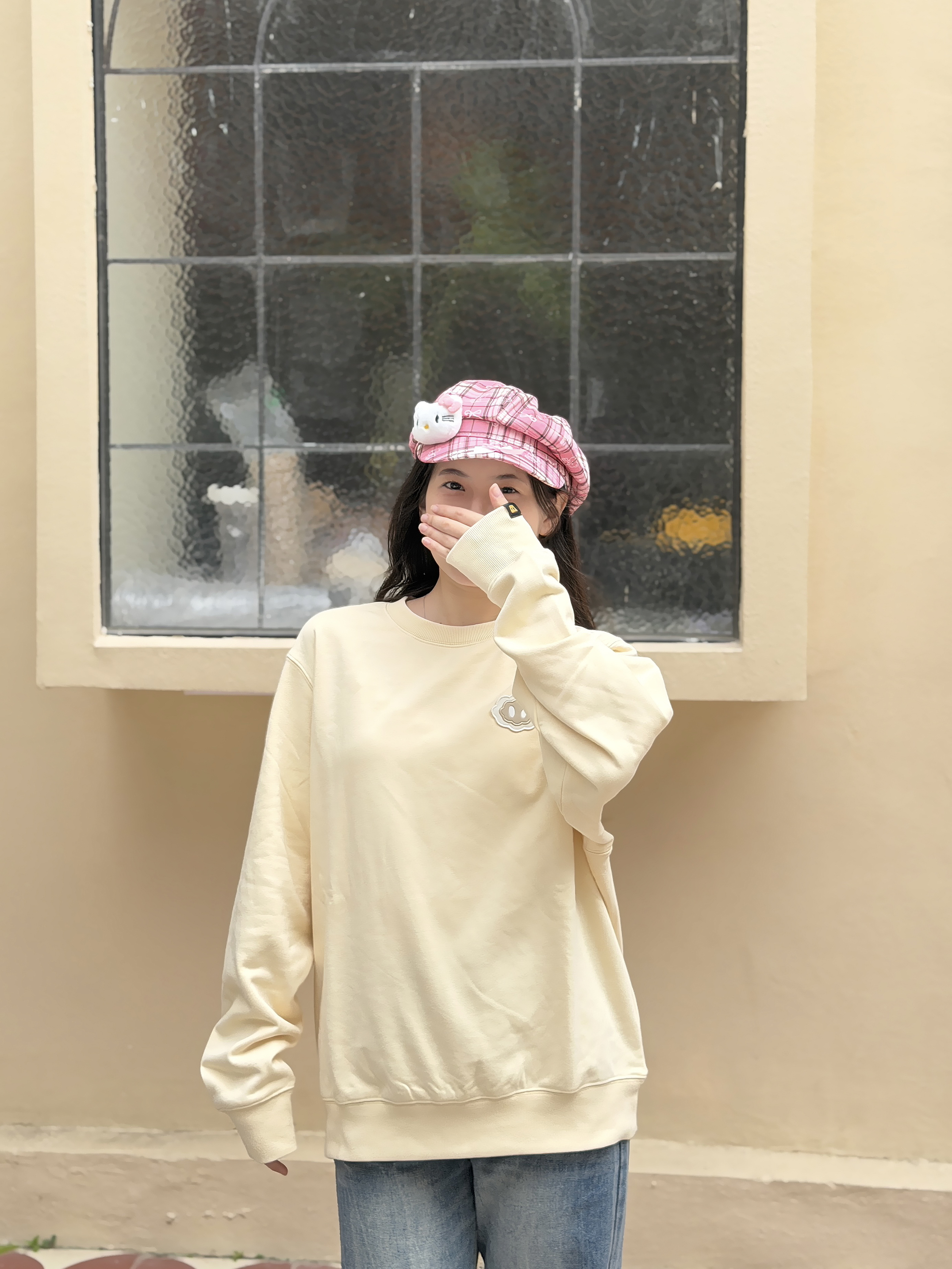 风里已经有春天的味道了~ 奶fufu的浅黄卫衣软糯又舒服 宽松版型藏肉显瘦,胸口小刺绣细节满满,温柔又显白。 搭配粉格HelloKitty贝雷帽 甜妹感直接拉满 和春日的阳光太适配啦! 慵懒又元气,把春天的温柔穿在身上✨