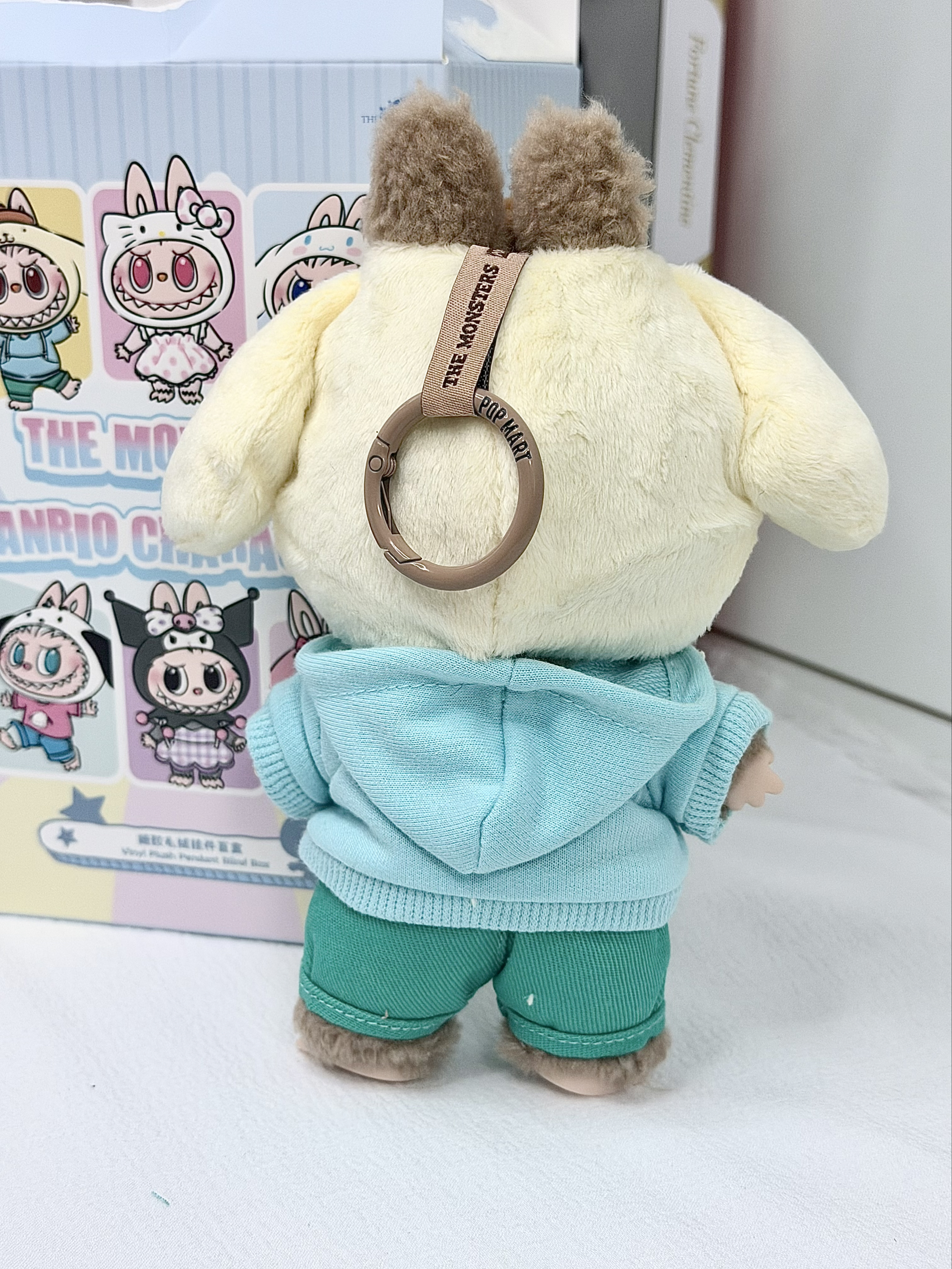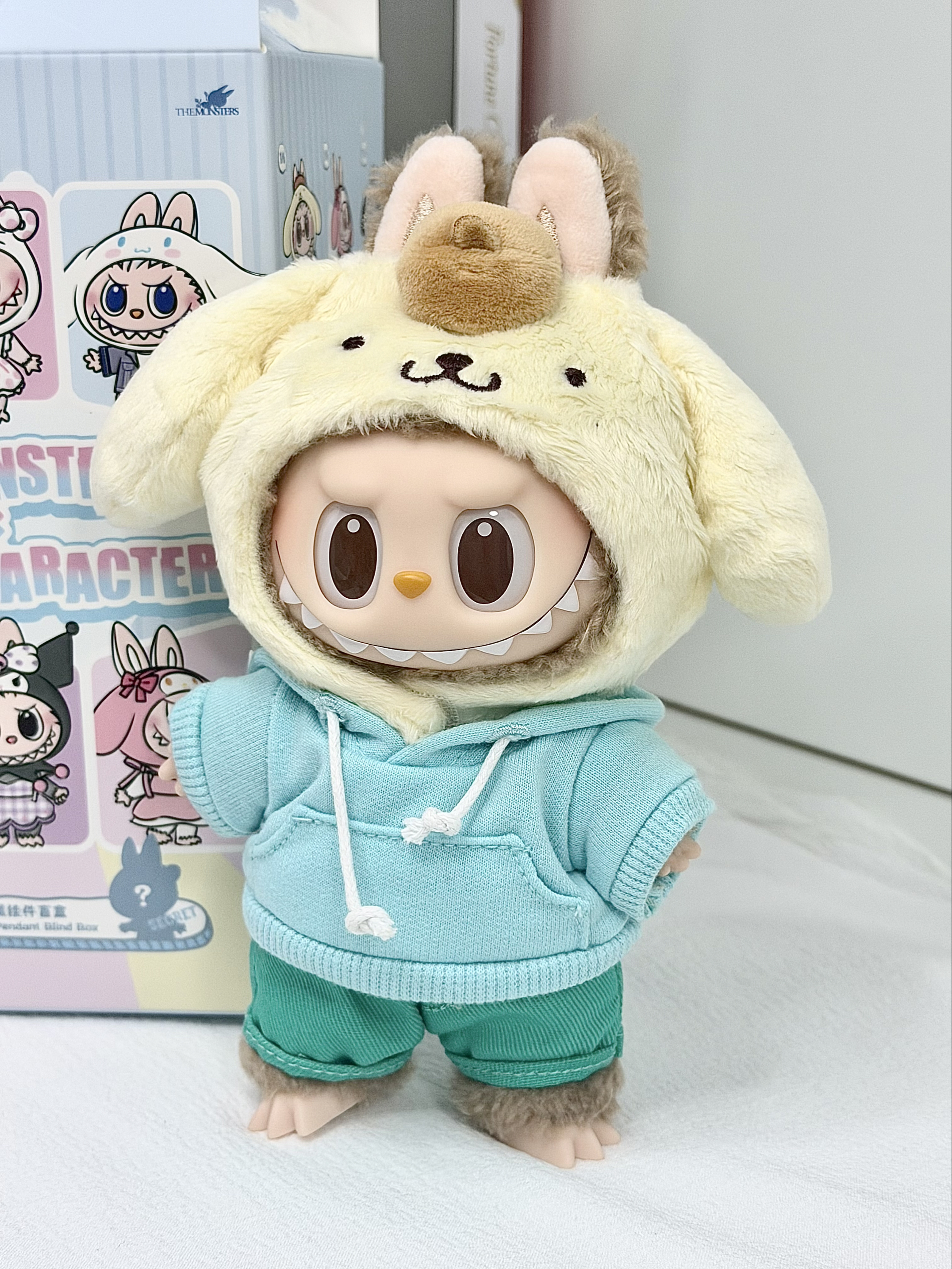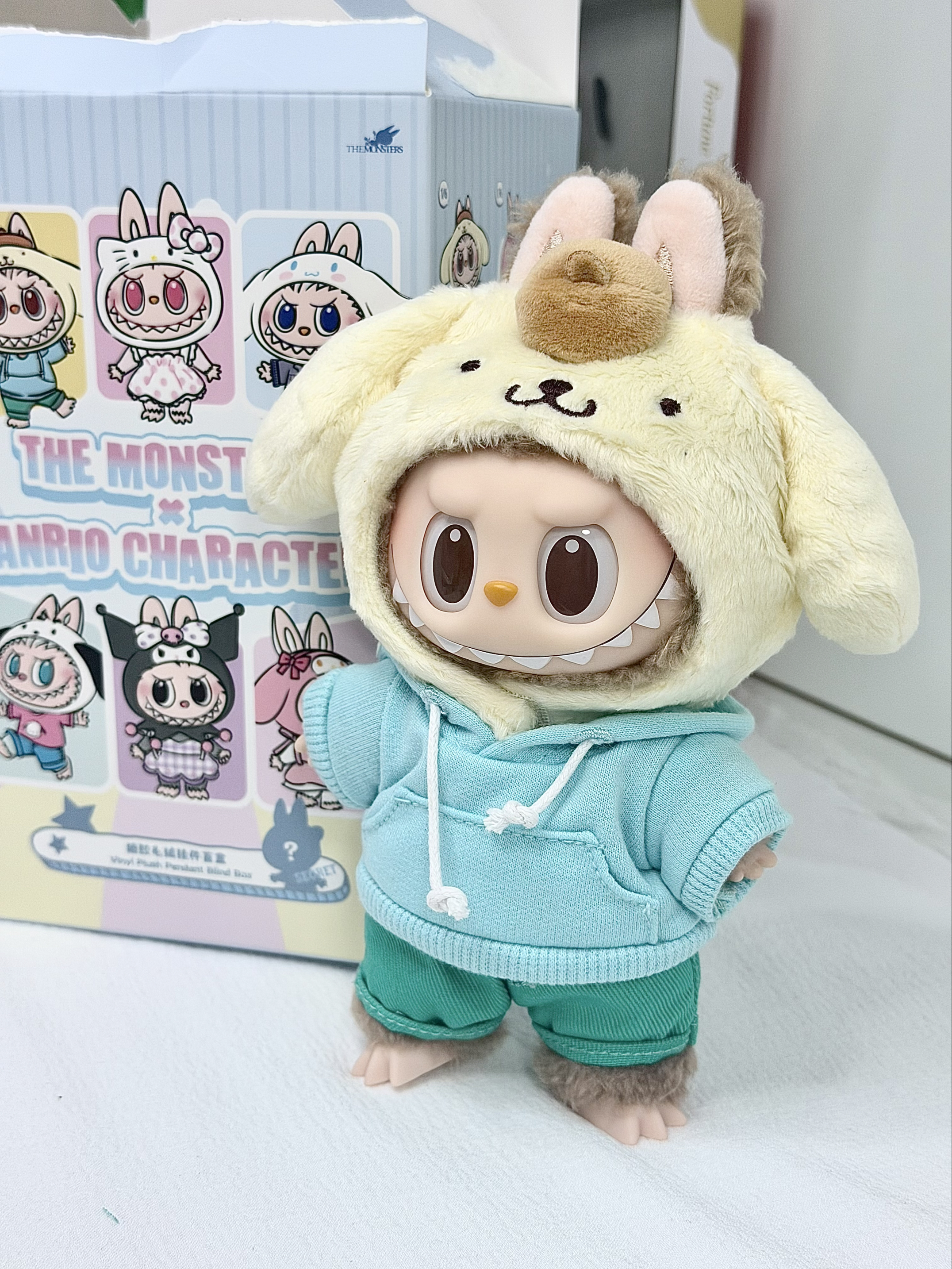 这个labubu三丽鸥联名款 听说布丁狗是普通款 不热? 但是看到实物好喜欢😍 比照片好看🥰 完全就是一代太妃糖穿了布丁狗🍮的外皮~ 奶fufu的布丁狗头套+经典尖牙脸,反差萌拉满✨ 浅蓝卫衣+绿裤子的休闲穿搭 软乎乎的手感超好rua!