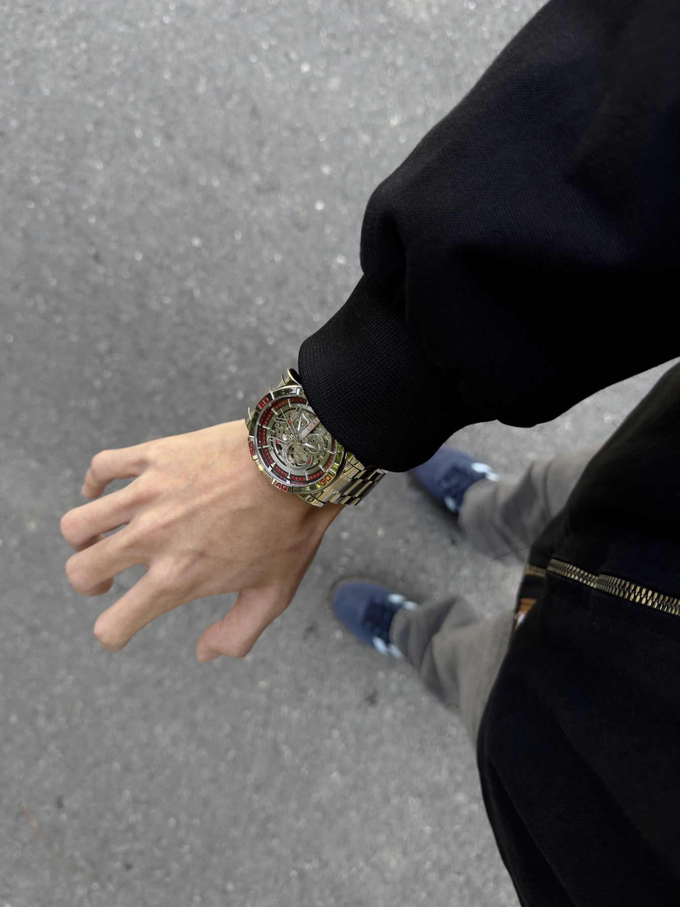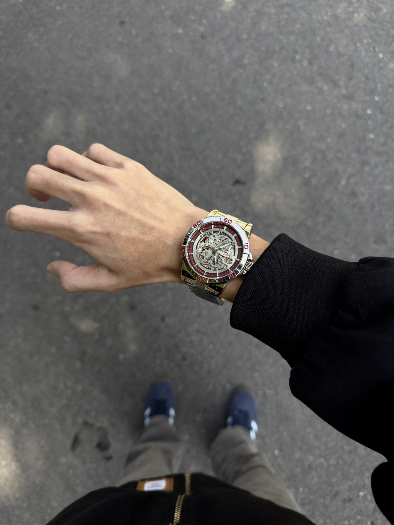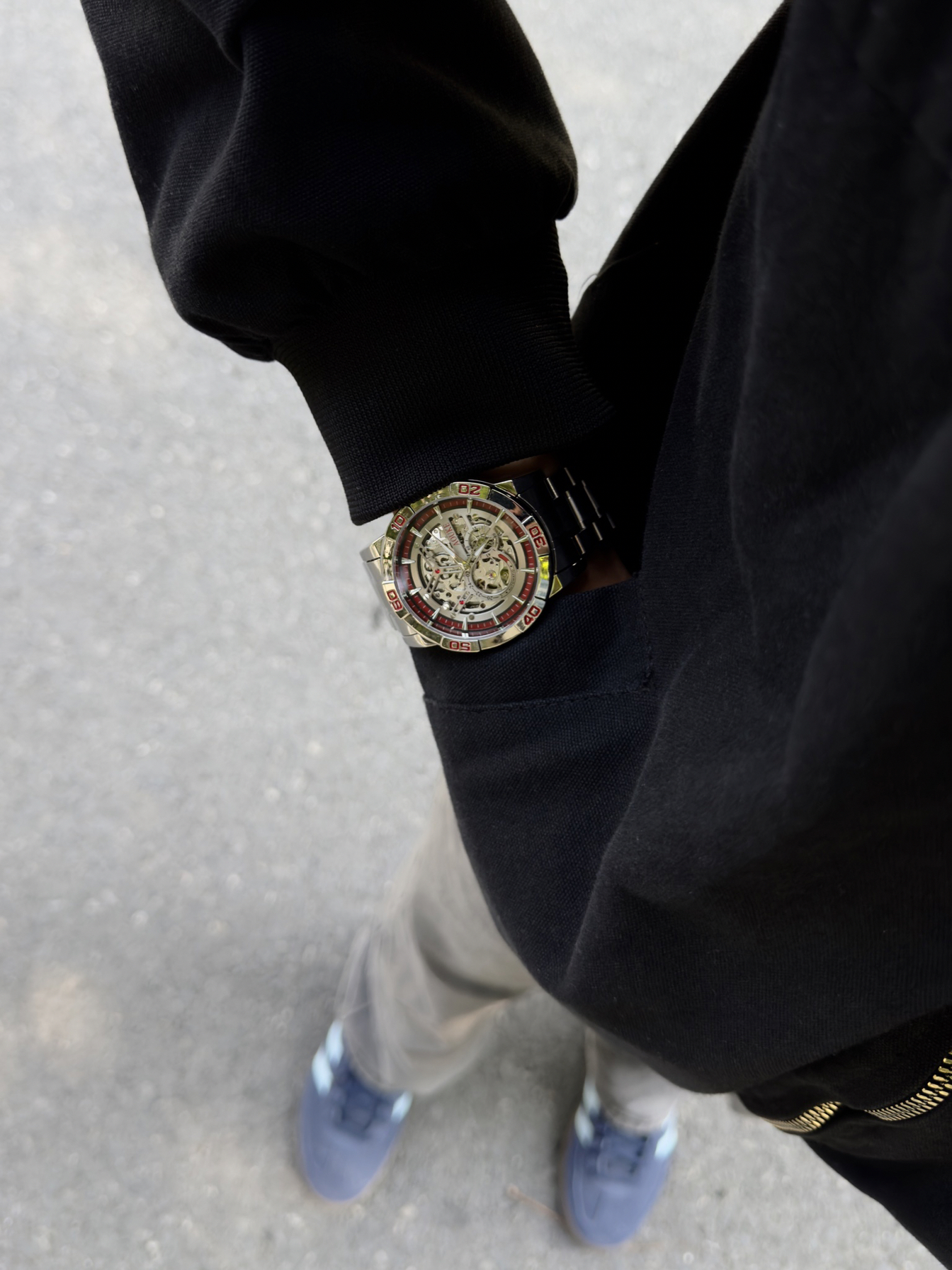 来康康我在社区挖到的机械表 做工还蛮精致的诶 在镂空设计的基础上 表圈外围还有一圈红色刻度 低调又多了一点辨识度 机械机芯的嘀嗒声听着很踏实 平时搭配运动装或者休闲的都可以