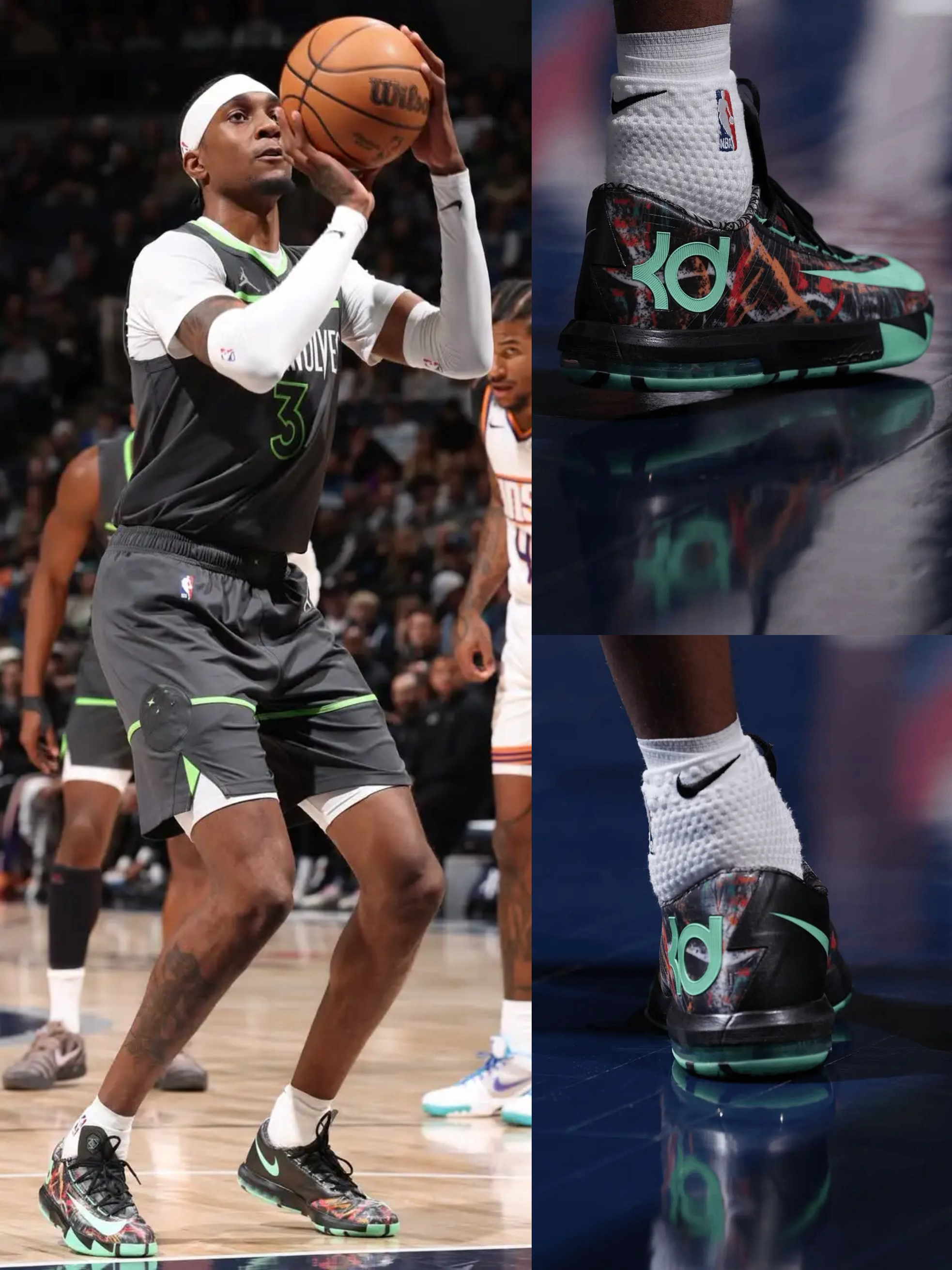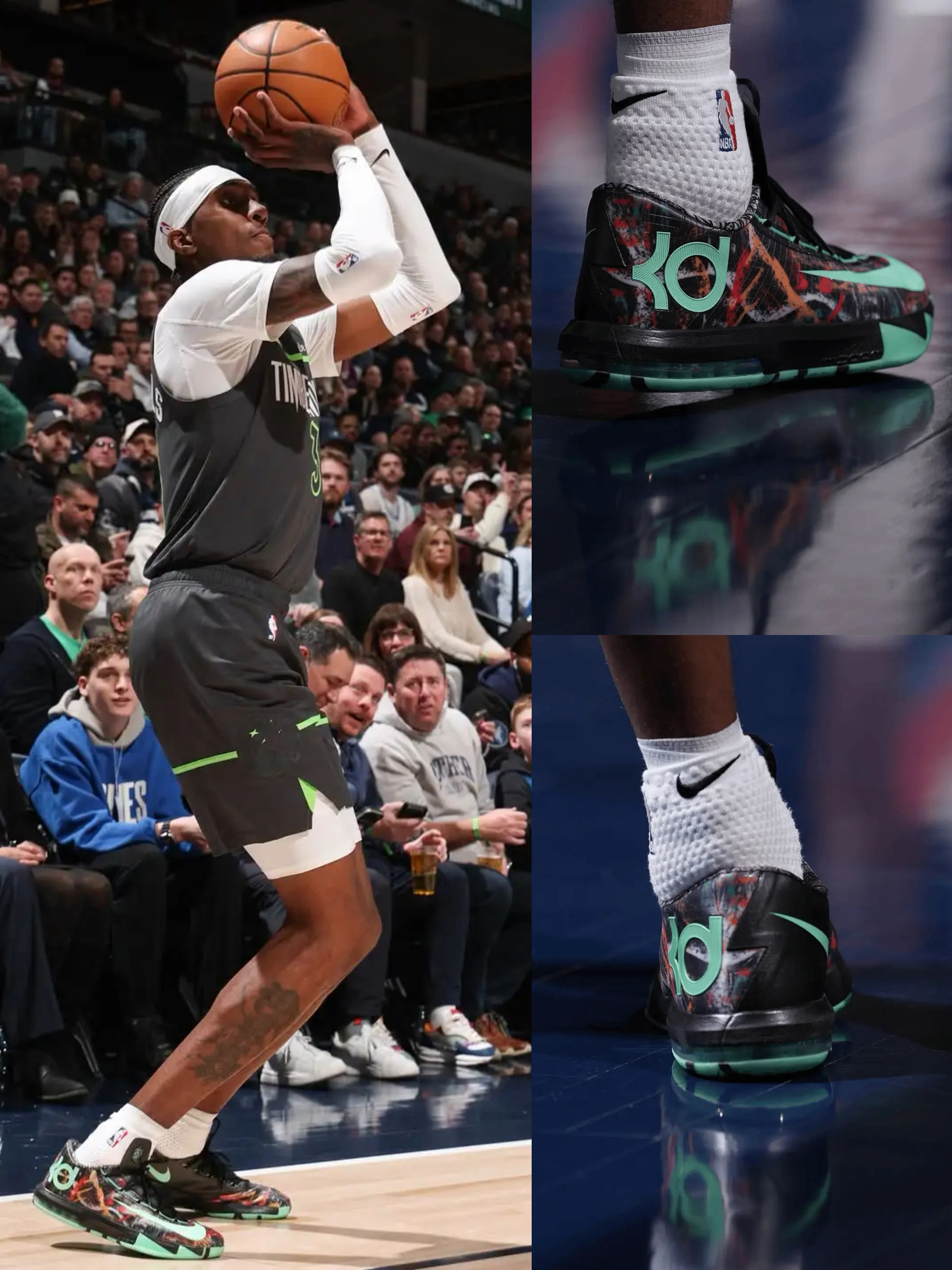 麦丹用KD6全明星梦回2014,这双鞋的彩纹+绿勾真的太有年代感了,经典就是经典,不管过多久都耐看🏀 麦克丹尼尔斯这场对战太阳的比赛中上脚的全明星配色Nike KD6 Protro“All-Star Illusion”,出战37分钟,投篮12中6,三分球3中1,罚球4中3,得到16分7篮板4助攻3抢断1盖帽
