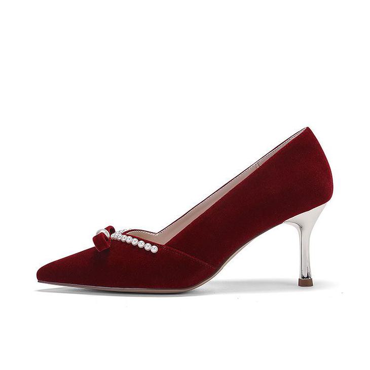 【复古丝绒珍珠婚鞋】 • 材质:甄选酒红丝绒面料,触感柔软,光泽高级,耐穿不易皱 • 设计:经典尖头版型,修饰脚型显修长;珍珠蝴蝶结+珠链装饰,精致减龄,自带氛围感 • 跟高:多跟高可选(平底/低跟/中跟),满足不同场景需求,久穿不累脚 • 适配:婚礼(秀禾/婚纱/敬酒服)、日常通勤、约会聚会,一鞋多穿,性价比拉满 • 尺码:全尺码覆盖,大码友好,孕妇也能舒适穿着