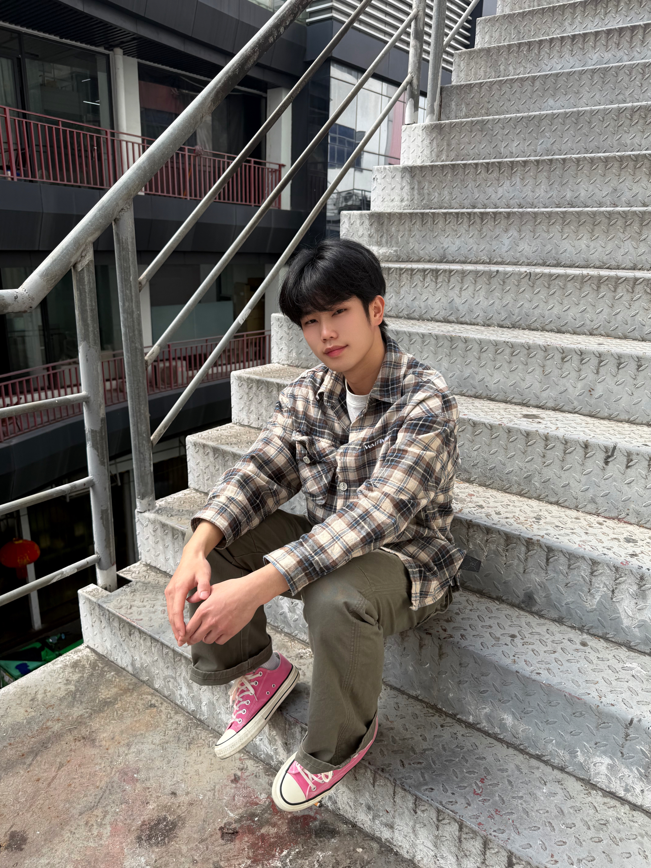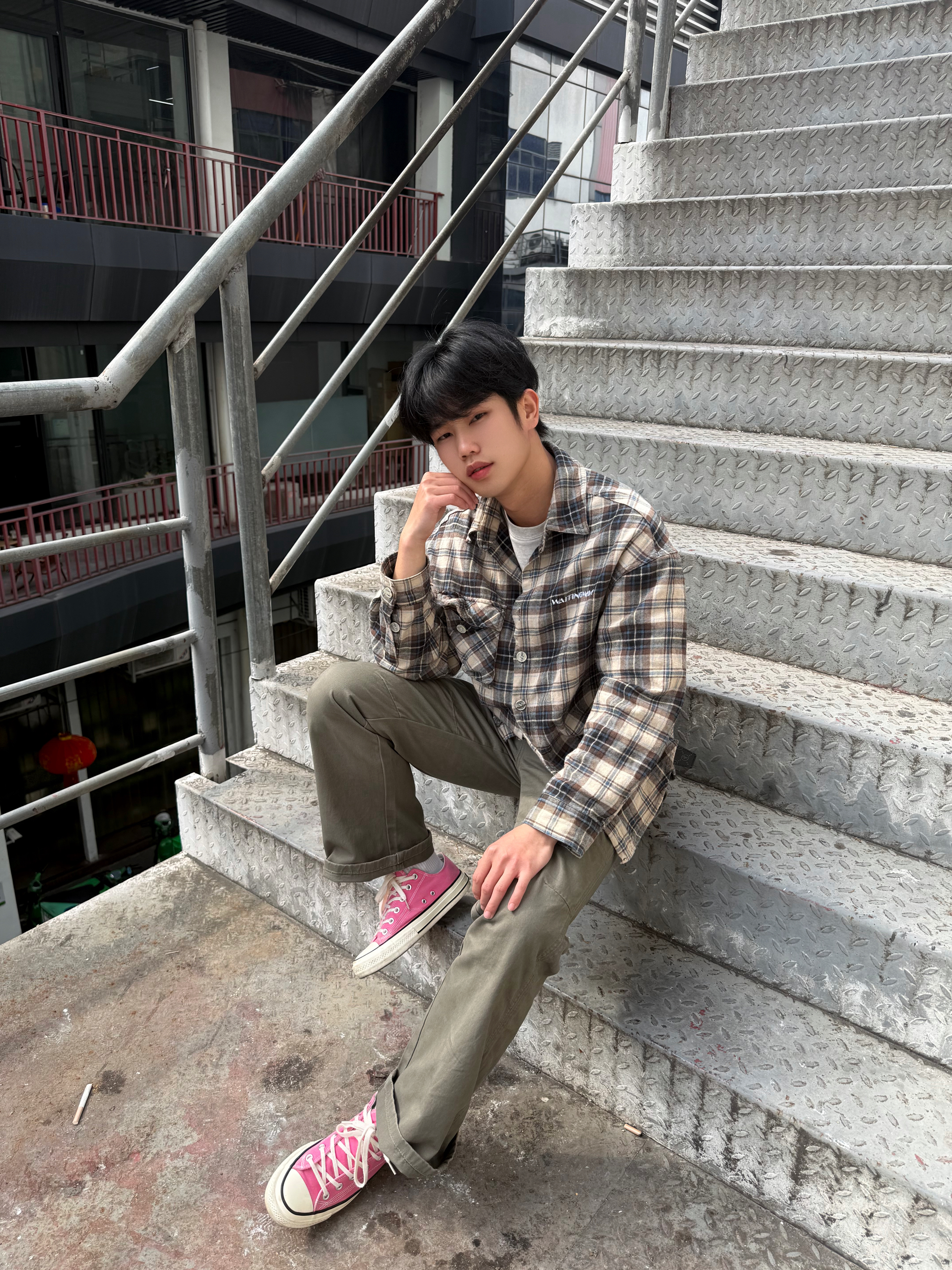 楼梯间也能出片! 格纹衬衫+军绿色工装裤,慵懒感拉满🪨 粉色鞋子是灵魂,甜酷平衡得刚刚好, 随便一坐就是随性街头感,舒服又好搭~