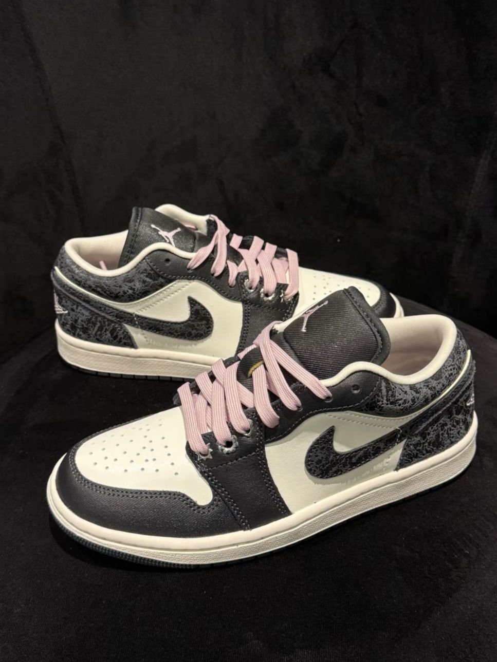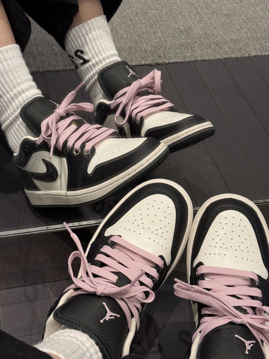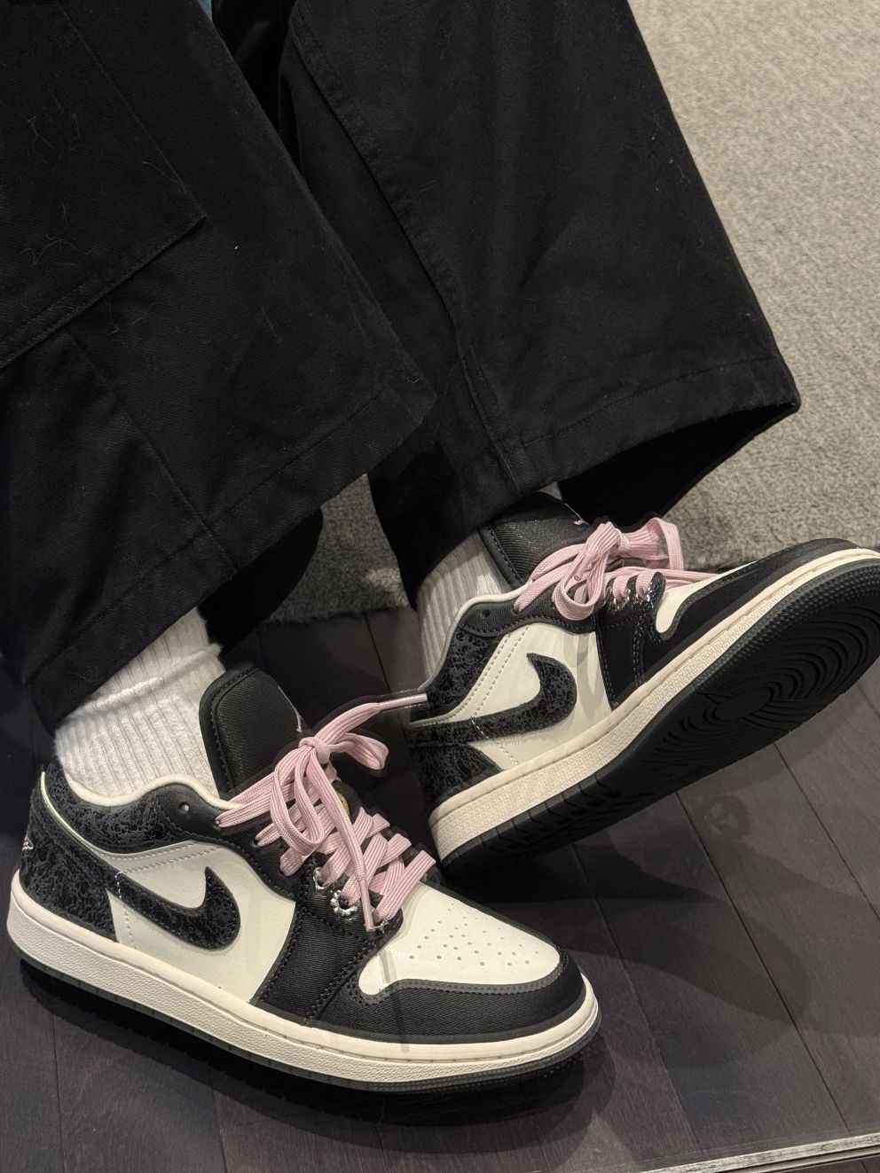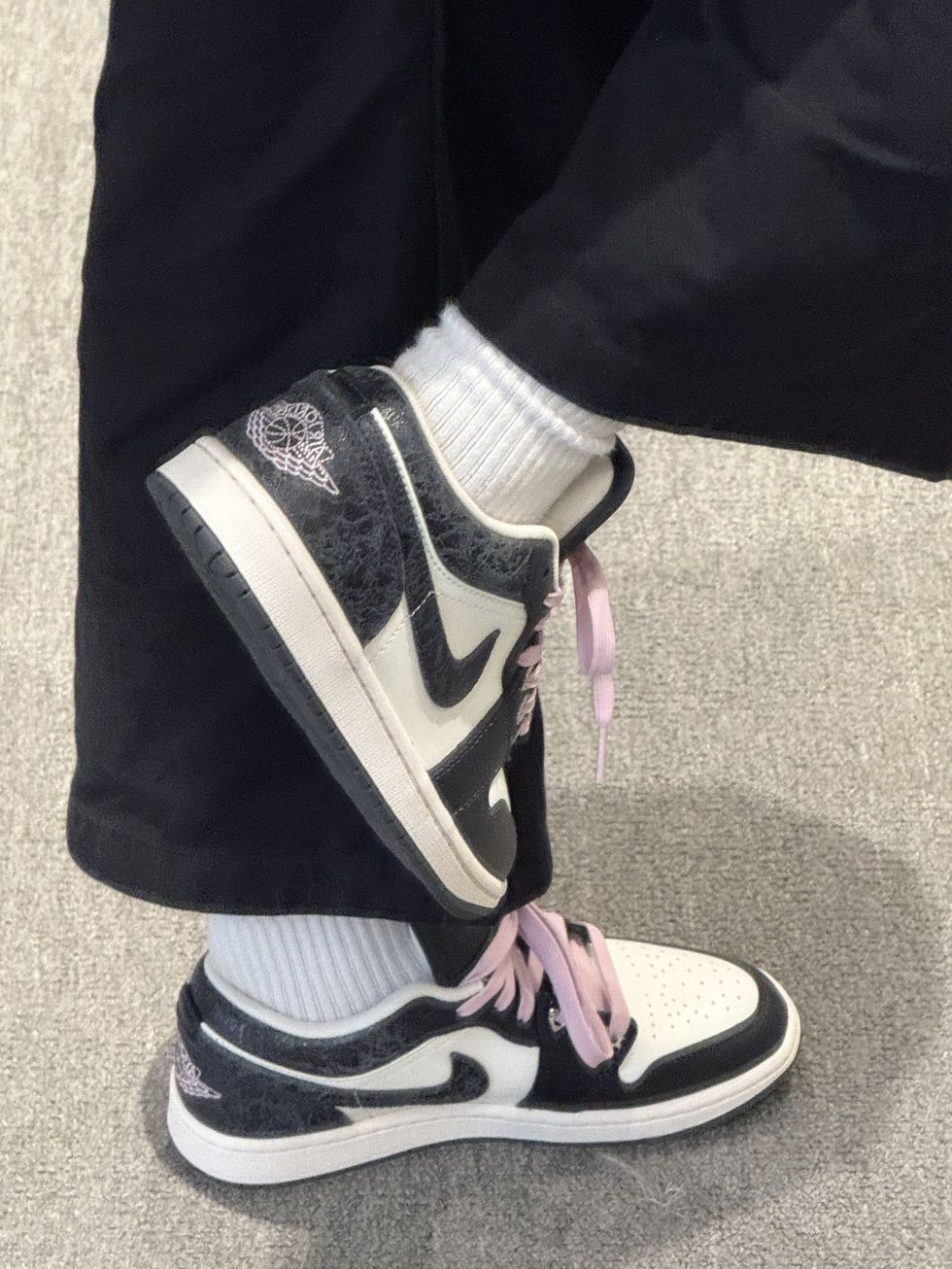 终于挖到这双宝藏AJ1了!黑白撞色本来就很经典,加上软乎乎的粉色鞋带,一下子就从“拽姐鞋”变成了“甜妹也能驾驭”的款。 爆裂纹的钩子细节很有质感,鞋型也刚好修饰脚型,显脚细又不笨重。春天搭卫衣、夏天配T恤、秋天叠穿外套都很合适,感觉能从现在穿到秋天,懒人穿搭真的离不开它!