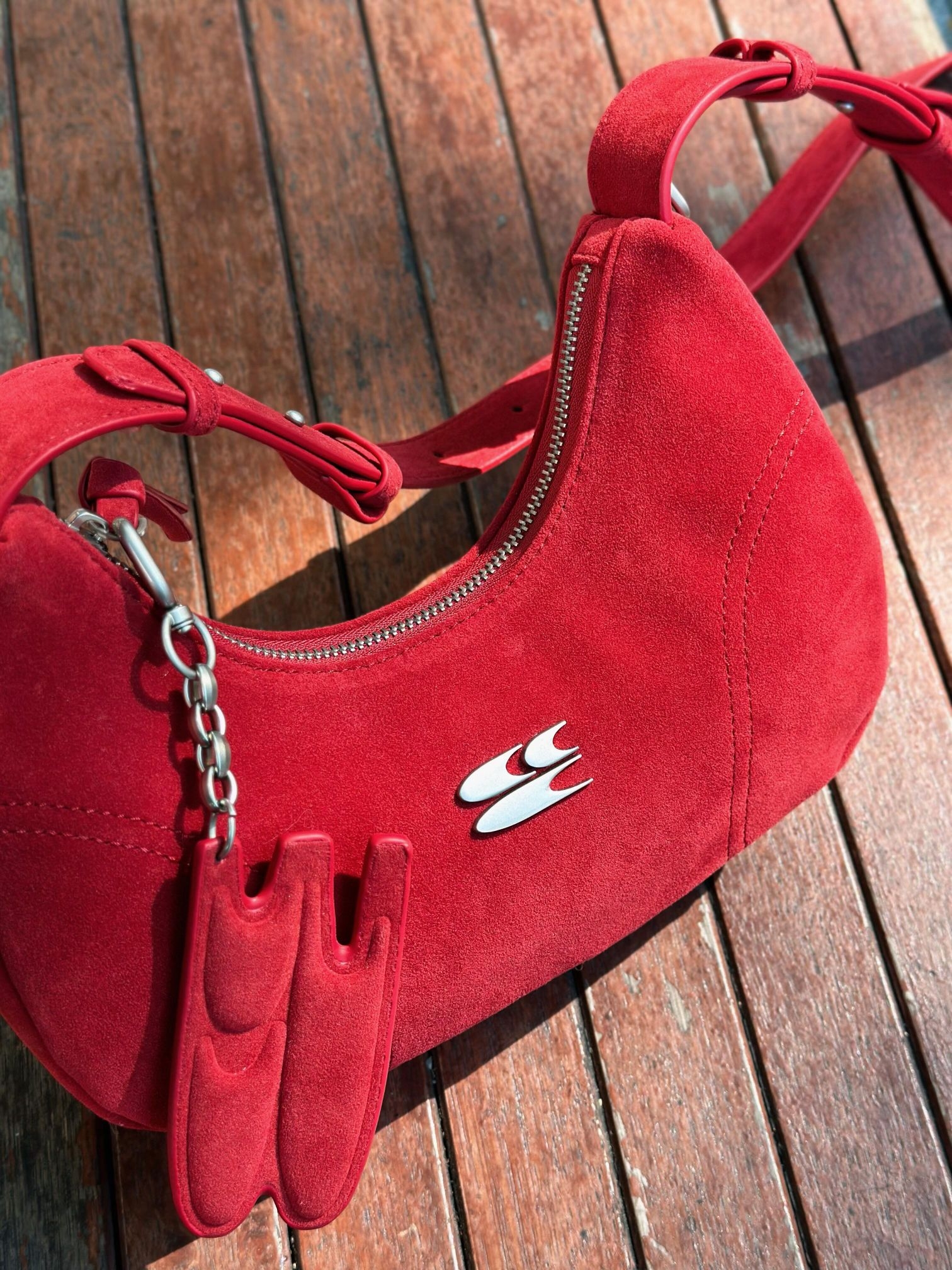 柔软仿绒材质,触感超舒适!机车风设计+金属链条和火焰徽章,个性十足✨。肩带可调节,支持斜挎/单肩,日常通勤、休闲出街都很百搭。包包尺寸适中,手机卡包轻松收纳,实用又时髦!红色超亮眼,秋冬穿搭必备,轻松提升造型感💃。