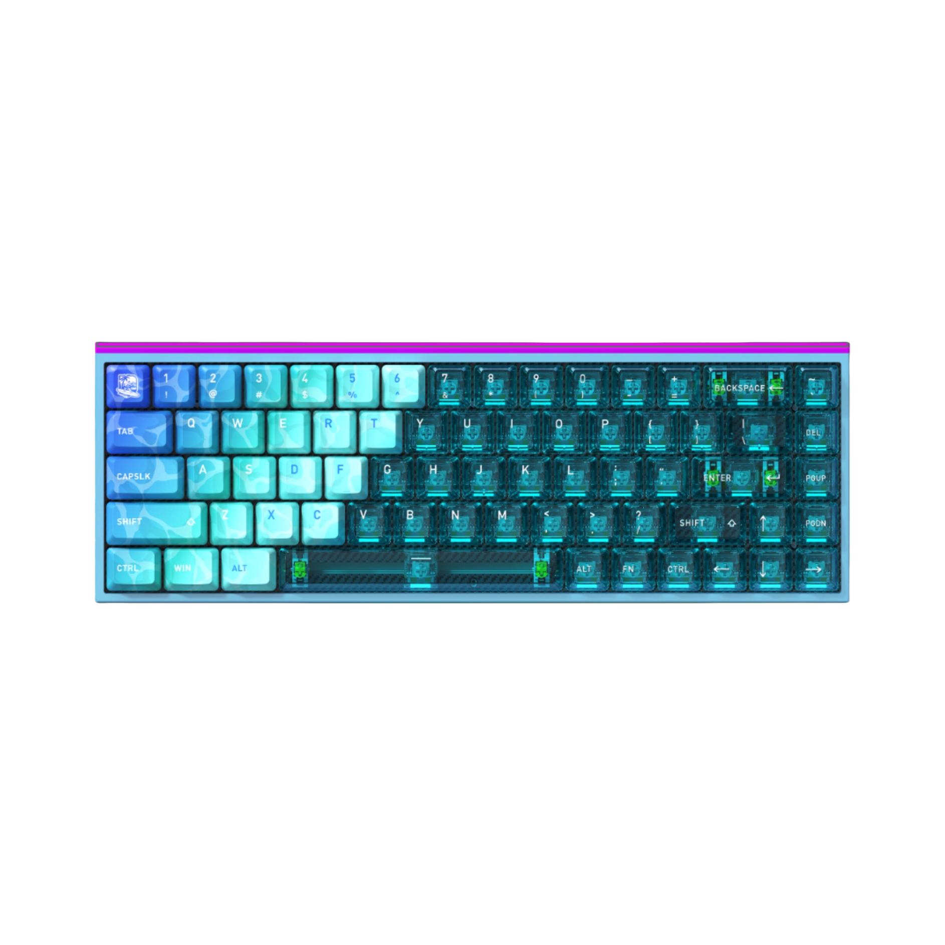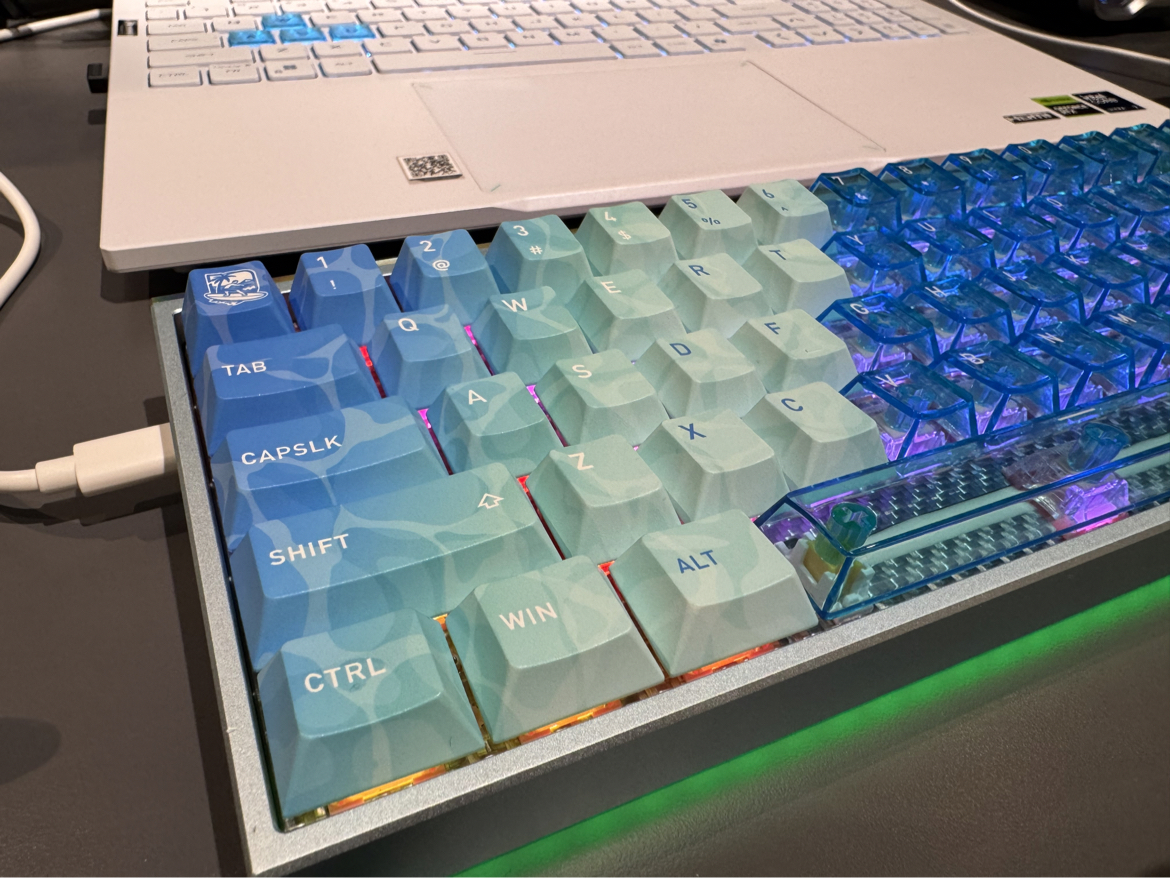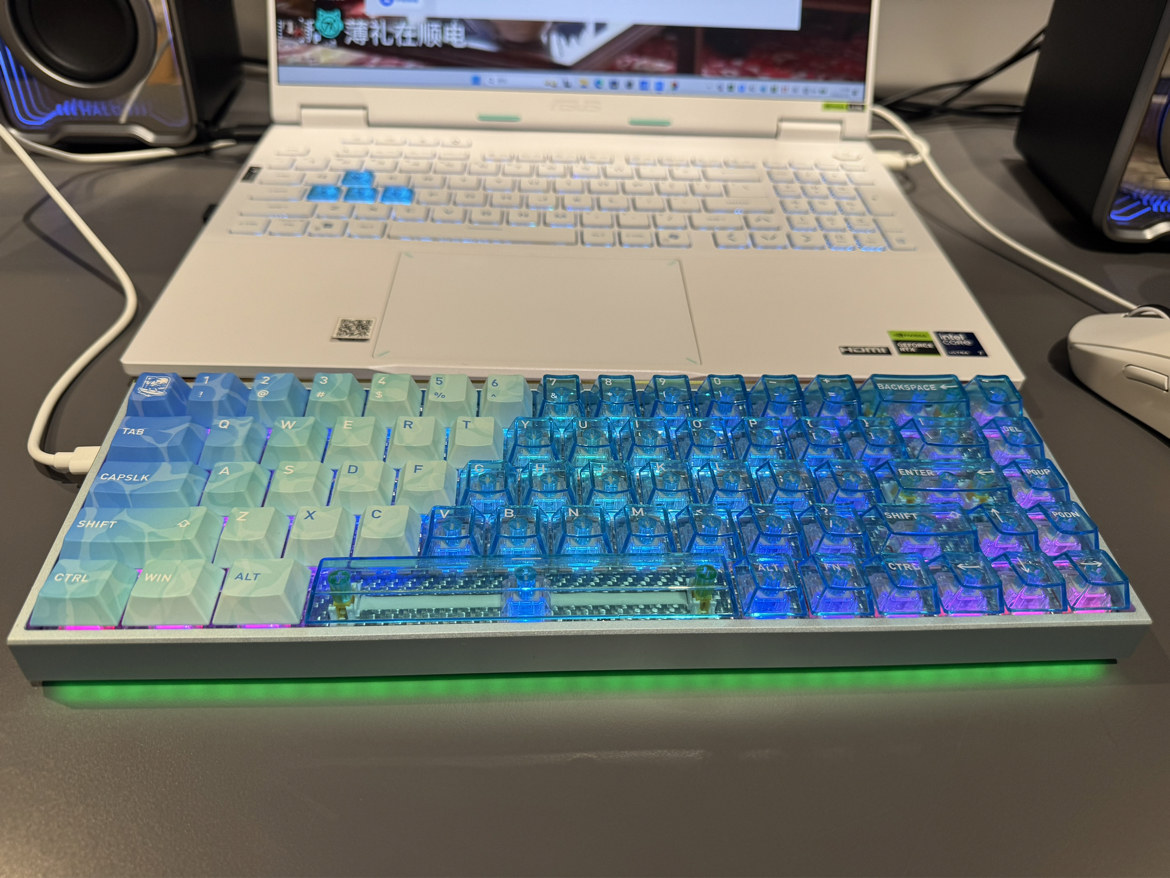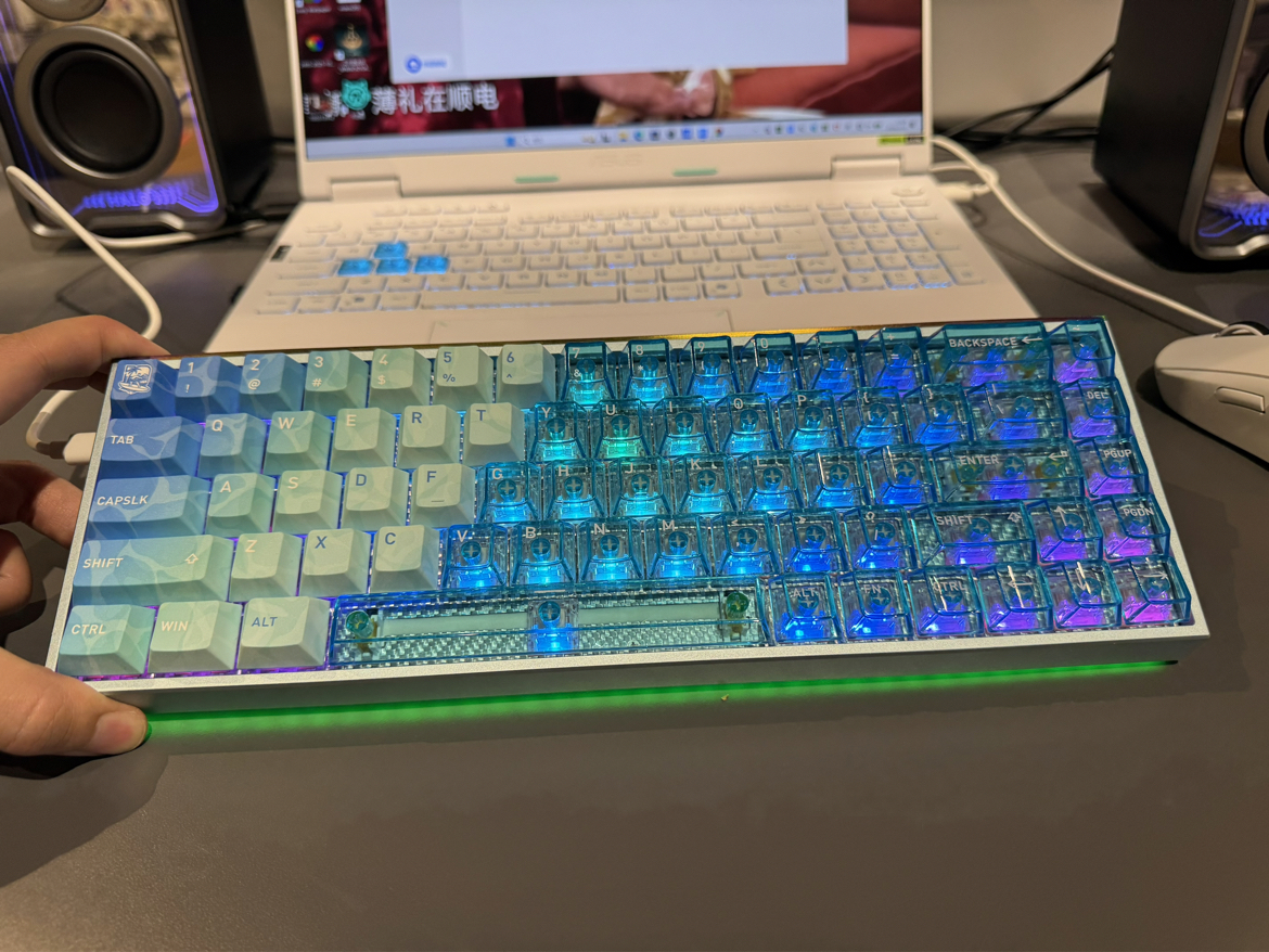 之前一直用的都是塑料键盘,第一次入手铝坨坨 不得不说MAG68的夏日配色上手的那一刻,我还是被这金属质感惊艳到了 全CNC铝合金机身沉甸甸的1.47kg,220目阳极氧化带来的细腻触感,蓝紫渐变冰晶配重在光线下流转的光泽 让我这个理工男有点爱不释手的感觉 PBT热升华+高透PC键帽透光性极佳, 还有底部跑车霓虹灯带,有点GTA晚上的感觉 机身没有任何塑料感,边角处理圆润,做工细节对得起“铝坨坨”...