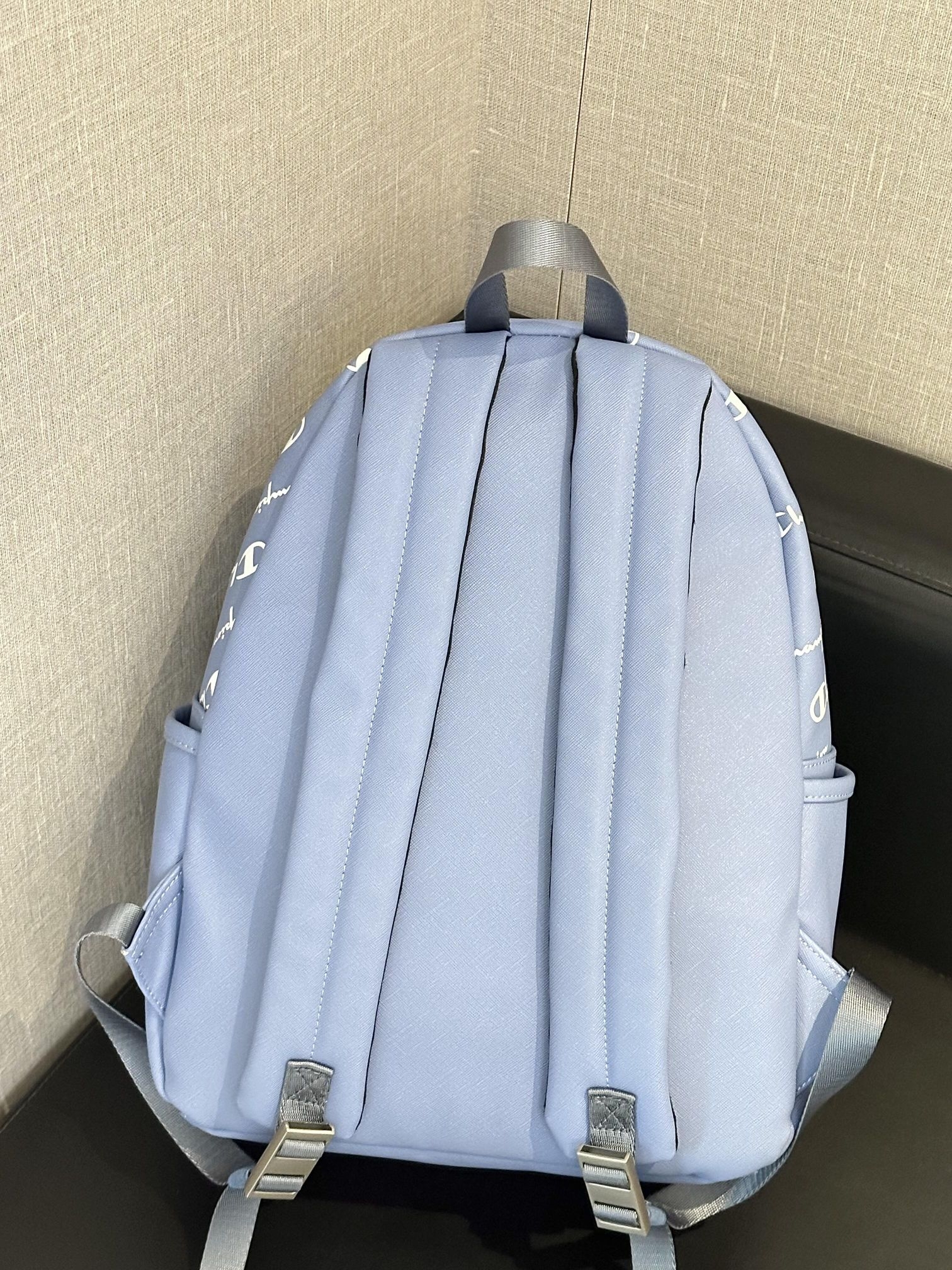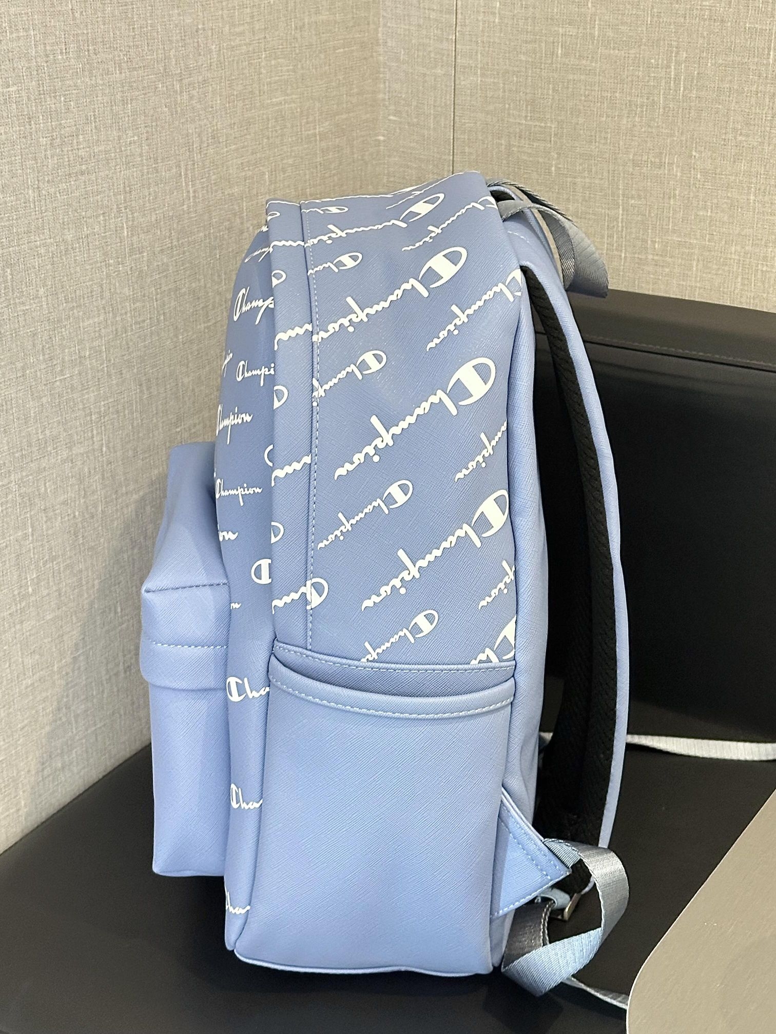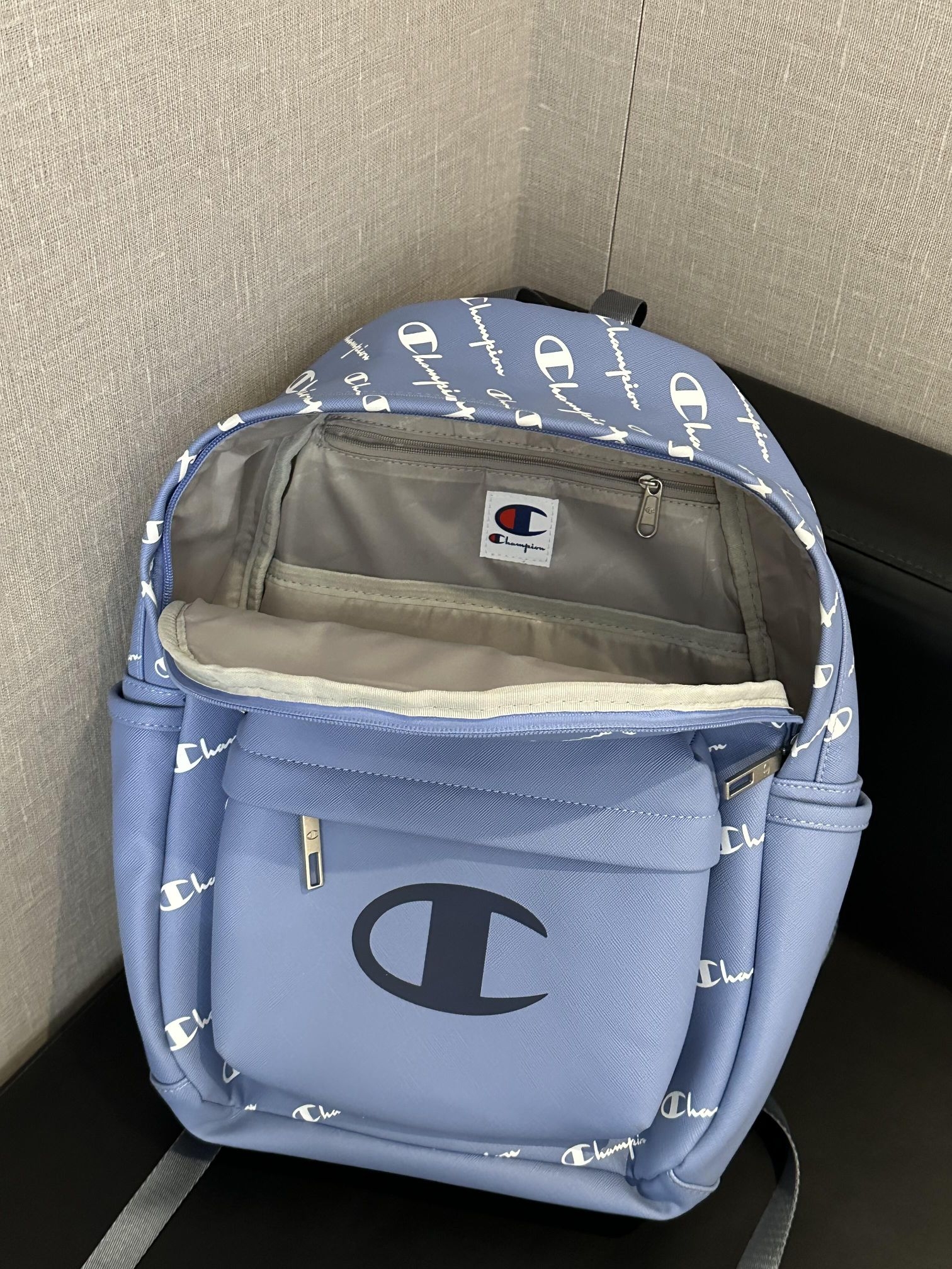 💙CHAMPION Monogram双肩包,浅蓝包身+白色logo印花,辨识度超高!正面大C标志超有型,聚酯纤维材质轻便耐用,日常通勤、校园、休闲都OK✨。内部空间合理,主仓+前拉链副袋,收纳超方便。肩带可调节,背起来很舒服,王俊凯同款,粉丝必入!
