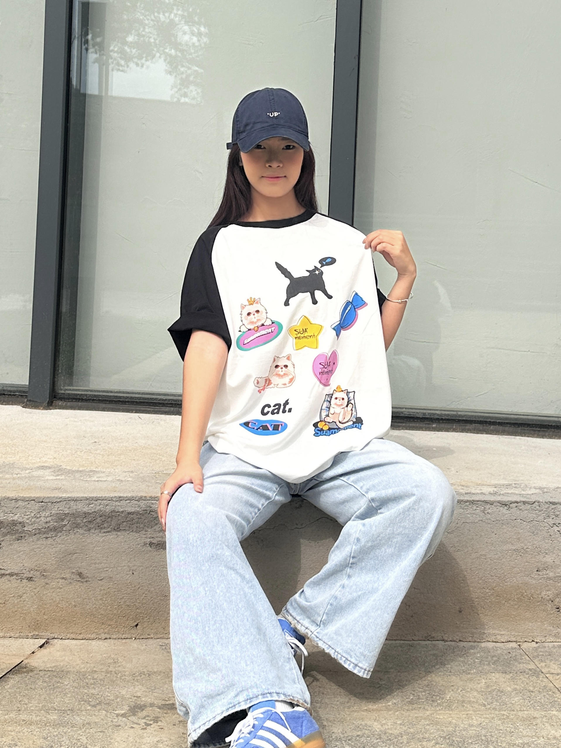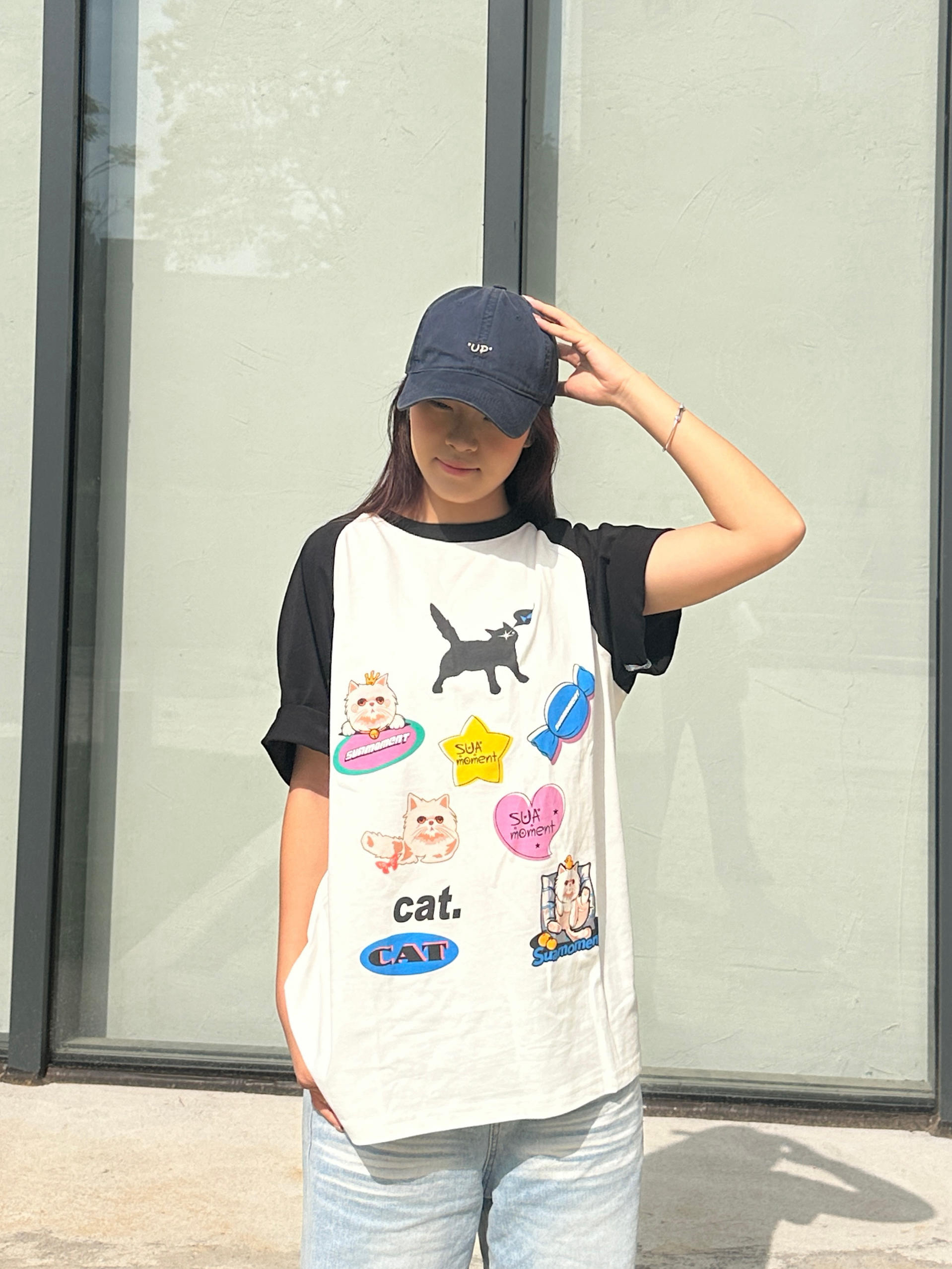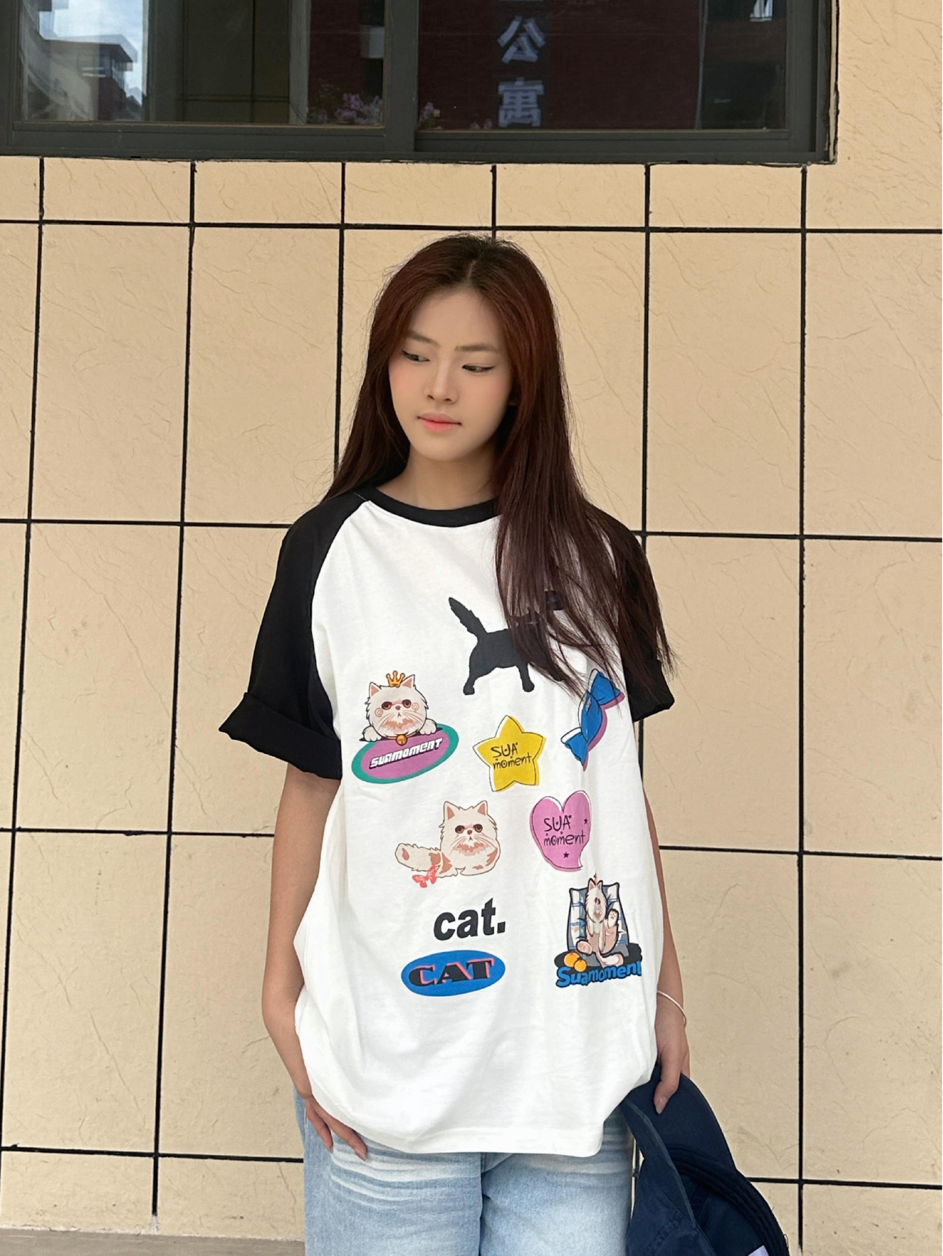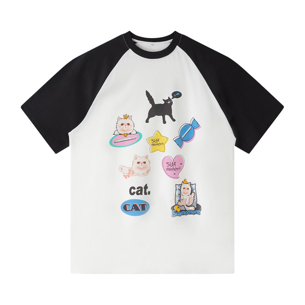 我身高168cm,穿M码刚好盖过胯,宽松版型对各种身材都很友好,小个子也能轻松驾驭。 Suamoment这件插肩袖T恤用了纯棉面料,亲肤透气,夏天穿不会闷。 黑白撞色插肩设计+猫咪印花,风格简单耐看,日常又减龄。 平时搭牛仔裤、运动裤都很合适,单穿或者和对象搭情侣装都好看,休闲日常,学生党和通勤穿都很合适。
