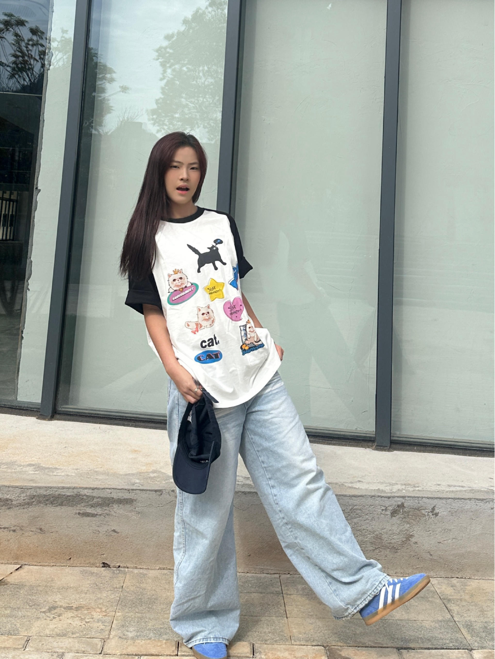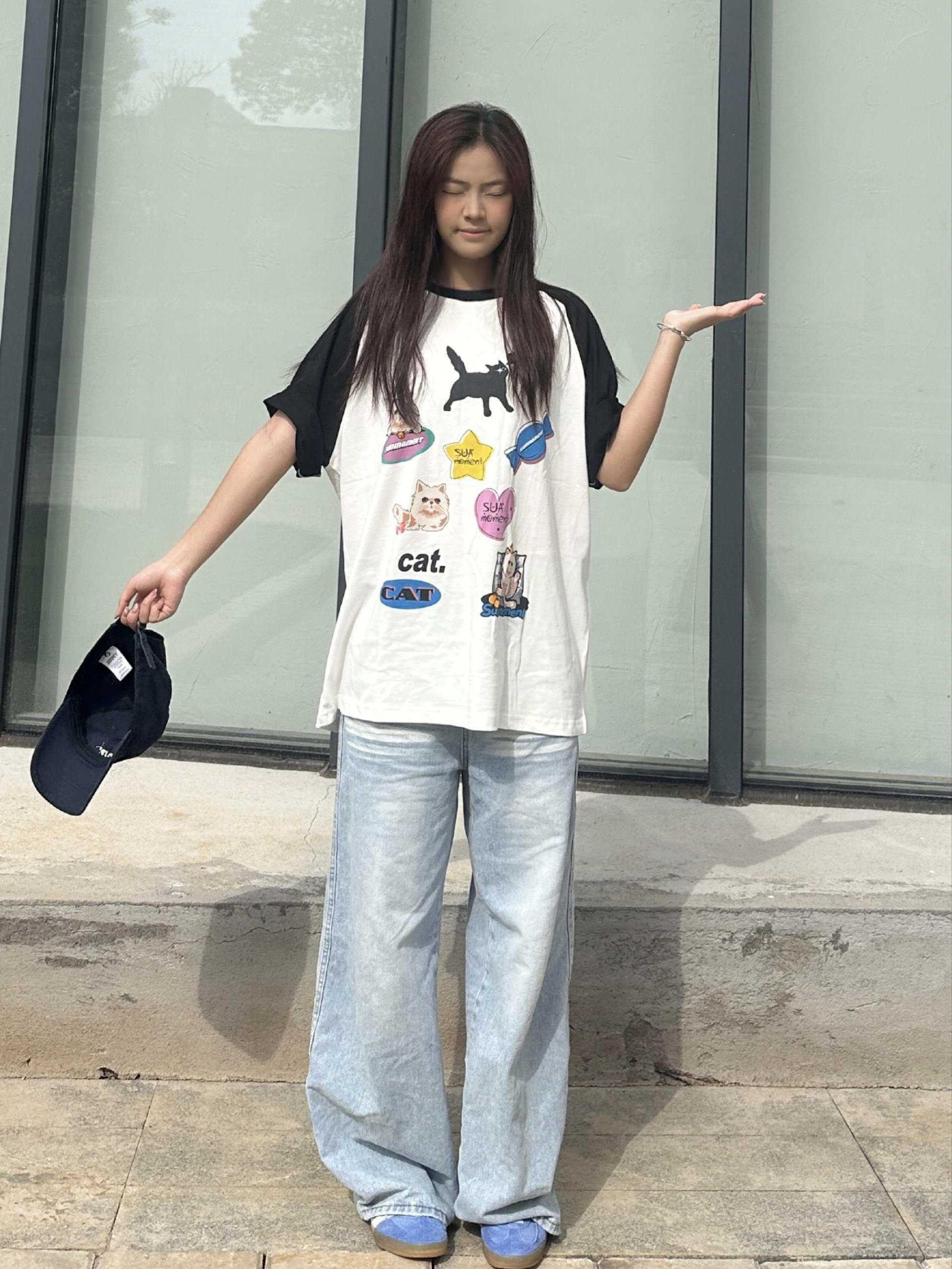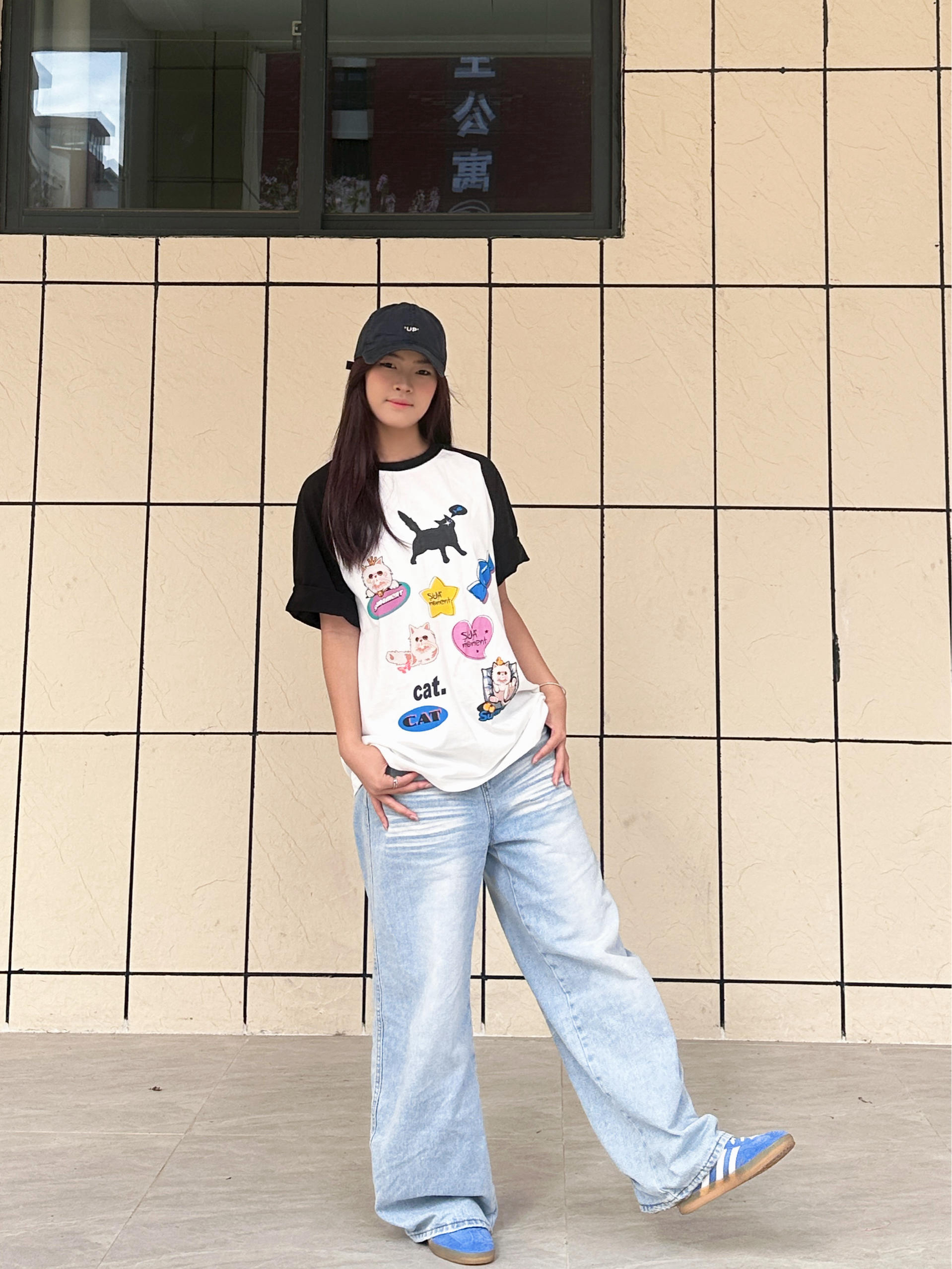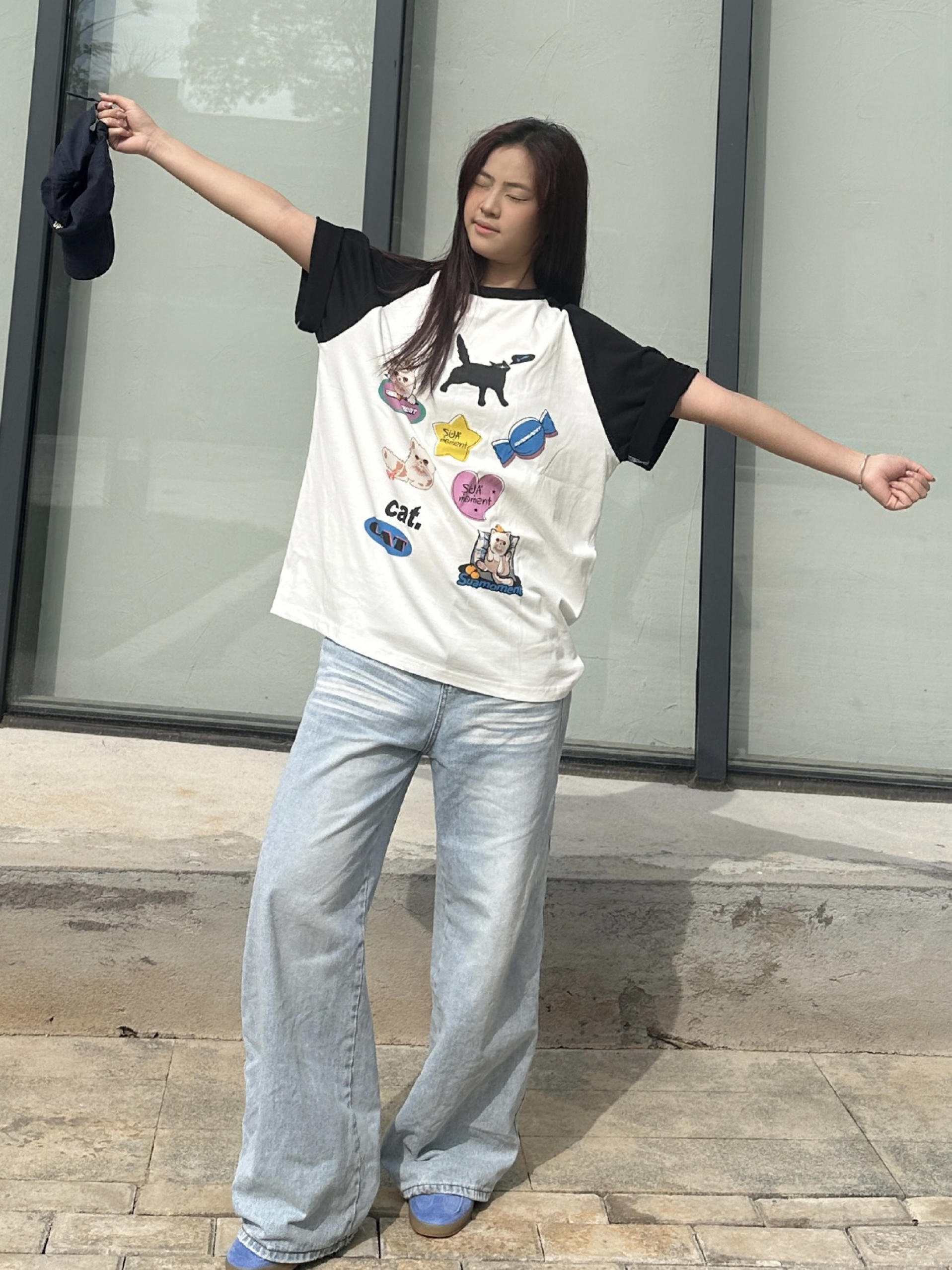 我身高168cm,穿M码刚好盖过胯,宽松版型对各种身材都很友好,小个子也能轻松驾驭。 Suamoment这件插肩袖T恤用了纯棉面料,亲肤透气,夏天穿不会闷。 黑白撞色插肩设计+猫咪印花,风格简单耐看,日常又减龄。 平时搭牛仔裤、运动裤都很合适,单穿或者和对象搭情侣装都好看,休闲日常,学生党和通勤穿都很合适。