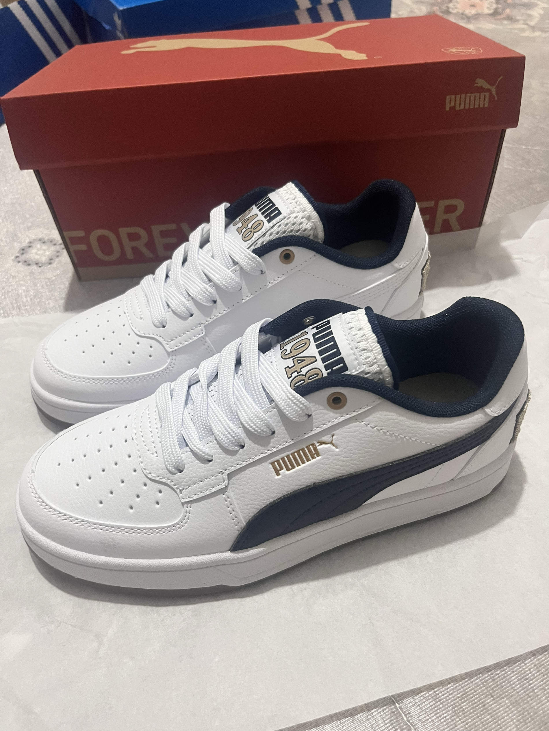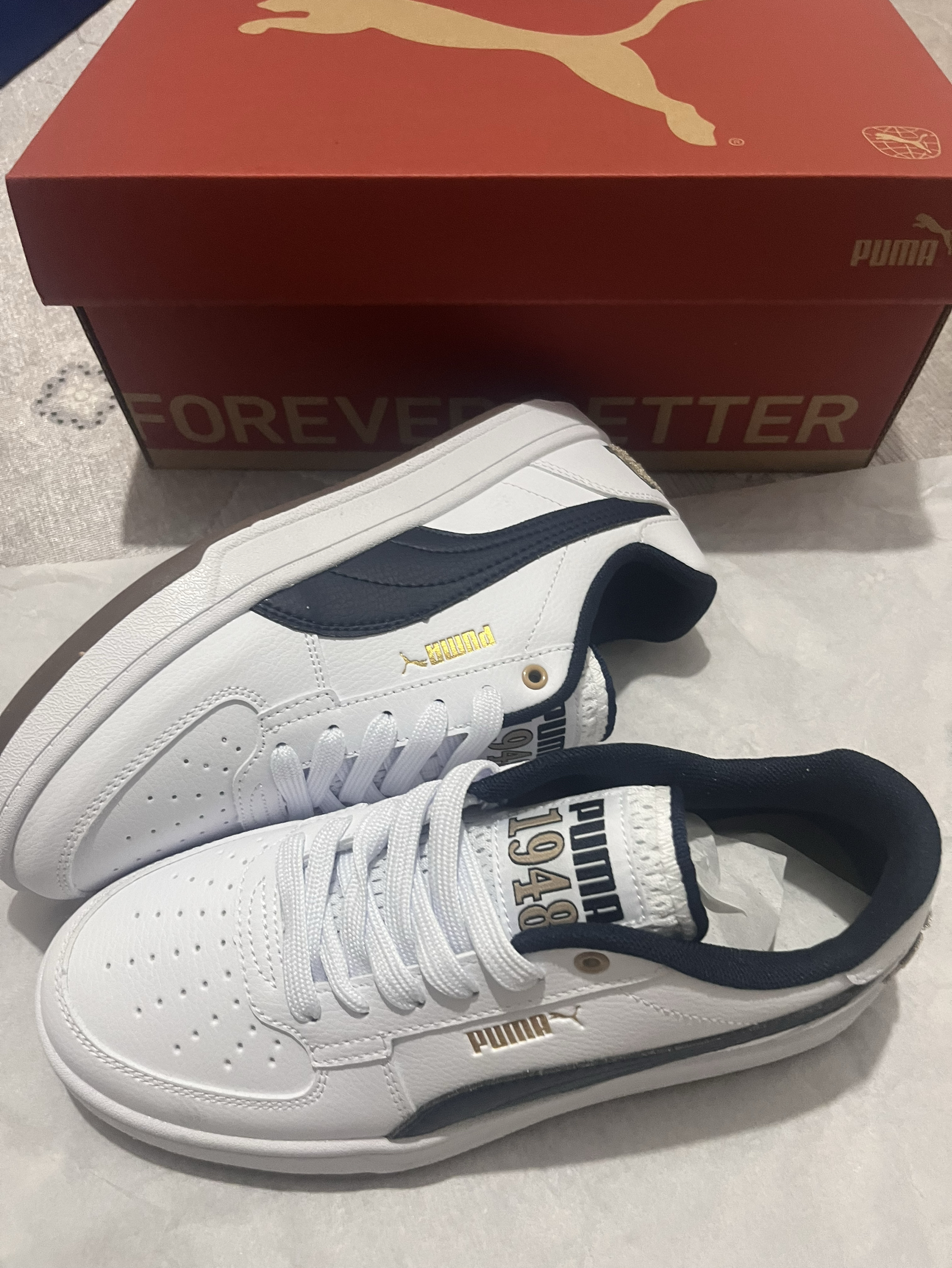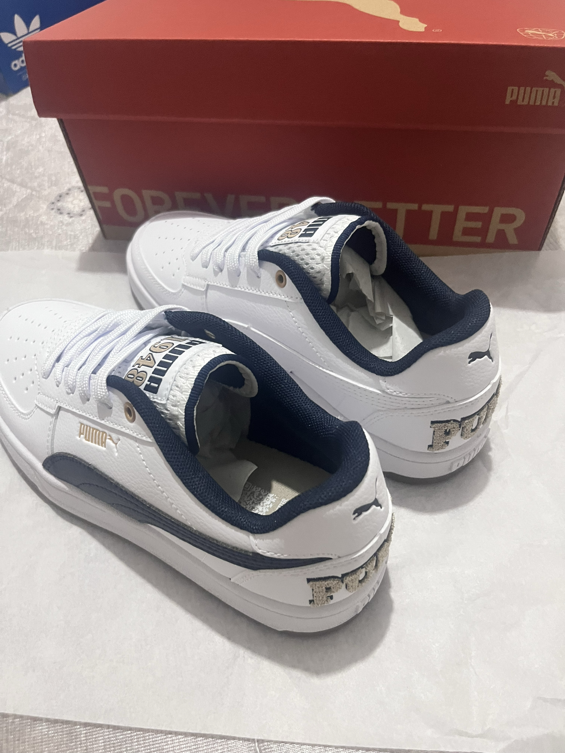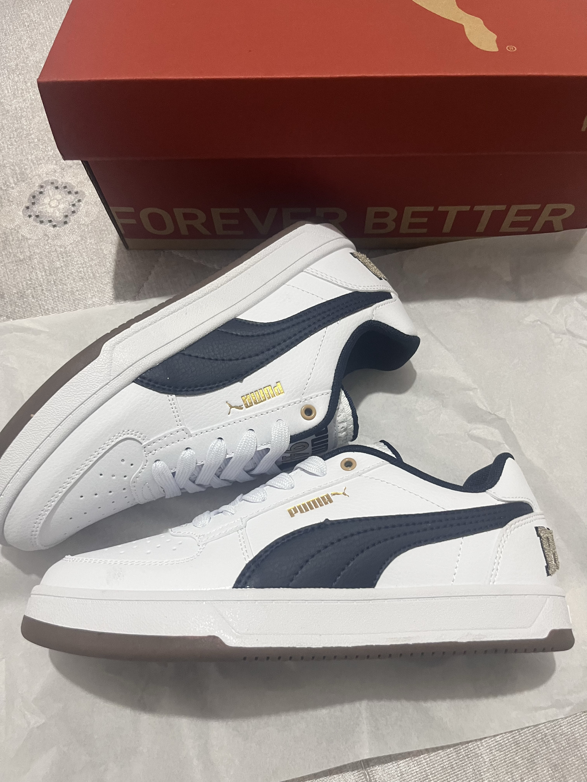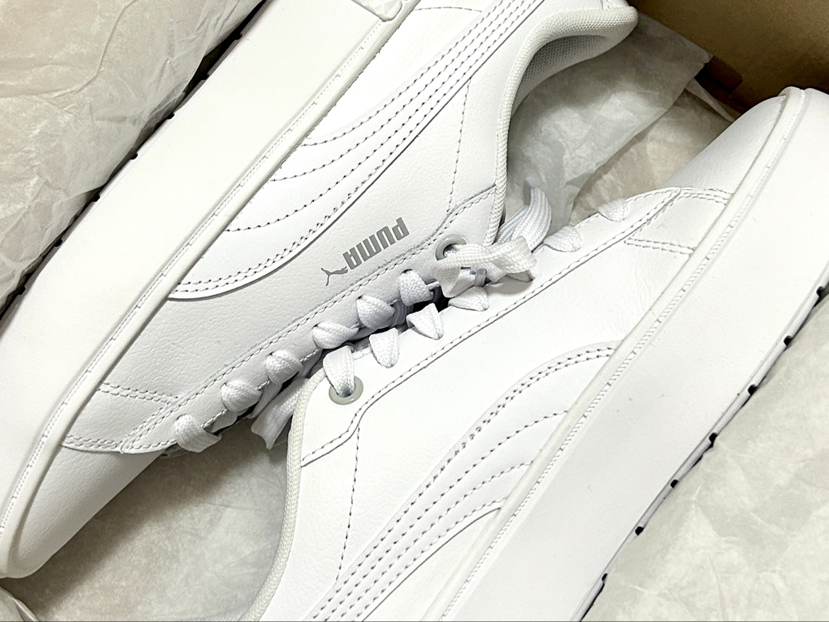 刚拿到就忍不住来分享啦🥳 作为学生党 买鞋真的只看三点:耐造、好看、性价比 这双彪马板鞋直接把我拿捏住! 全白鞋身配藏蓝后跟+金色小细节 简约又不单调 搭校服、牛仔裤都超适配,低调又有质感✨ 鞋底是那种偏硬的橡胶材质 重点是百元出头的价格 学生党完全无压力 鞋身看着挺有分量,但上脚轻得很